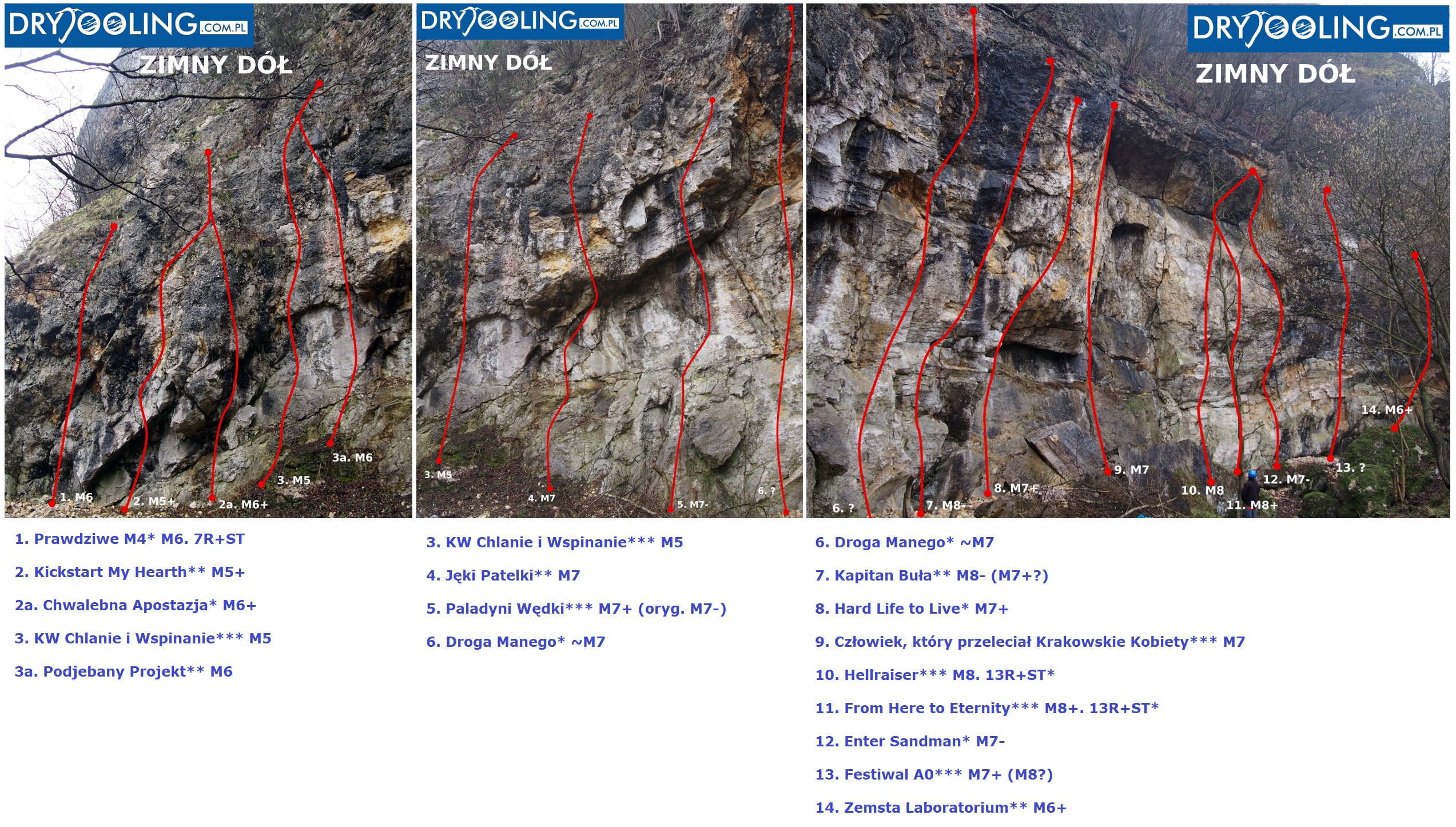 Ciekawy sektor drytoolowy w okolicach Krakowa, oferujący ok. 16 linii w przedziale trudności od M5 do M8+. O łatwą cyfrę raczej ciężko, jest to jednak świetny poligon treningowy pod kątem wspinania w górach – mamy sporo rys, krawądek, czujnych połogów, zacięć i okapików. Załączam zdjęcia (zrobione podczas różnych wizyt) z wybranych dróg, mapkę oraz zbiorcze topo z Drytoolingu - tam też znajdziecie więcej informacji o regionie. Do M7+ polecam KW Chlanie i Wspinanie (przyjemne M5), Paladyni Wędki (świetne, ok. M7), Człowiek który przeleciał Krakowskie Kobiety (ciągowe, M7) i Kapitan Buła (zróżnicowane, ok. M7+/M8-).
