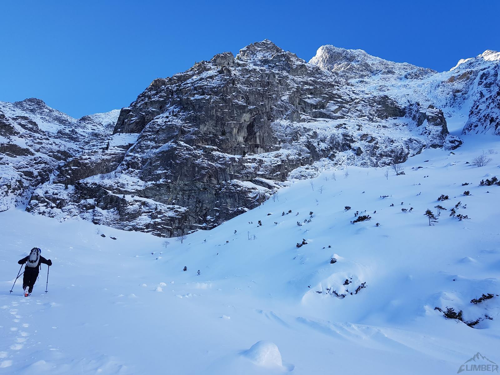 Mimo świeżego opadu pakujemy się na dwa dni do Moka. Podejście pod Czołówkę weryfikuje nasze plany, zakładamy ślad i długo kopiemy się pod ścianę, która wygląda bardzo kiepsko - płyty, rysy i trawy zalepione są twardą śniegową skorupą zakrywającą chwyty. Plan na kolejny dzień od razu odpada, skoro jednak już jesteśmy pod ścianą, decydujemy się na wspinanie - licząc się z konsekwencjami i ewentualnym wycofem. Wybrany przez nas Prawy Dziadek (letnie VI+, zimą wyceniany kiedyś na M7, obecnie ok. M6+) na papierze prezentuje się w miarę przystępnie porównując do robionego przez nas rok temu Szarego Zacięcia czy Starka, letnie wyceny są jednak złudne, szczególnie przy złych warunkach – dlatego też na drodze spędzimy sporo czasu i łatwo nie będzie.
