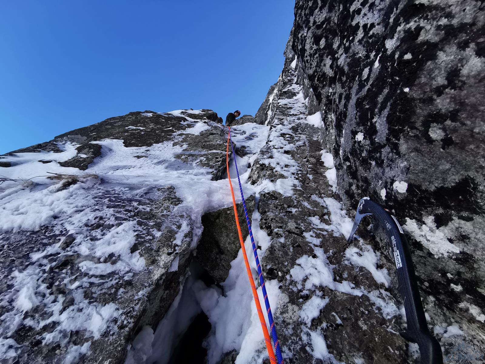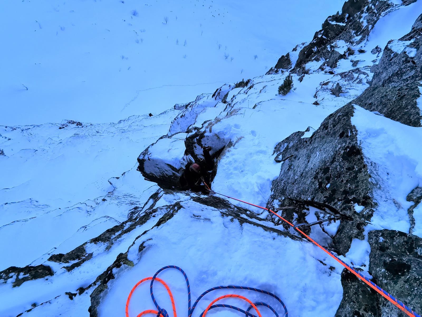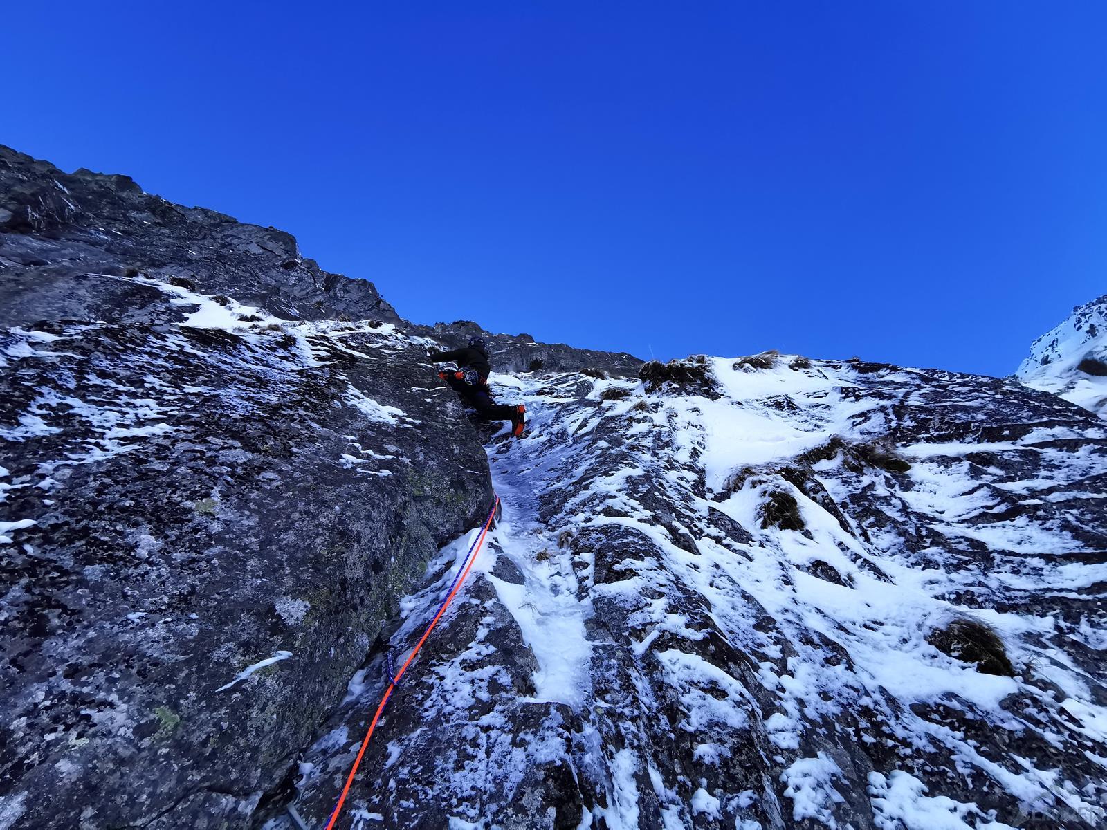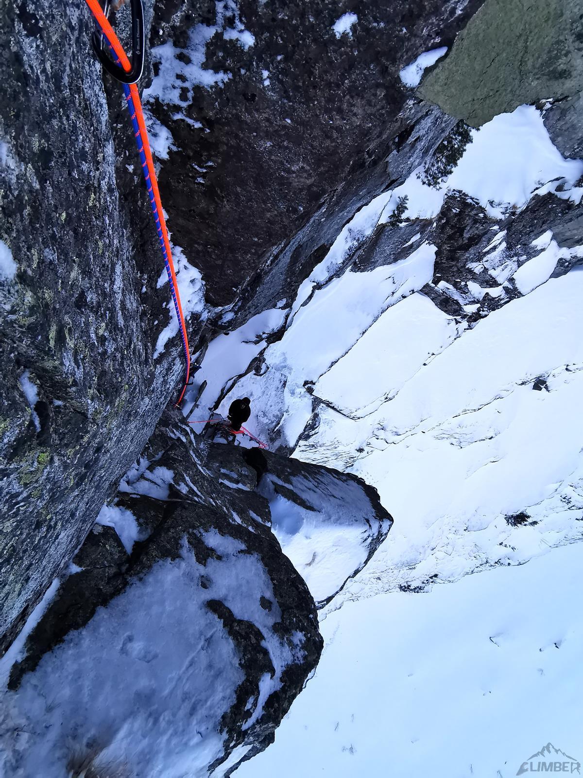 Kluczowy wyciąg rozpoczyna się przewieszającym komino-zacięciem (letnie VI+, zimą ok. M6+), oferującym dość dobre chwyty ale słabsze miejscami stopnie, asekuracja na starcie z 2 haków, potem już własna (bardzo dobra). Po urwaniu jednego z chwytów odcinek muszę powtarzać – druga próba kończy się już powodzeniem choć nie ukrywam, że akrobacje na wyjściu z zacięcia kosztowały mnie sporo sił. Powyżej mamy restową półkę i jeszcze jeden krótki ale sprężny skalny odcinek (M5+), nad którym znajduje się stanowisko (ok. 30 metrów, haki). Z tego miejsca ruszamy zacięciem skośnie w lewo (ok. M5) i wychodzimy w trawy – do końca drogi pozostaje nam ostatnie skalne spiętrzenie, które pokonać można na kilka sposobów. Początkowo przymierzam się do kominka po lewej (latem IV, zimą krótki fragment ok. M6 – końcówka Prawy do Lewego), w końcu jednak podchodzę pod ściankę po prawej. Spodziewając się trudności i nie będąc pewnym czy to właściwy wariant (latem V-, zimą ?), ściągam w to miejsce kolegę – nad półką jest hak.