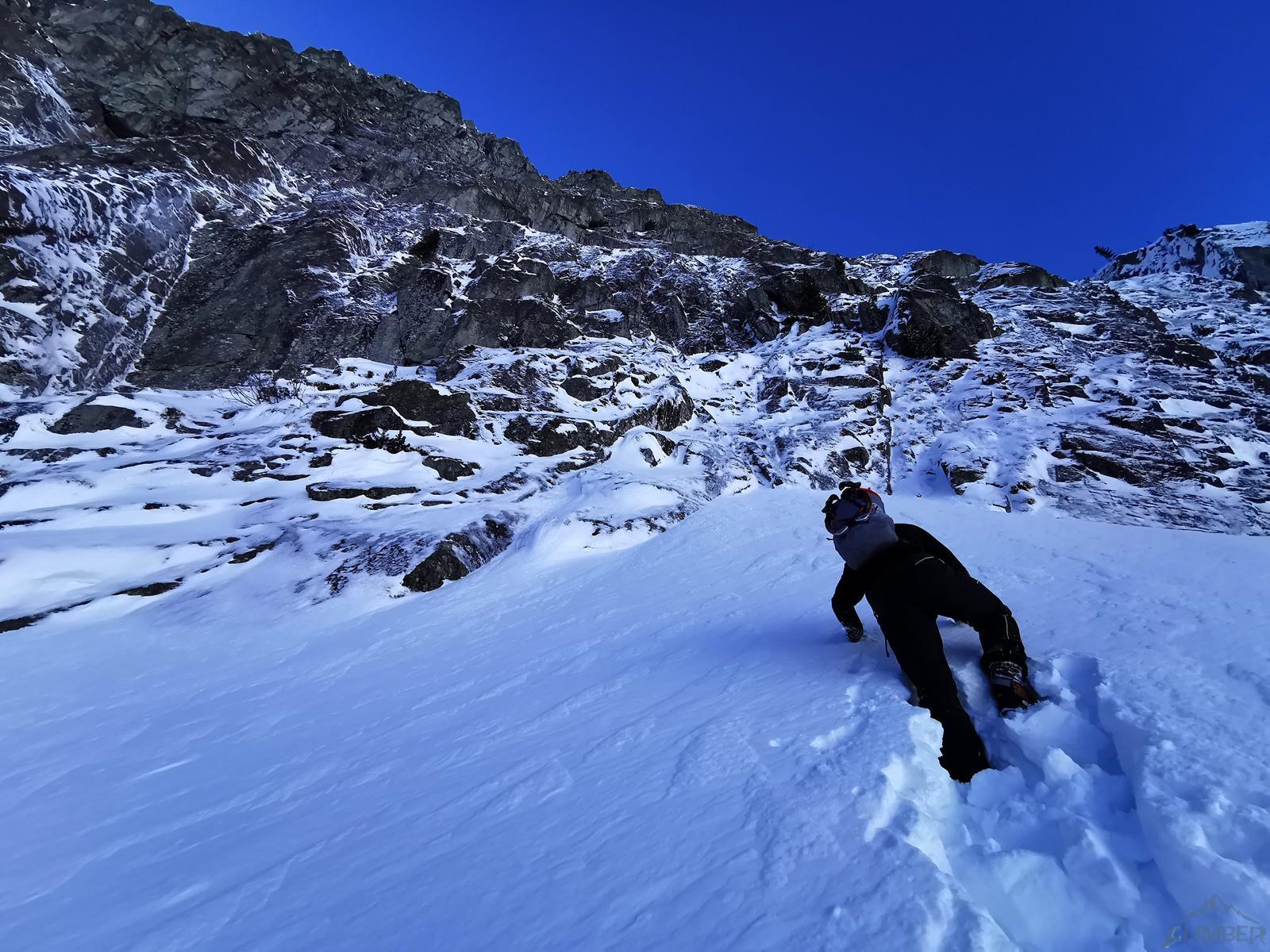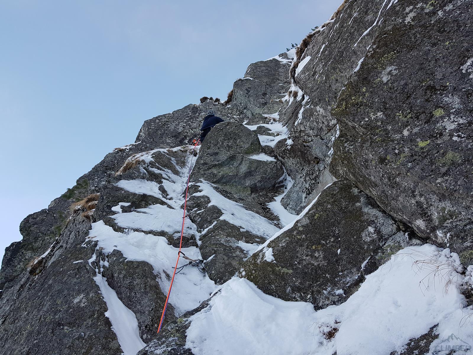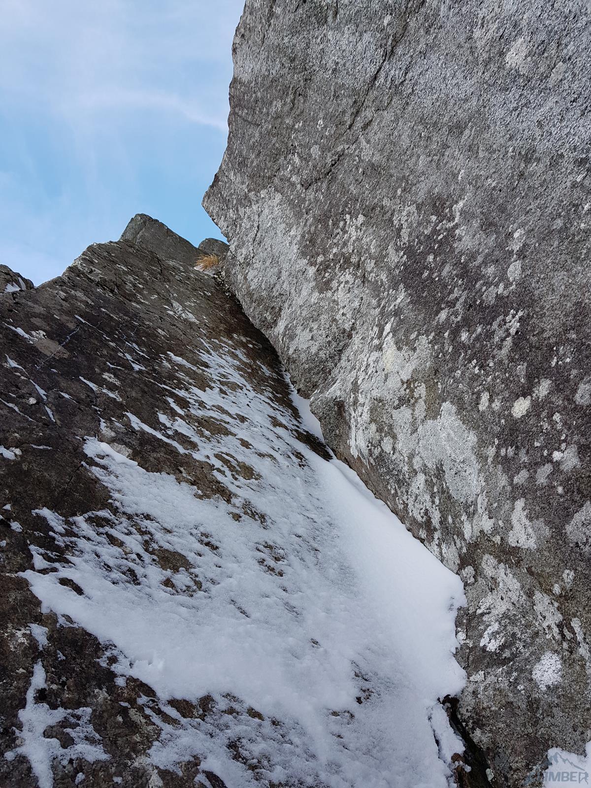 Kluczowy wyciąg rozpoczyna się przewieszającym komino-zacięciem (letnie VI+, zimą ok. M6+), oferującym dość dobre chwyty ale słabsze miejscami stopnie, asekuracja na starcie z 2 haków, potem już własna (bardzo dobra). Po urwaniu jednego z chwytów odcinek muszę powtarzać – druga próba kończy się już powodzeniem choć nie ukrywam, że akrobacje na wyjściu z zacięcia kosztowały mnie sporo sił. Powyżej mamy restową półkę i jeszcze jeden krótki ale sprężny skalny odcinek (M5+), nad którym znajduje się stanowisko (ok. 30 metrów, haki). Z tego miejsca ruszamy zacięciem skośnie w lewo (ok. M5) i wychodzimy w trawy – do końca drogi pozostaje nam ostatnie skalne spiętrzenie, które pokonać można na kilka sposobów. Początkowo przymierzam się do kominka po lewej (latem IV, zimą krótki fragment ok. M6 – końcówka Prawy do Lewego), w końcu jednak podchodzę pod ściankę po prawej. Spodziewając się trudności i nie będąc pewnym czy to właściwy wariant (latem V-, zimą ?), ściągam w to miejsce kolegę – nad półką jest hak.