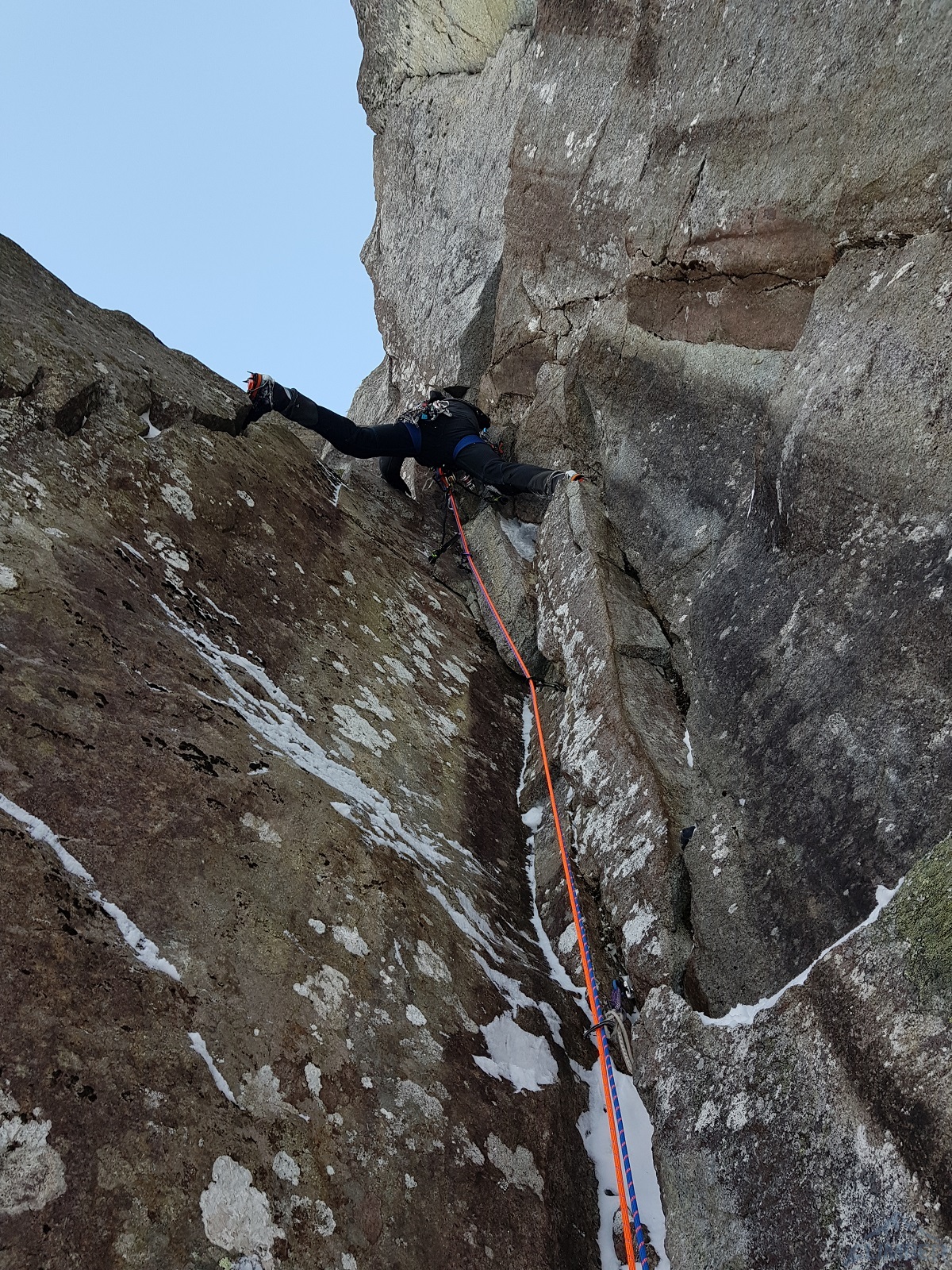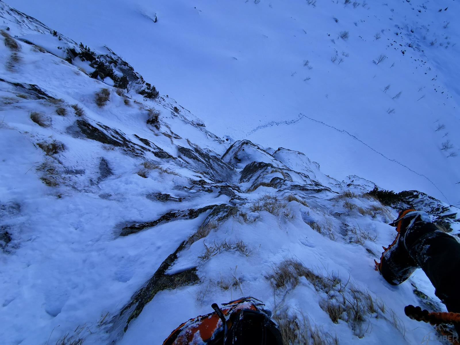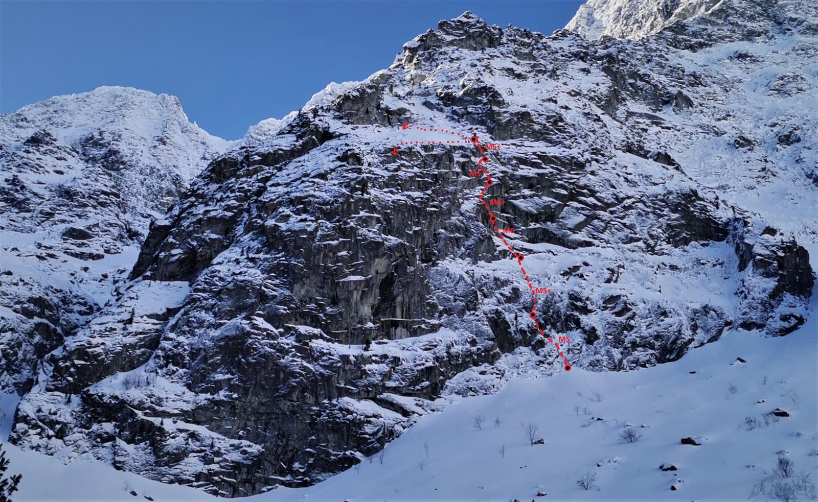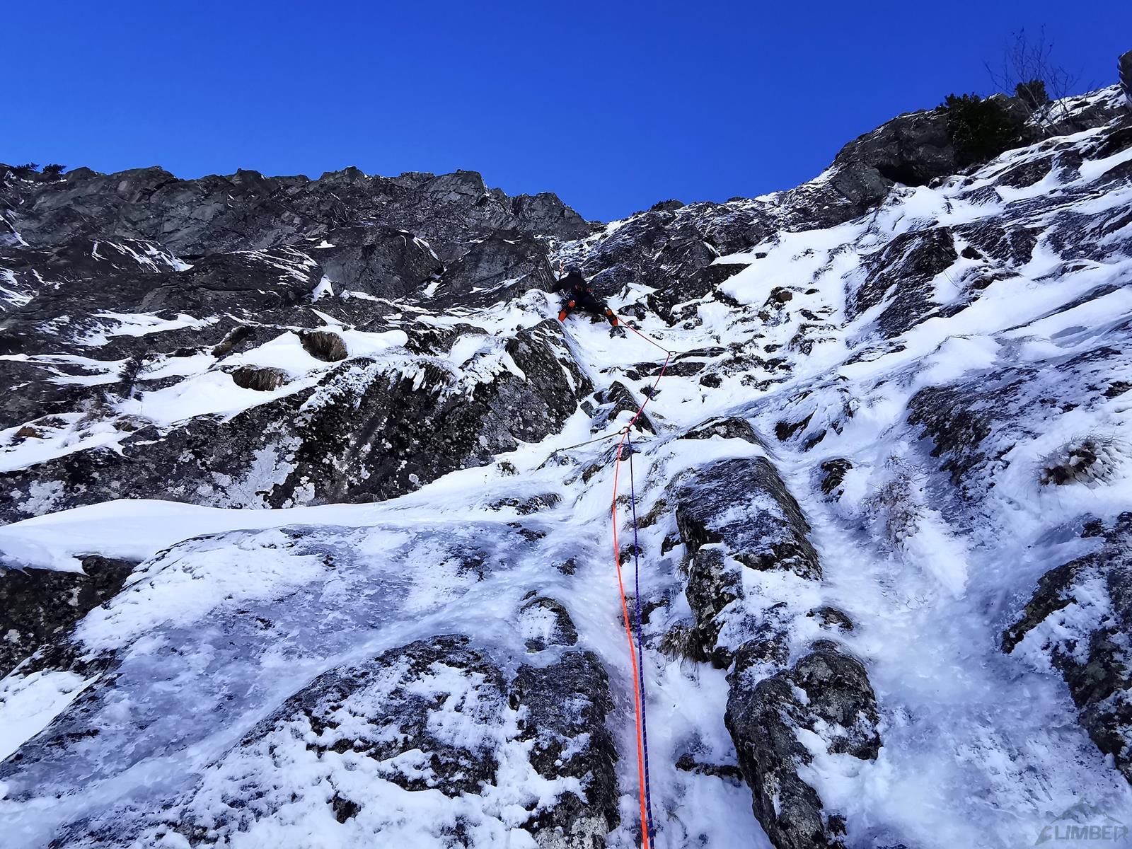 Kluczowy wyciąg rozpoczyna się przewieszającym komino-zacięciem (letnie VI+, zimą ok. M6+), oferującym dość dobre chwyty ale słabsze miejscami stopnie, asekuracja na starcie z 2 haków, potem już własna (bardzo dobra). Po urwaniu jednego z chwytów odcinek muszę powtarzać – druga próba kończy się już powodzeniem choć nie ukrywam, że akrobacje na wyjściu z zacięcia kosztowały mnie sporo sił. Powyżej mamy restową półkę i jeszcze jeden krótki ale sprężny skalny odcinek (M5+), nad którym znajduje się stanowisko (ok. 30 metrów, haki). Z tego miejsca ruszamy zacięciem skośnie w lewo (ok. M5) i wychodzimy w trawy – do końca drogi pozostaje nam ostatnie skalne spiętrzenie, które pokonać można na kilka sposobów. Początkowo przymierzam się do kominka po lewej (latem IV, zimą krótki fragment ok. M6 – końcówka Prawy do Lewego), w końcu jednak podchodzę pod ściankę po prawej. Spodziewając się trudności i nie będąc pewnym czy to właściwy wariant (latem V-, zimą ?), ściągam w to miejsce kolegę – nad półką jest hak.