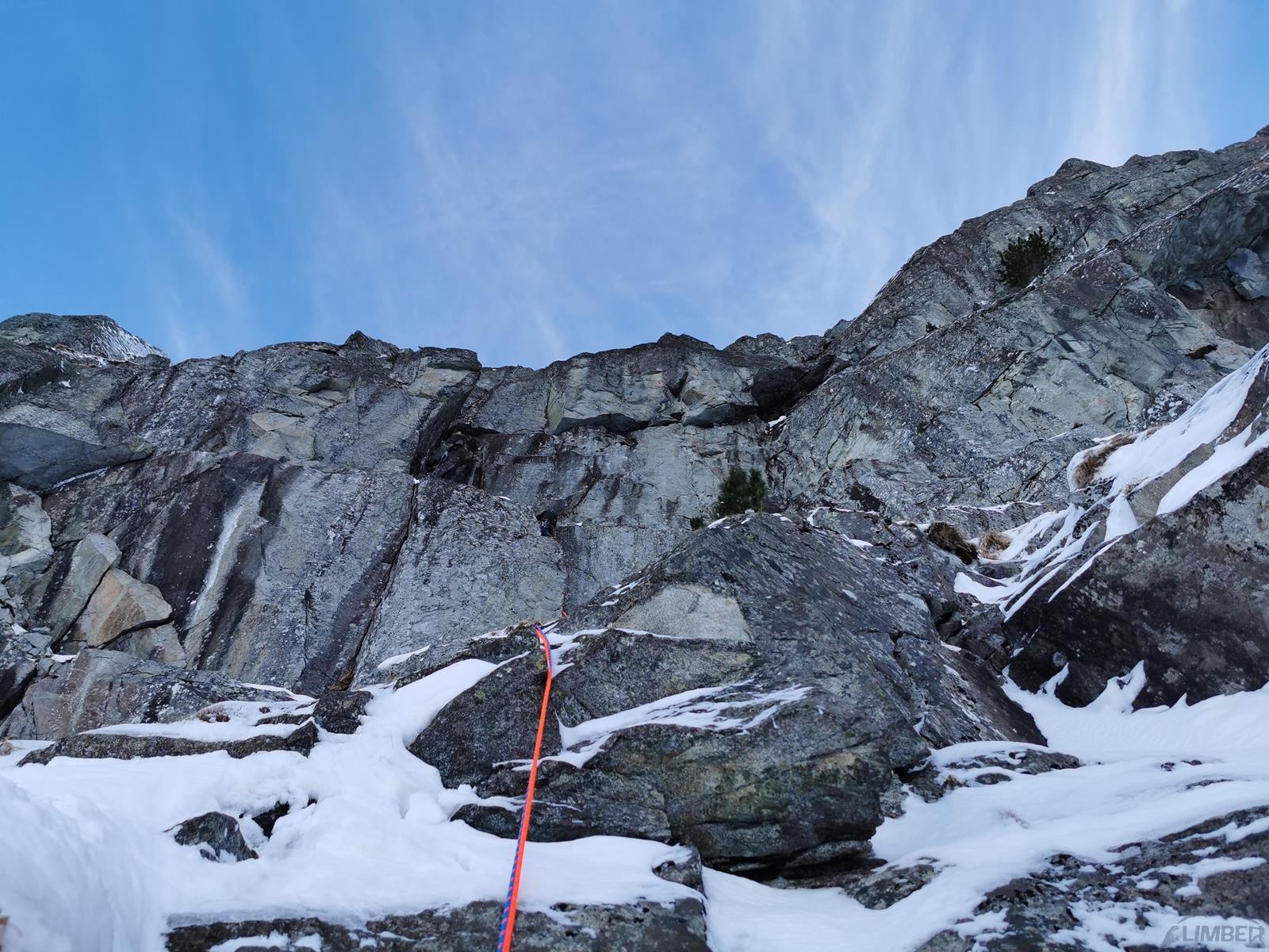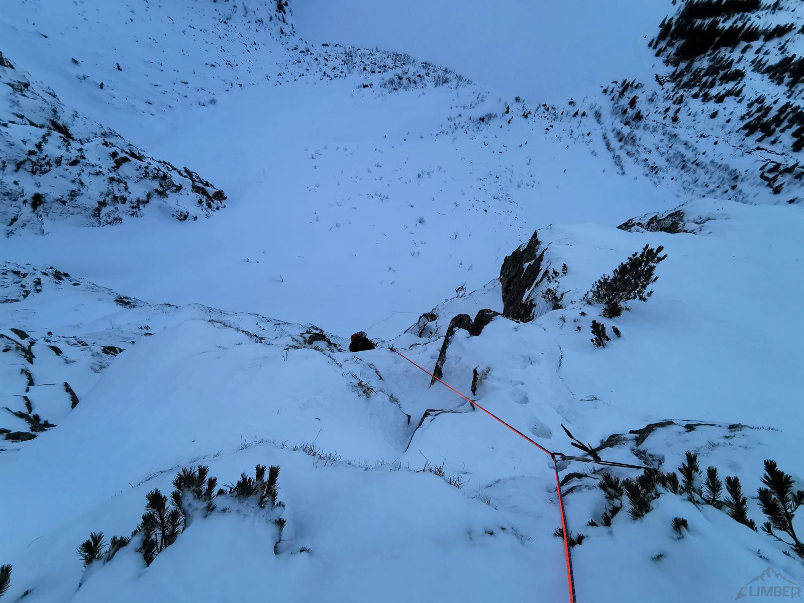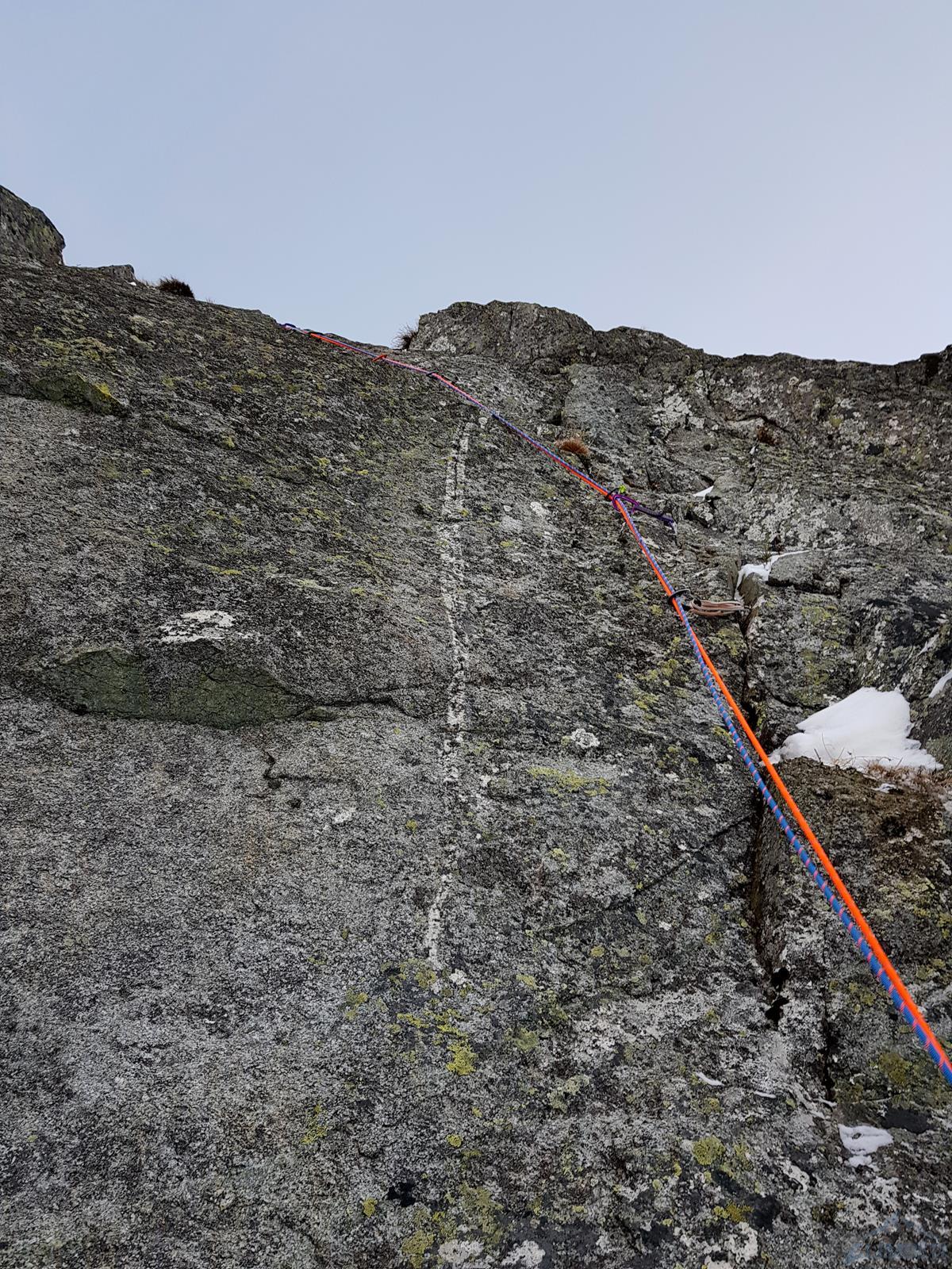 Zaczynam ostatni odcinek i po chwili w szybkim tempie wracam do kolegi – po wpięciu do drugiego haka sprawdzam go naciągając linę, stara skoba łamie się i zaliczam lot. Kolejny raz okazuje się, że starych przelotów nie należy traktować jako pewnych punktów. Wstawiam się w wyciąg raz jeszcze, jednak gdy robi się ryzykownie i trudno (wąska rysa skierowana skośnie w dół i brak stopni do skontrowania) zawisam na friendzie i zabijam dobrego haka. Mając już dość wrażeń oraz będąc zdziwionym zastanymi trudnościami nie wracam już na dół tylko zaliczam A0 i po kilku niebanalnych ruchach wychodzę w strome trawy – tutaj ponownie czeka śnieżna skorupa i brak dobrej asekuracji, podchodzę więc aż do drzewka kilka metrów wyżej. Michał azeruje ściankę wypadając z rysy raz za razem i poddaje w wątpliwość czy dobrze poszliśmy, na letnie V- nam to nie wygląda… Temat konsultuję później z Jankiem Kuczerą, który poszedł tym samym wariantem i ocenił, że klasycznie jest tam dość sprężnie. PS. W następnym sezonie dotarły do mnie słuchy od powtarzających, że zimą ścianka jest bardzo wymagająca i najczęściej omijana jest niżej kominkiem z drogi Prawy do Lewego - gdybyśmy wiedzieli cała droga puściłaby klasycznie i oszczędzilibyśmy sporo nerwów 😊. Radzę wziąć więc poprawkę na topo - również to Kuby Radziejowskiego, który zostawił tam wycenę letnią, sam jednak kończył drogę wspomnianym wcześniej wariantem.