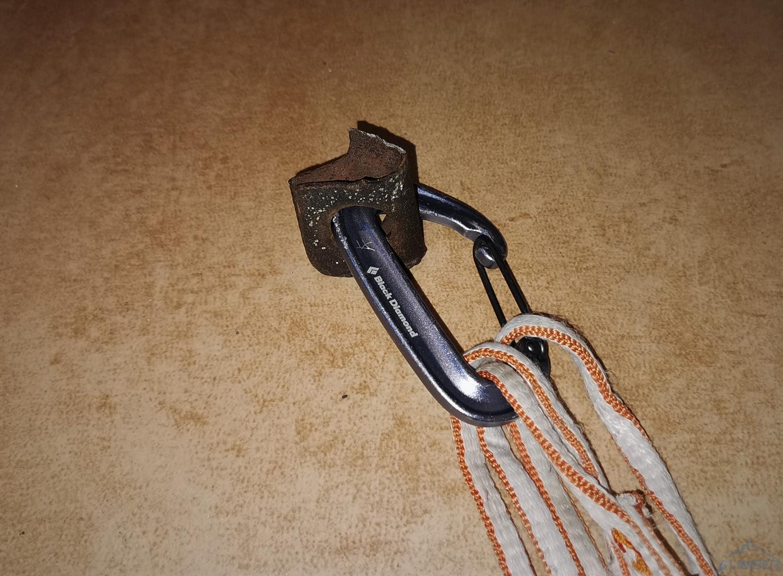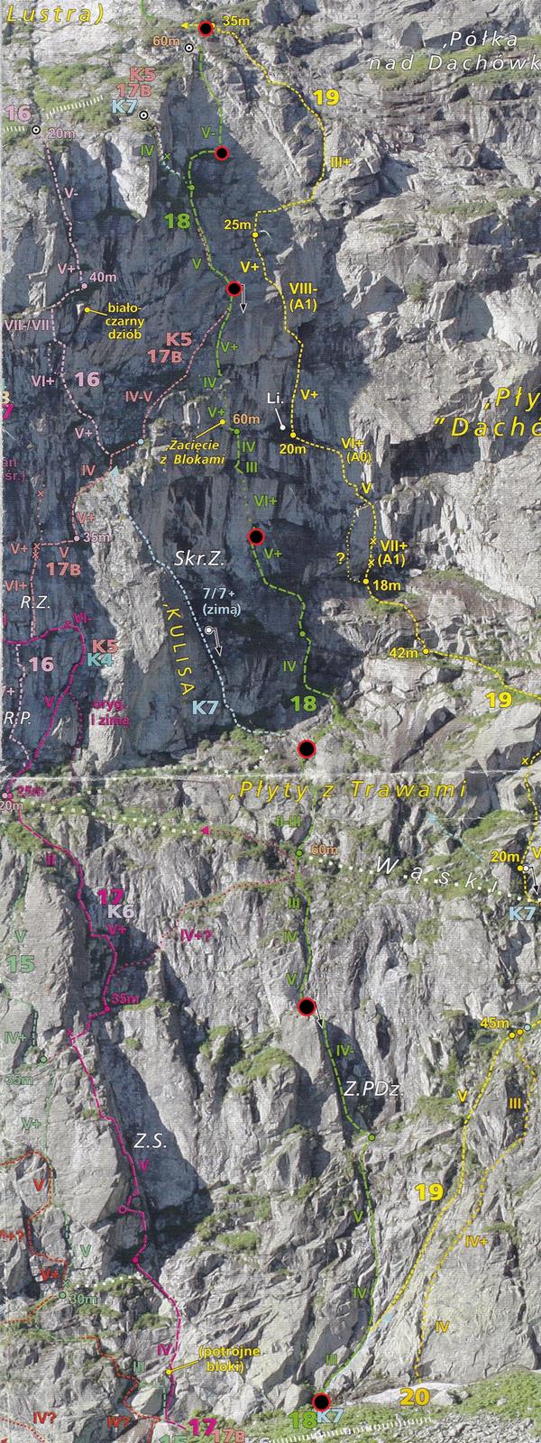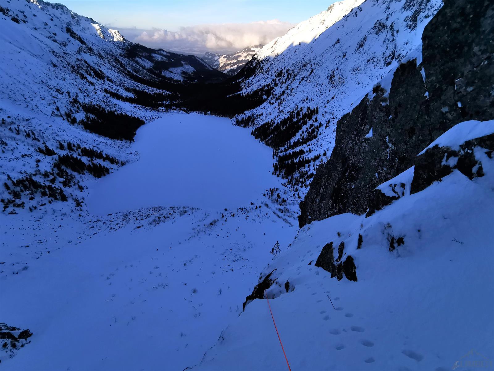 Zaczynam ostatni odcinek i po chwili w szybkim tempie wracam do kolegi – po wpięciu do drugiego haka sprawdzam go naciągając linę, stara skoba łamie się i zaliczam lot. Kolejny raz okazuje się, że starych przelotów nie należy traktować jako pewnych punktów. Wstawiam się w wyciąg raz jeszcze, jednak gdy robi się ryzykownie i trudno (wąska rysa skierowana skośnie w dół i brak stopni do skontrowania) zawisam na friendzie i zabijam dobrego haka. Mając już dość wrażeń oraz będąc zdziwionym zastanymi trudnościami nie wracam już na dół tylko zaliczam A0 i po kilku niebanalnych ruchach wychodzę w strome trawy – tutaj ponownie czeka śnieżna skorupa i brak dobrej asekuracji, podchodzę więc aż do drzewka kilka metrów wyżej. Michał azeruje ściankę wypadając z rysy raz za razem i poddaje w wątpliwość czy dobrze poszliśmy, na letnie V- nam to nie wygląda… Temat konsultuję później z Jankiem Kuczerą, który poszedł tym samym wariantem i ocenił, że klasycznie jest tam dość sprężnie. PS. W następnym sezonie dotarły do mnie słuchy od powtarzających, że zimą ścianka jest bardzo wymagająca i najczęściej omijana jest niżej kominkiem z drogi Prawy do Lewego - gdybyśmy wiedzieli cała droga puściłaby klasycznie i oszczędzilibyśmy sporo nerwów 😊. Radzę wziąć więc poprawkę na topo - również to Kuby Radziejowskiego, który zostawił tam wycenę letnią, sam jednak kończył drogę wspomnianym wcześniej wariantem.