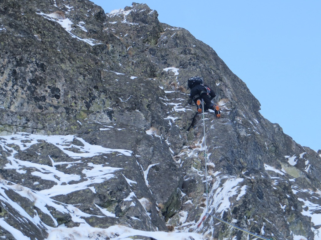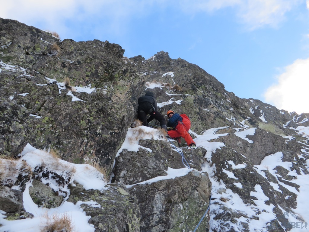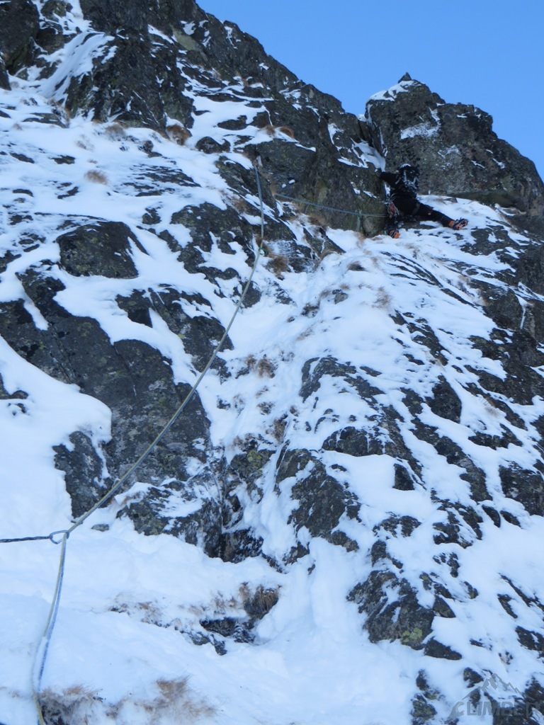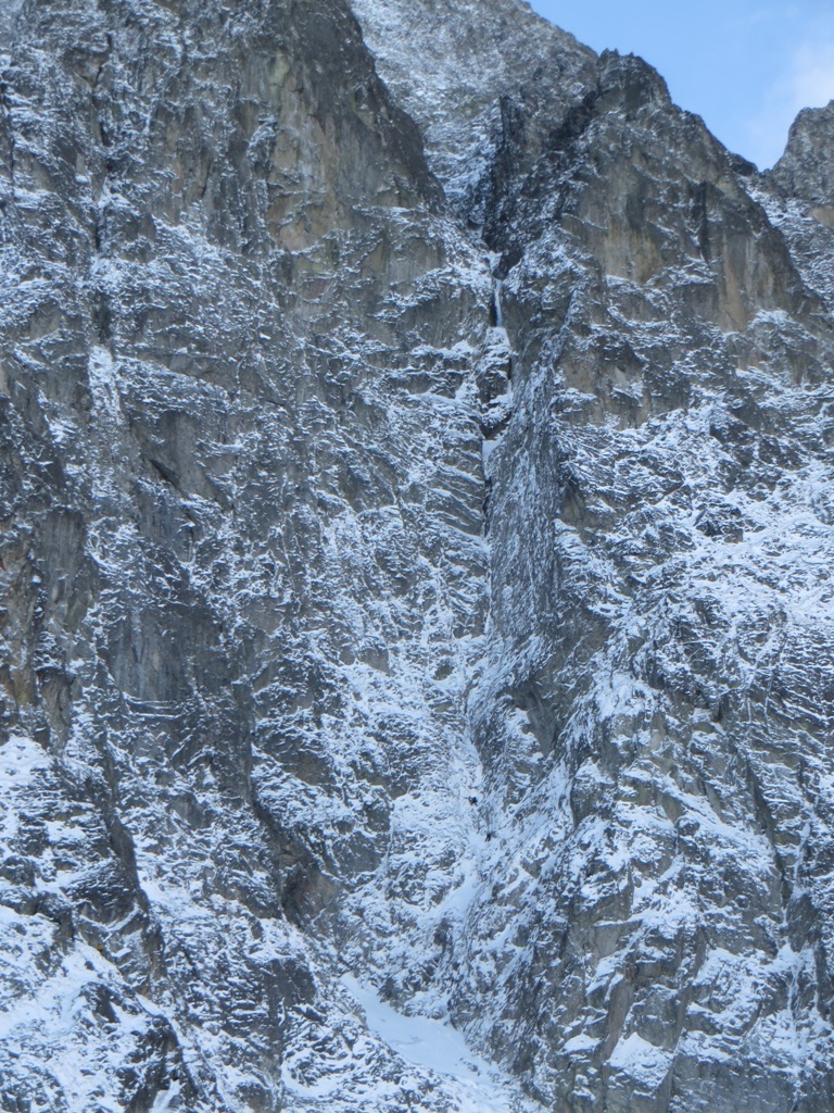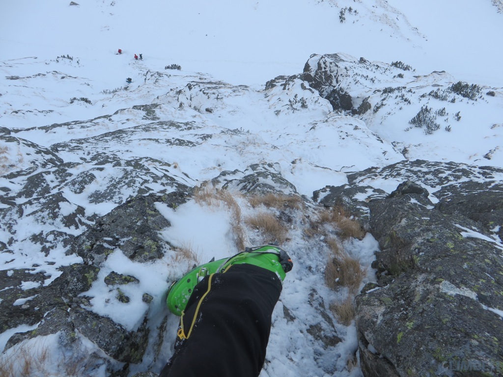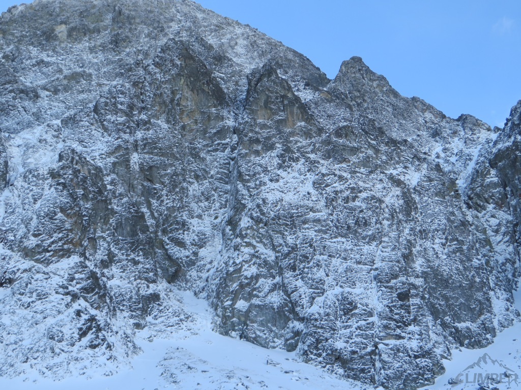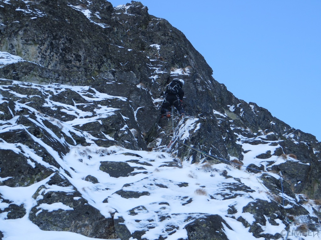 Minął prawie miesiąc od pierwszego zimowego wspinania w tym sezonie więc motywacja do wyjazdu była bardzo duża. Niestety po raz kolejny sypnęło więc ambitne cele odpadają – dlatego też kierujemy się do Doliny Kieżmarskiej. Ponieważ śniegu jest dużo, a wspinania ma być niewiele – decydujemy się z Ryśkiem na zabranie nart. Podejście pod północną ścianę Małego Kieżmarskiego mija więc szybko i przyjemnie. Na miejscu okazuje się, że śniegu jest więcej niż myśleliśmy, na dodatek wspinają się nieliczni – w tym jeden zespół na Stanisławskim (szacun!). Dlatego też postanawiamy zrobić szybkie przejście 3-wyciągowej drogi No a co na Skrajnym Strażniku – 2 lata temu robiliśmy drogę biegnąca kilka metrów na lewo (No a co) więc teren był już nam znany.