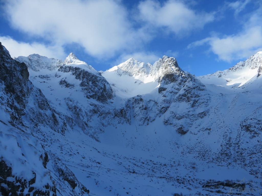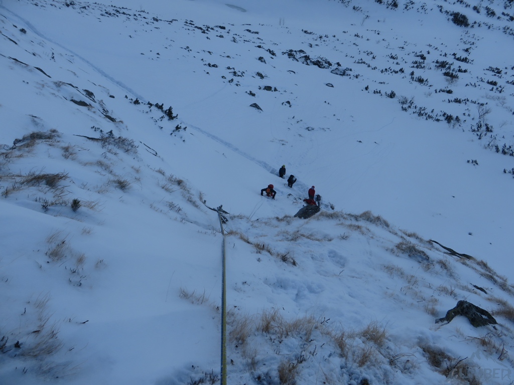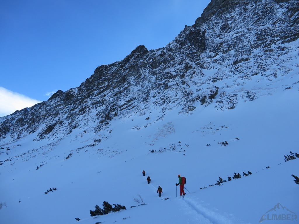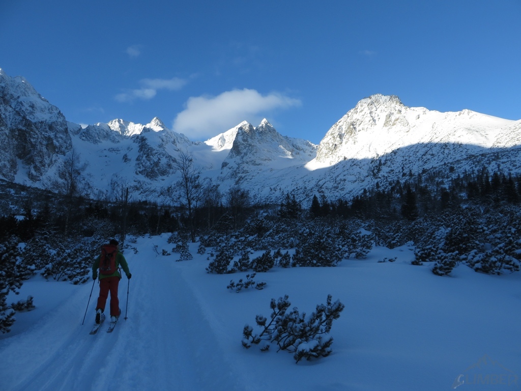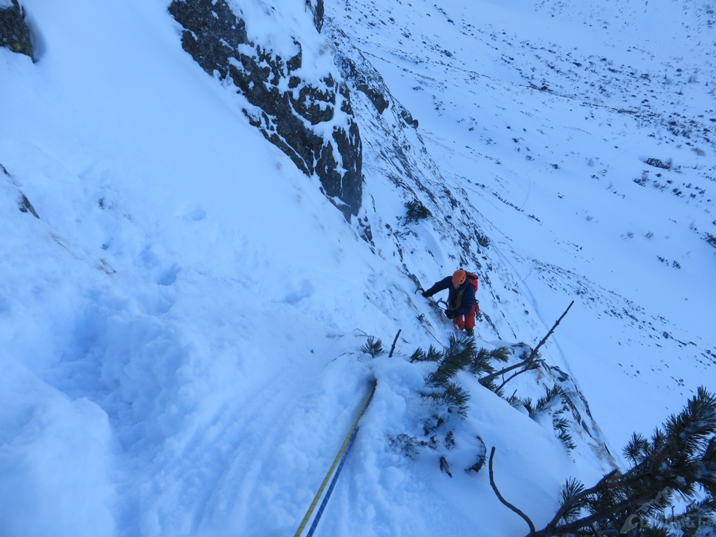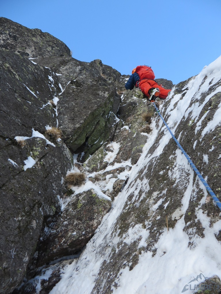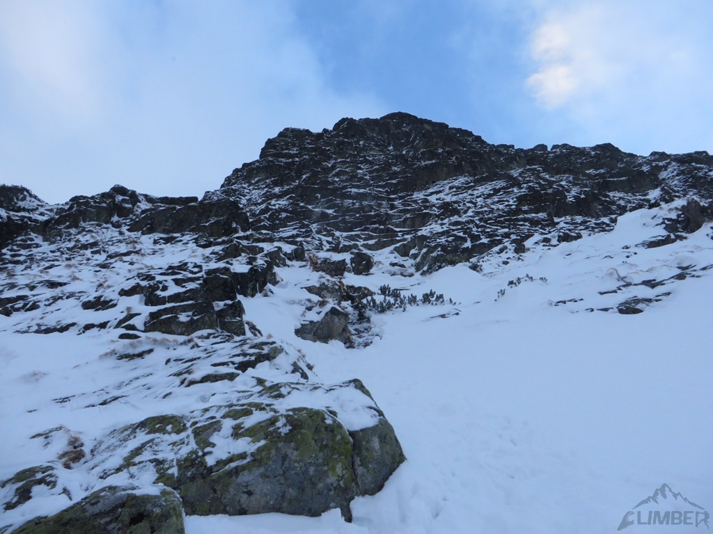 Minął prawie miesiąc od pierwszego zimowego wspinania w tym sezonie więc motywacja do wyjazdu była bardzo duża. Niestety po raz kolejny sypnęło więc ambitne cele odpadają – dlatego też kierujemy się do Doliny Kieżmarskiej. Ponieważ śniegu jest dużo, a wspinania ma być niewiele – decydujemy się z Ryśkiem na zabranie nart. Podejście pod północną ścianę Małego Kieżmarskiego mija więc szybko i przyjemnie. Na miejscu okazuje się, że śniegu jest więcej niż myśleliśmy, na dodatek wspinają się nieliczni – w tym jeden zespół na Stanisławskim (szacun!). Dlatego też postanawiamy zrobić szybkie przejście 3-wyciągowej drogi No a co na Skrajnym Strażniku – 2 lata temu robiliśmy drogę biegnąca kilka metrów na lewo (No a co) więc teren był już nam znany.