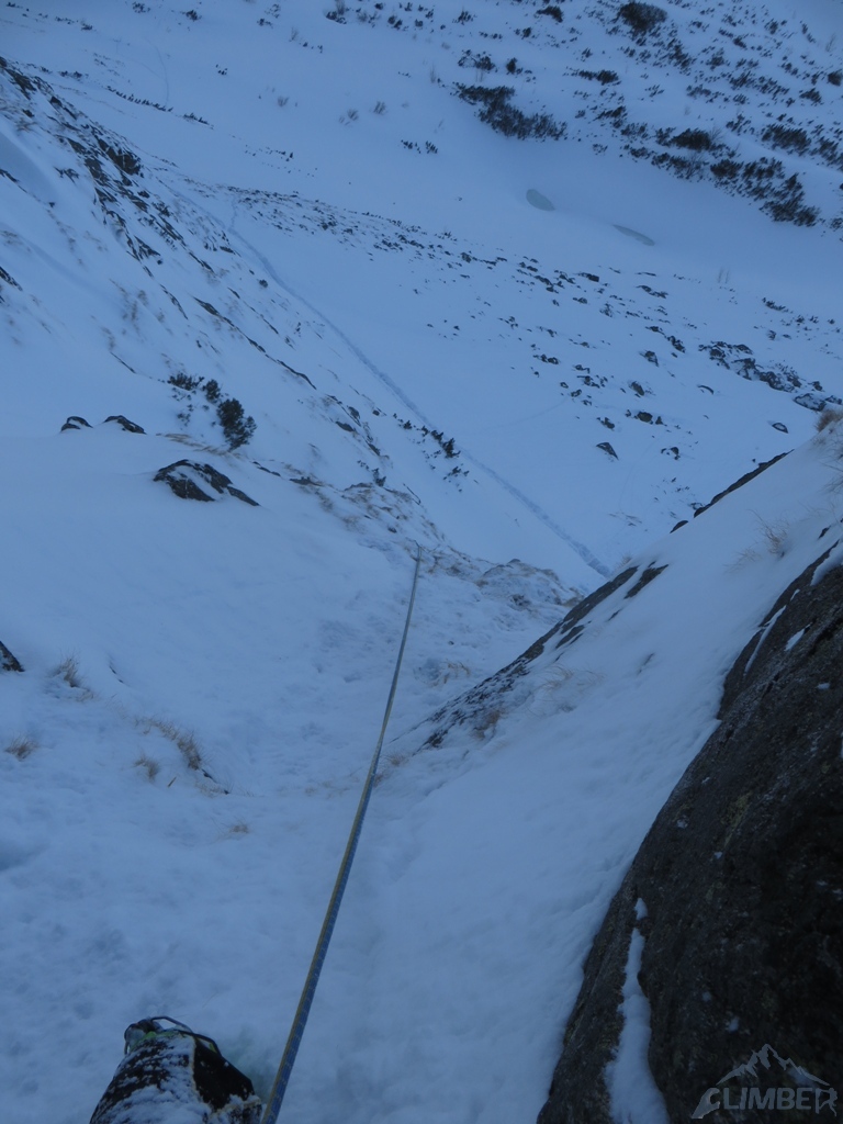 Kolega finalnie wyciąg przewalczył nie zastając na nim żadnej gotowej asekuracji - zajęło mu to prawie 2 godziny!. Po dojściu do stanu obgadujemy co dalej, jest jednak za późno i jesteśmy zbyt zmarznięci by kontynuować. Bijemy więc haka, zjeżdżamy do stanu sprzed drugiego wyciągu i dalej na dół.