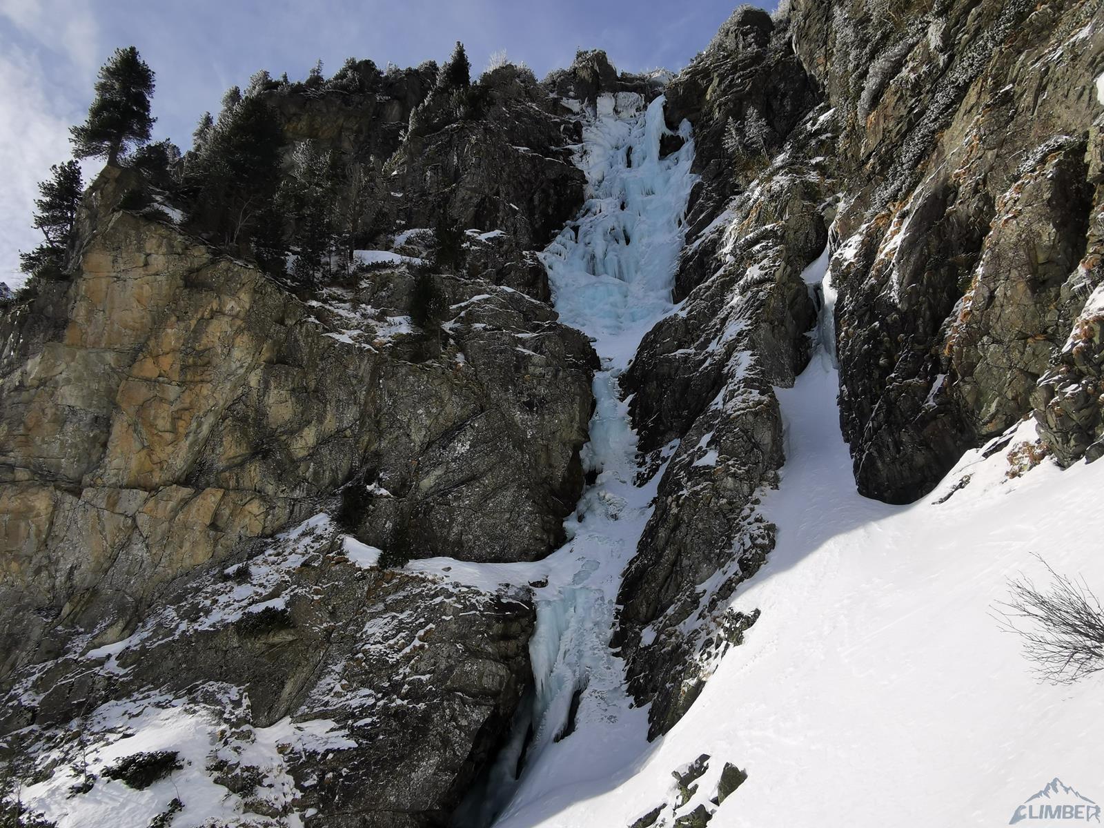 Pierwszy wyciąg ma ok. 50 metrów i przy dobrym wylodzeniu oferuje przyjemne wspinanie w trudnościach do WI3. Jeżeli skała będzie odkryta, na wyższym progu czekać może krótki odcinek drytoolowy (ok. M3-M4), warto w tym przypadku zabrać 2-3 średnie friendy (camy 0,5 do 1) lub haki. Inną atrakcją mogą być mostki lodowe nad płynącą pod spodem wodą, generalnie nie mając potwierdzonych warunków trzeba być gotowym na różne opcje. Stanowisko (haki + repy, mailony) znajduje się na skale po lewej stronie. Planując wspinanie na drugim wyciągu trudniejszym wariantem, warto rozważyć jednak własny stan po prawej – w skale lub w lodzie tuż pod górnym spiętrzeniem.