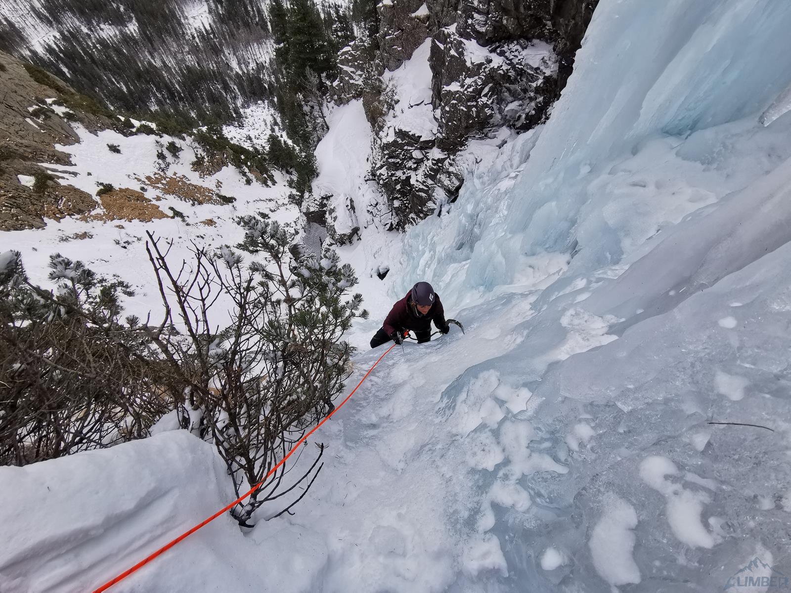 Drugi wyciąg (do 60 metrów) najczęściej oferuje trzy opcje przejścia – po lewej (schody lodowe i prożki za WI3), środkiem (ok. WI3+) i po prawej (górna kolumna za WI4 do WI4+). Może zdarzyć się, że lewa strona płynie i/lub kolumna lodowa po prawej jest za słabo uformowana. Wybieramy wtedy najbezpieczniejszy wariant by dojść do górnego stanowiska zjazdowego (haki i pętle po lewej), zjeżdżamy z lodu (dobrego!) lub wychodzimy na platformę pod przewieszoną ścianką z prawej strony – w tym przypadku czeka nas niewygodny zjazd z drzewka.