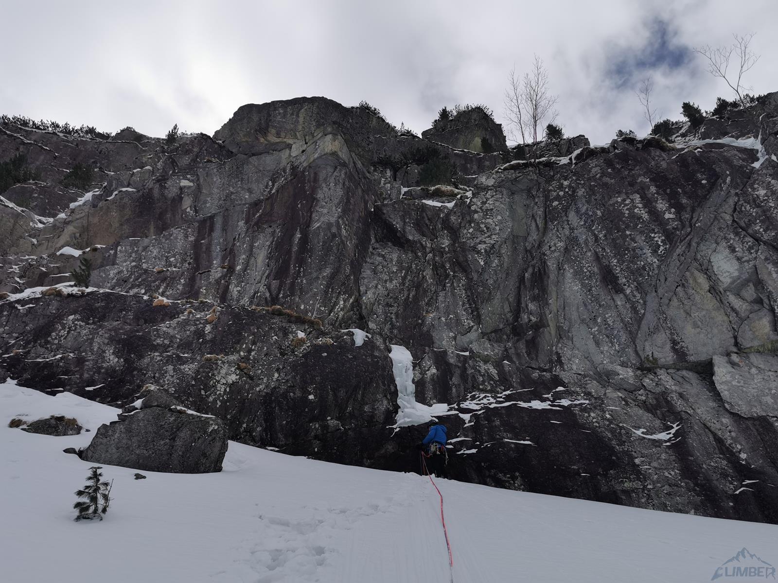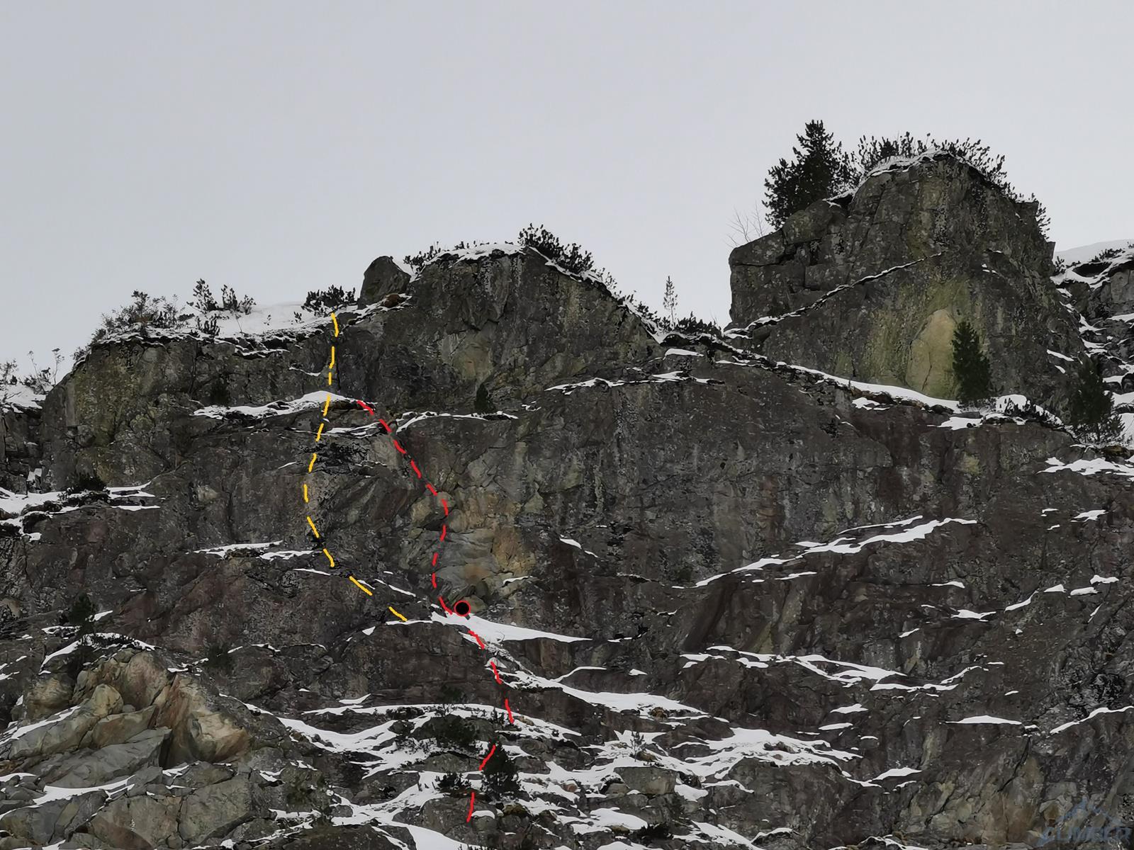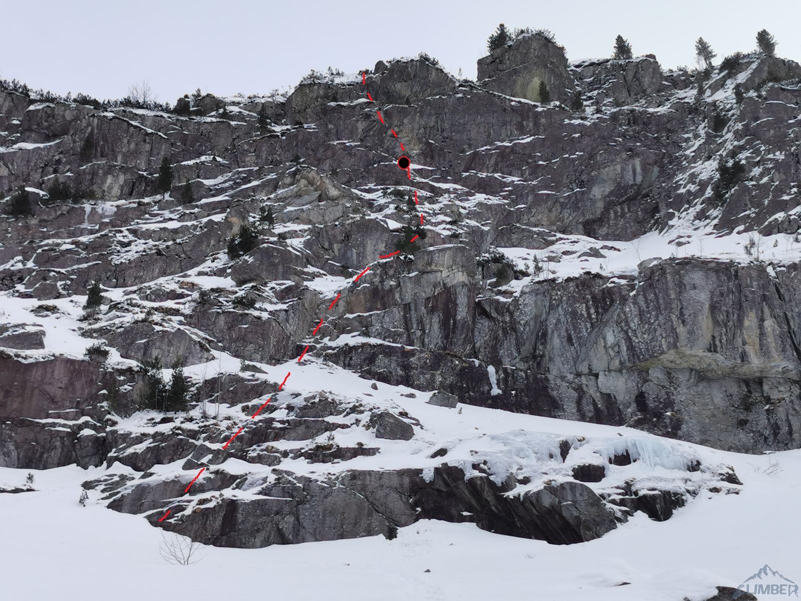 Ponieważ schemat do drogi nie istnieje, opierać można się jedynie na jednym z dostępnych foto-topo Buli. Już dół jest sporą zagadką ponieważ gdy podchodzimy do rzekomego startu w zatoczce, okazuje się, że w zastanych warunkach trzeba by było wspinać się kilkumetrową „nie-zimową” płytą z iluzoryczną asekuracją – ryzykowne i mało logiczne. Inne opcje to wybór diagonalnej rysy po lewej jak zrobiła ekipa, która umieściła film z przejścia tego fragmentu na necie, lub poszukanie własnego wariantu – tak też robimy i decydujemy wspinać się ładnym lodem po prawej stronie (WI2-WI3). Kilkumetrowy próg można też całkiem obejść po prawej stronie i od razu podejść pod drugi wyciąg na sektorze sportowym.