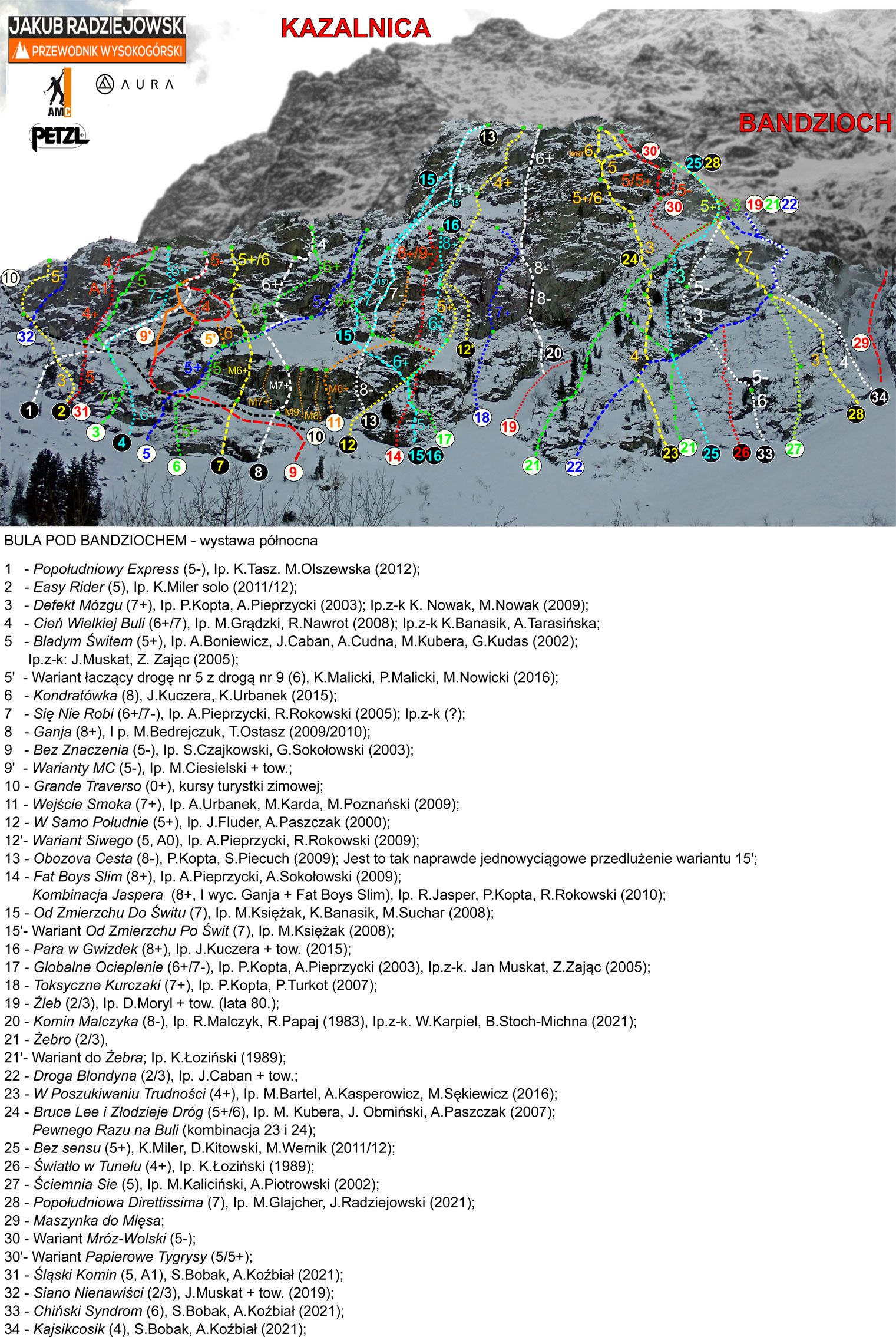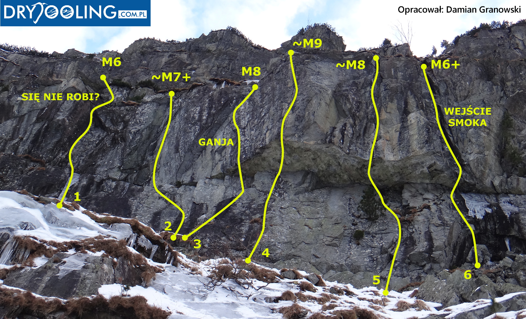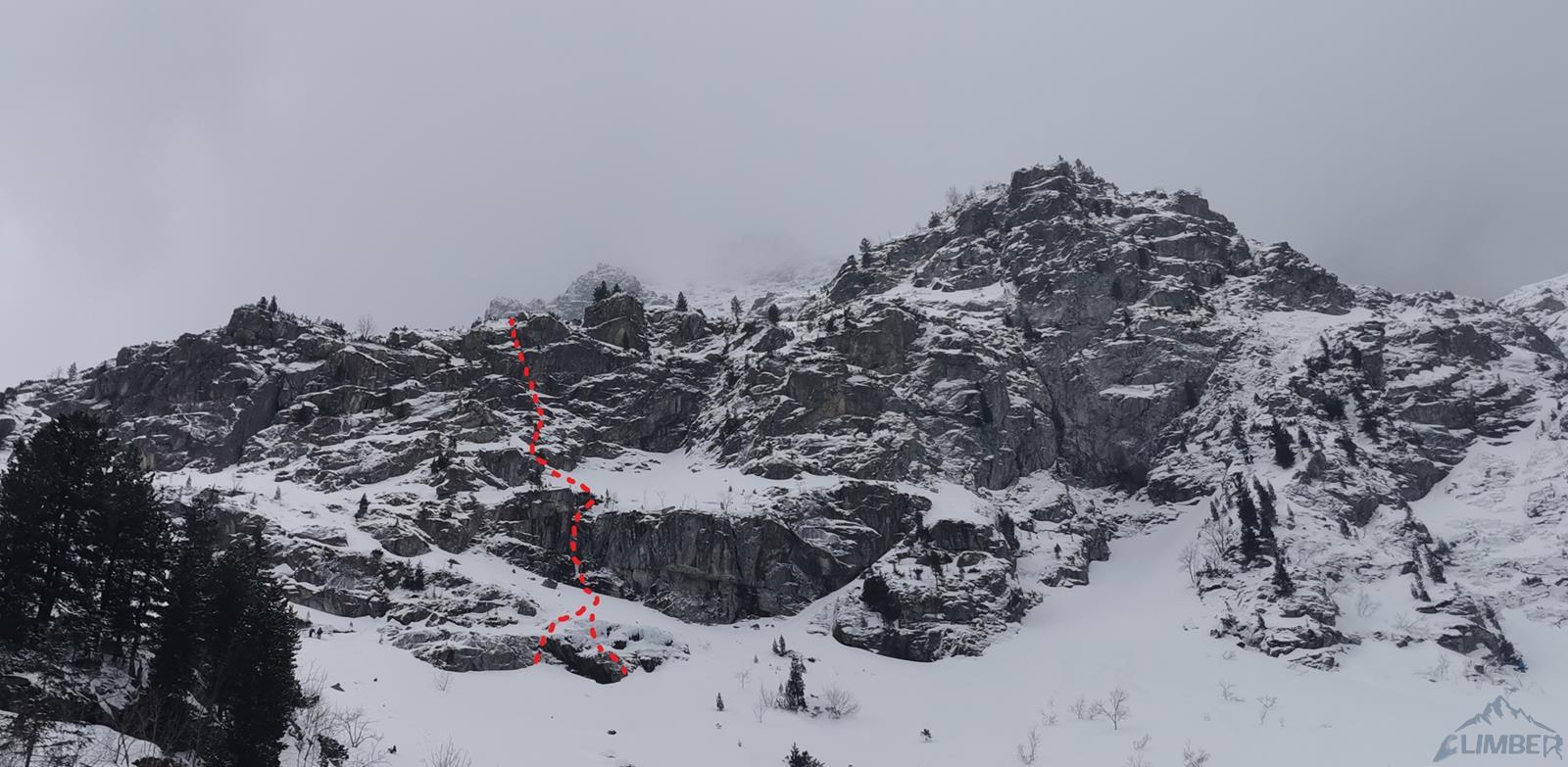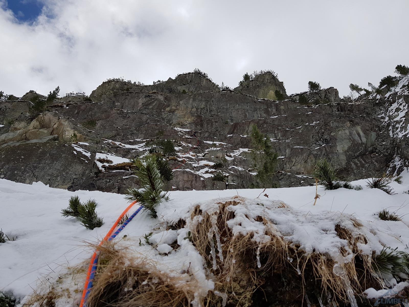 Ponieważ schemat do drogi nie istnieje, opierać można się jedynie na jednym z dostępnych foto-topo Buli. Już dół jest sporą zagadką ponieważ gdy podchodzimy do rzekomego startu w zatoczce, okazuje się, że w zastanych warunkach trzeba by było wspinać się kilkumetrową „nie-zimową” płytą z iluzoryczną asekuracją – ryzykowne i mało logiczne. Inne opcje to wybór diagonalnej rysy po lewej jak zrobiła ekipa, która umieściła film z przejścia tego fragmentu na necie, lub poszukanie własnego wariantu – tak też robimy i decydujemy wspinać się ładnym lodem po prawej stronie (WI2-WI3). Kilkumetrowy próg można też całkiem obejść po prawej stronie i od razu podejść pod drugi wyciąg na sektorze sportowym.