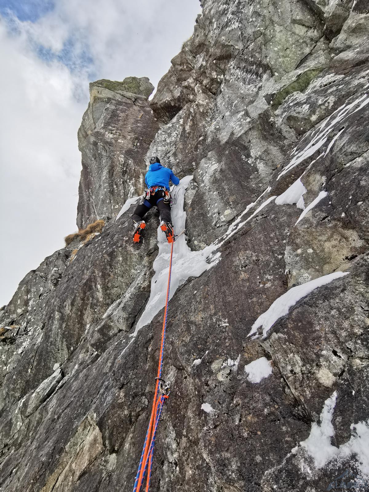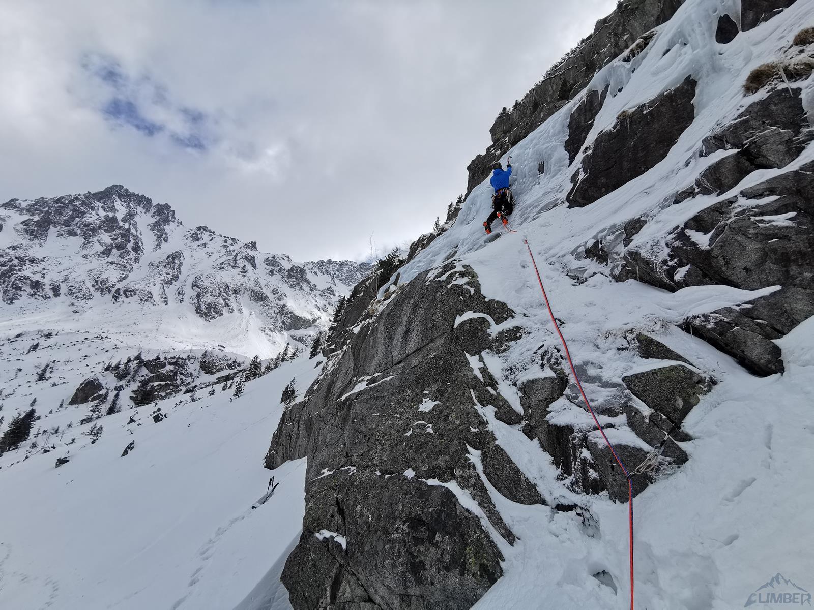 Odcinek który nas czeka (M6+, oryg. M6+/M7-) to wizytówka drogi i prawdziwa perełka – wspinamy się najpierw czujną płytką, po drodze korzystając z delikatnego placka lodowego (jeżeli jest wylany), po czym wchodzimy do zacięcia z rysą – tutaj konieczne jest dobre rozstawianie nóg i kontrowanie dziabek. Na koniec czeka nas siłowe przewinięcie na półkę – zaleca się zadbanie o styl by nie wychodzić na kolanach 😊. Michał swoje pierwsze zimowe M6+ na prowadzeniu sprawnie przechodzi OS-em  – bez walki się nie obywa, odwagi dodają jednak spity (jednego już nie ma ale nie jest to problem).