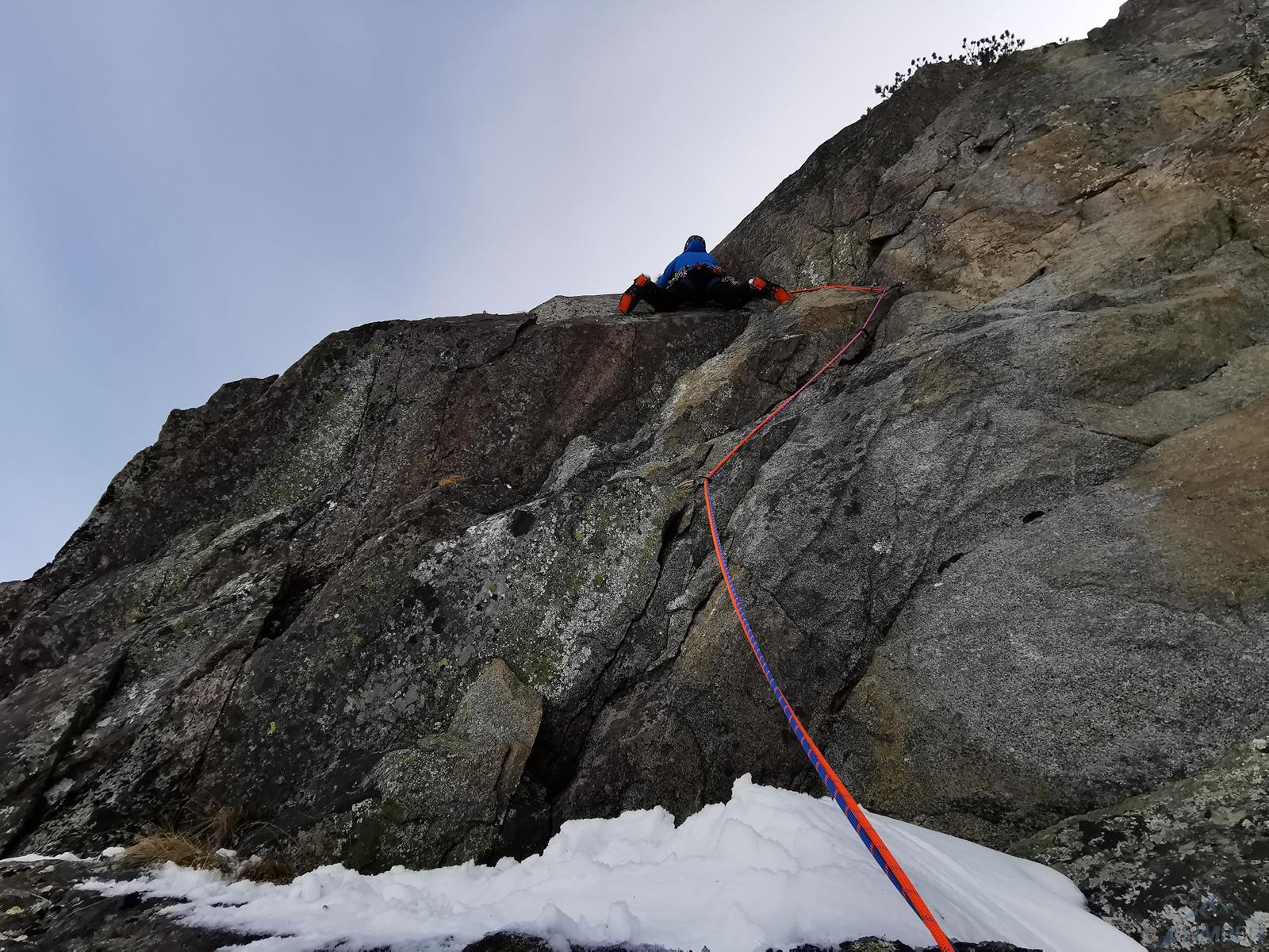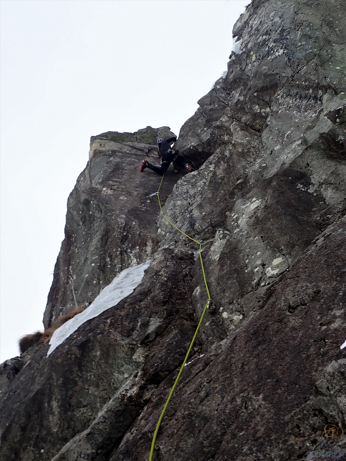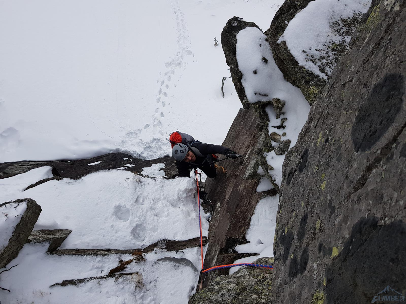 Kolejny wyciąg zaczyna się łatwym odcinkiem po śniegu, którym docieramy do górnej grzędy - idziemy do góry w kierunku ostatniego skalnego spiętrzenia z żółtym pasem skał. W zależności od wyboru wariantu trafimy fragmenty M3 do M4, przy słabym śniegu nie jest zbyt przyjemnie. Po dojściu pod wyjściową ściankę rozglądam się za stanowiskiem lub jego zalążkiem – nie ma nic, pozostaje wiec zbudowanie swojego. Ostatni fragment decydujemy się przejść narzucającym się pęknięciem pomiędzy żółtymi skałami – według foto-topo idzie się dalej w lewo i dopiero do góry, możliwe że to jednak błąd. Na wybranym przez nas wariancie nie ma jednak śladów po rakach, asekuracja jest częściowo wymagająca (konieczne haki!) i jedno miejsce jest dość sprężne (ok. M6-) ale i ciekawe. Dalej czeka jeszcze krótkie i fajne zaciątko oraz wyjście w łatwy teren – podeszliśmy kilkanaście metrów do dużego głazu na wypłaszczeniu. Widać nawet na takiej treningowej ściance jak Bula przeżyć można przygodę 😉.
