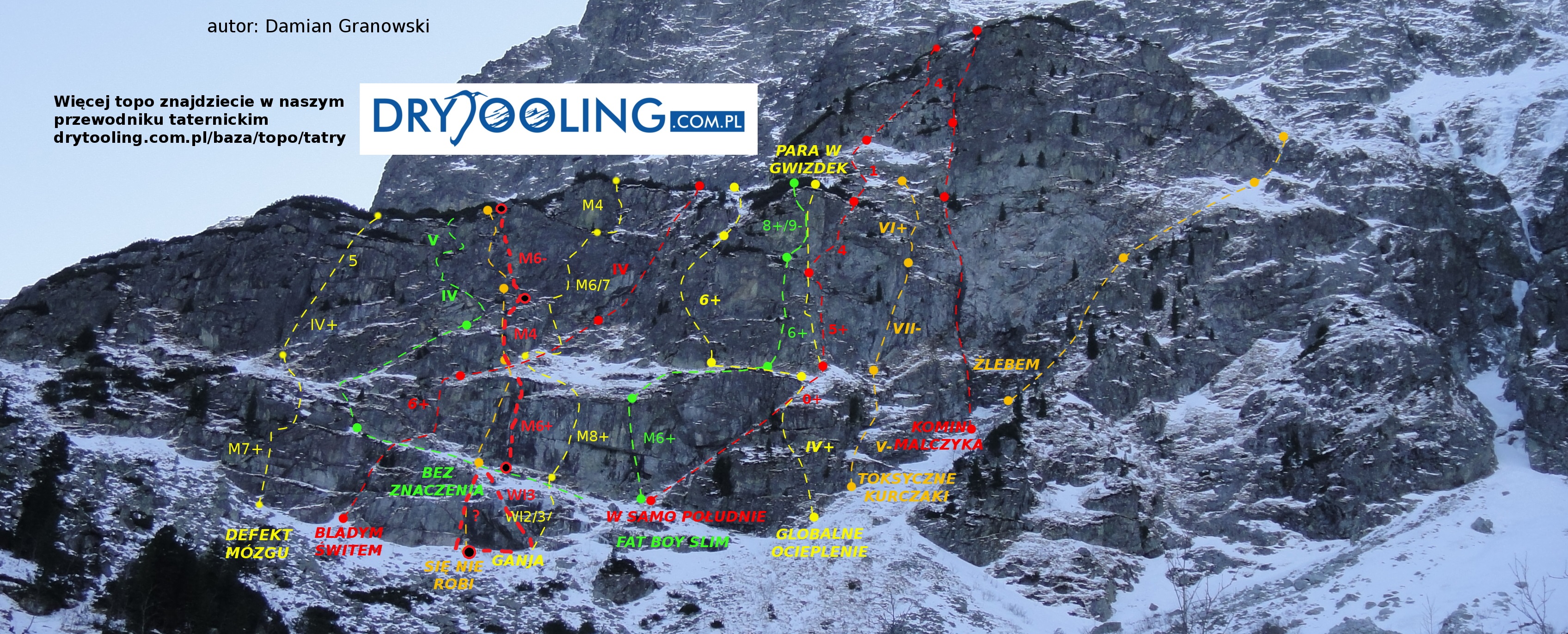 Wycena: M6+   Wycena uzupełniająca: oryg. M6+/M7-   Asekuracja: RS2   Długość [m]: 150   Wyciągi: 4   Czas [h]: 3   Wystawa: N   Ocena: 7/10   Komentarz: