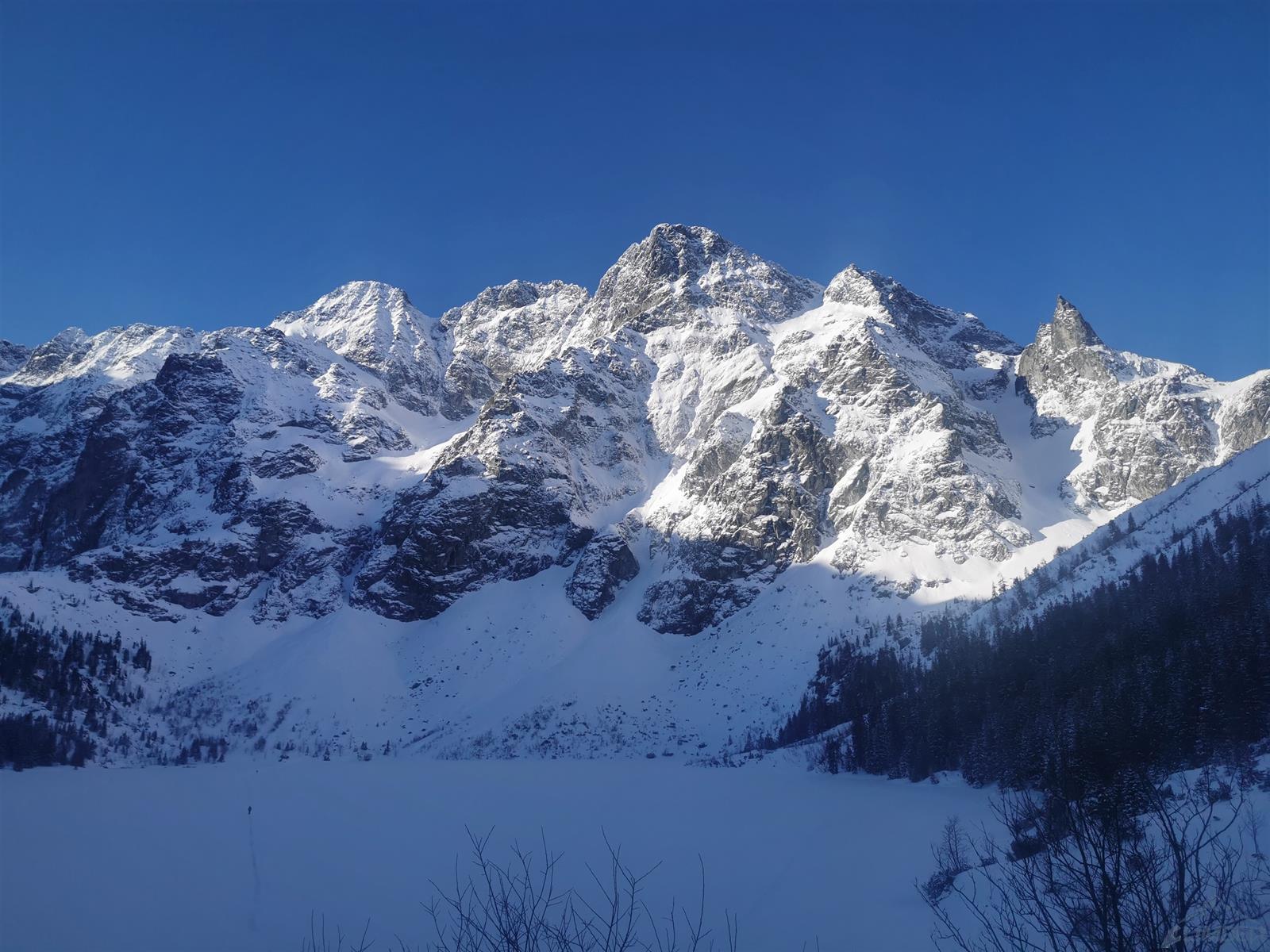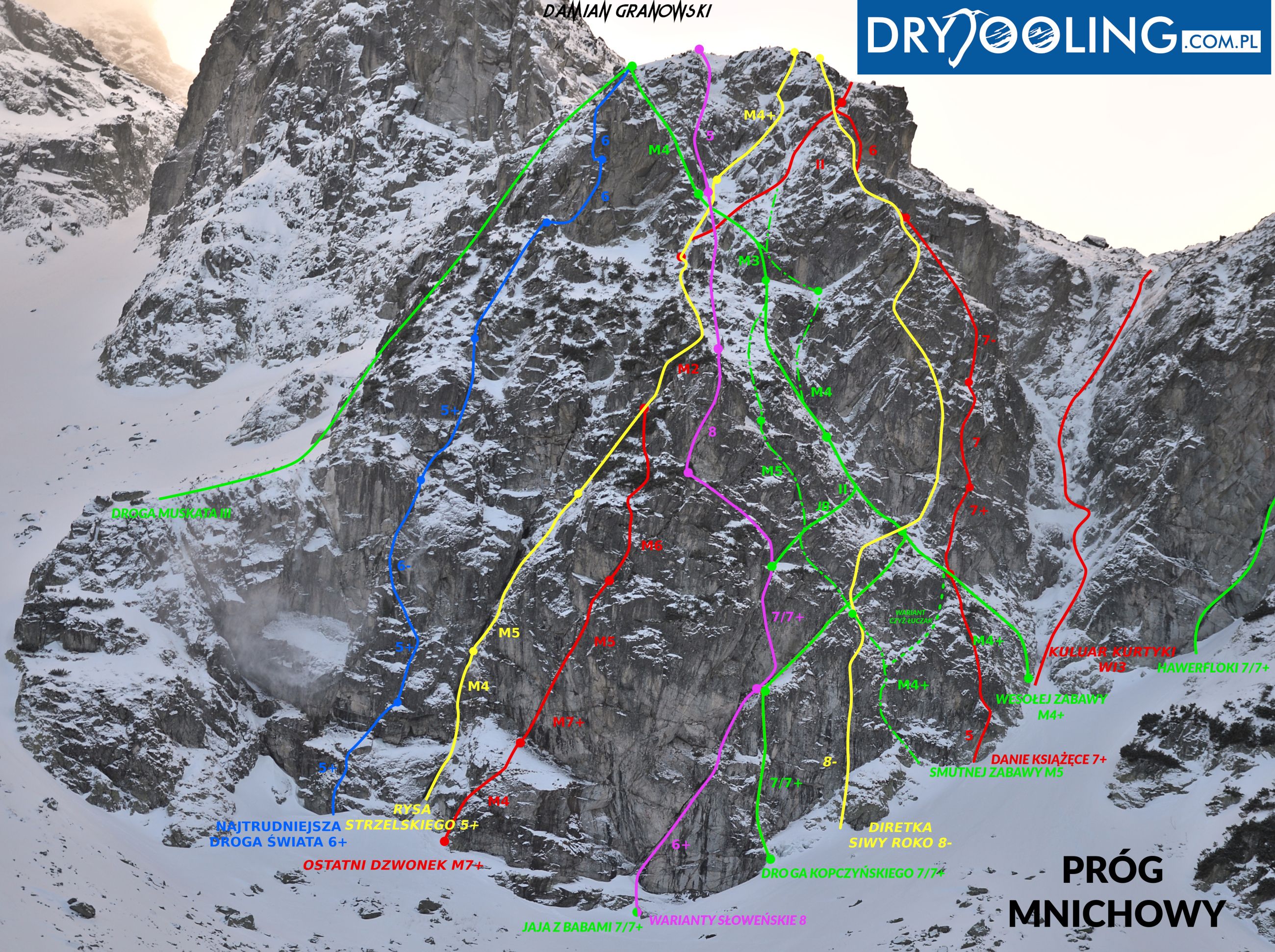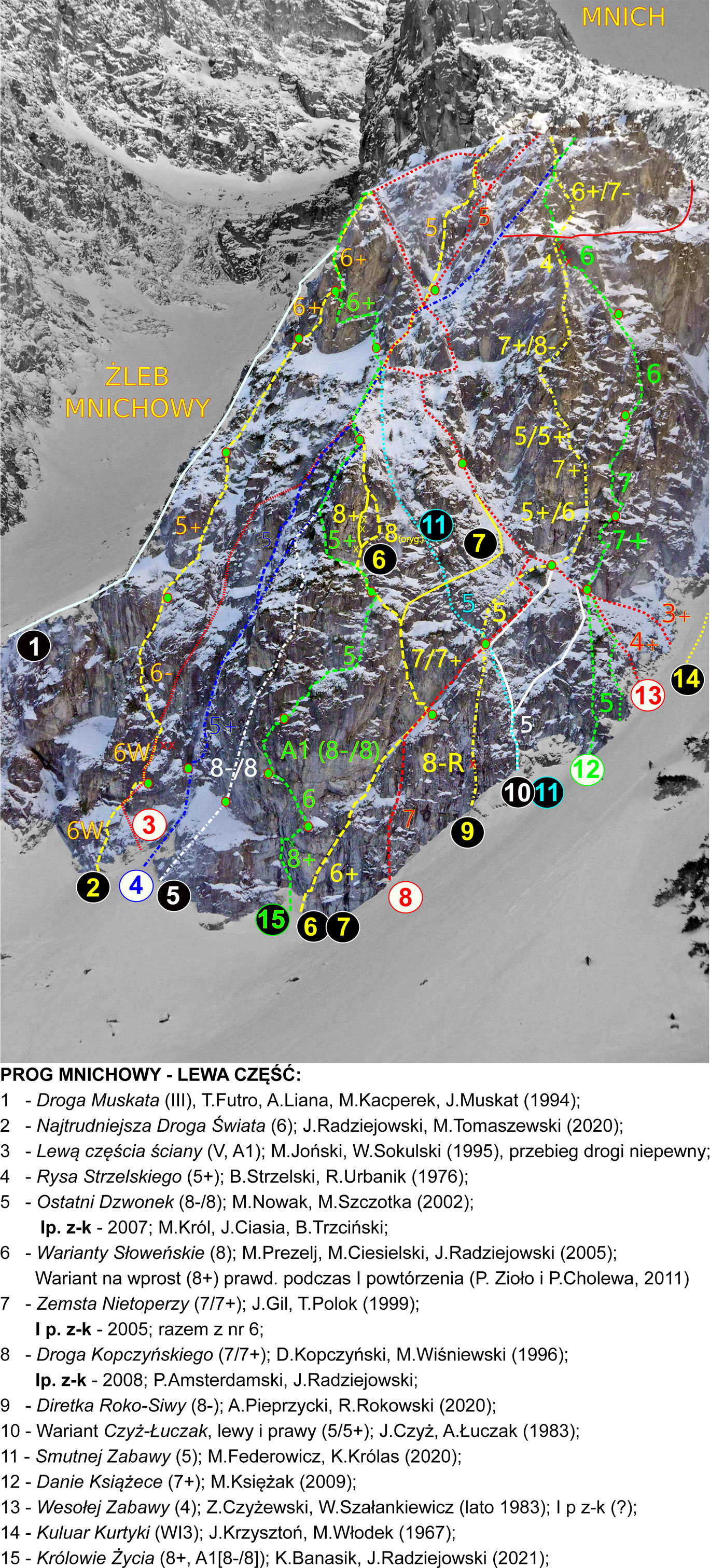 Początkiem kwietnia zima nadal w natarciu, w wielkanocny poniedziałek udajemy się więc ponownie do Morskiego Oka, podobnie jak tydzień wcześniej z zamiarem wspinania na Czołówce MSW. Ostatnio do zmiany planów zmusił nas opad śniegu, tym razem – mocny wiatr zrzucający ze ściany porządne pyłówki, próba rozpoczęcia wspinania kończy się szybkim wycofem. Przenosimy się więc na coś łatwiejszego i mniej narażonego na wiatr – nową (12.2020) drogę na Progu Mnichowym, Smutnej Zabawy (M5), łączącą się po trzech wyciągach z popularnym klasykiem, Wesołej Zabawy (M4+). PS. W Przewodniku Kuby Radziejowskiego pojawiło się info, że kluczowy wyciąg na Smutnej Zabawie to mocne 6.