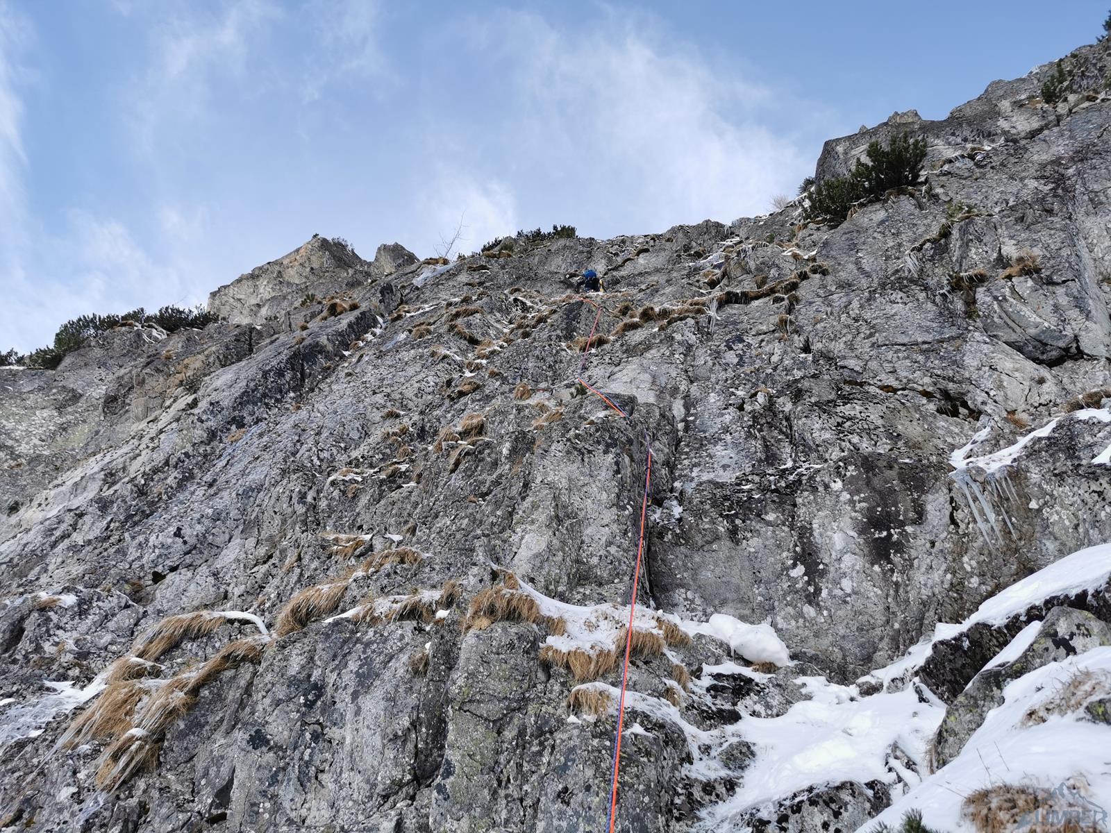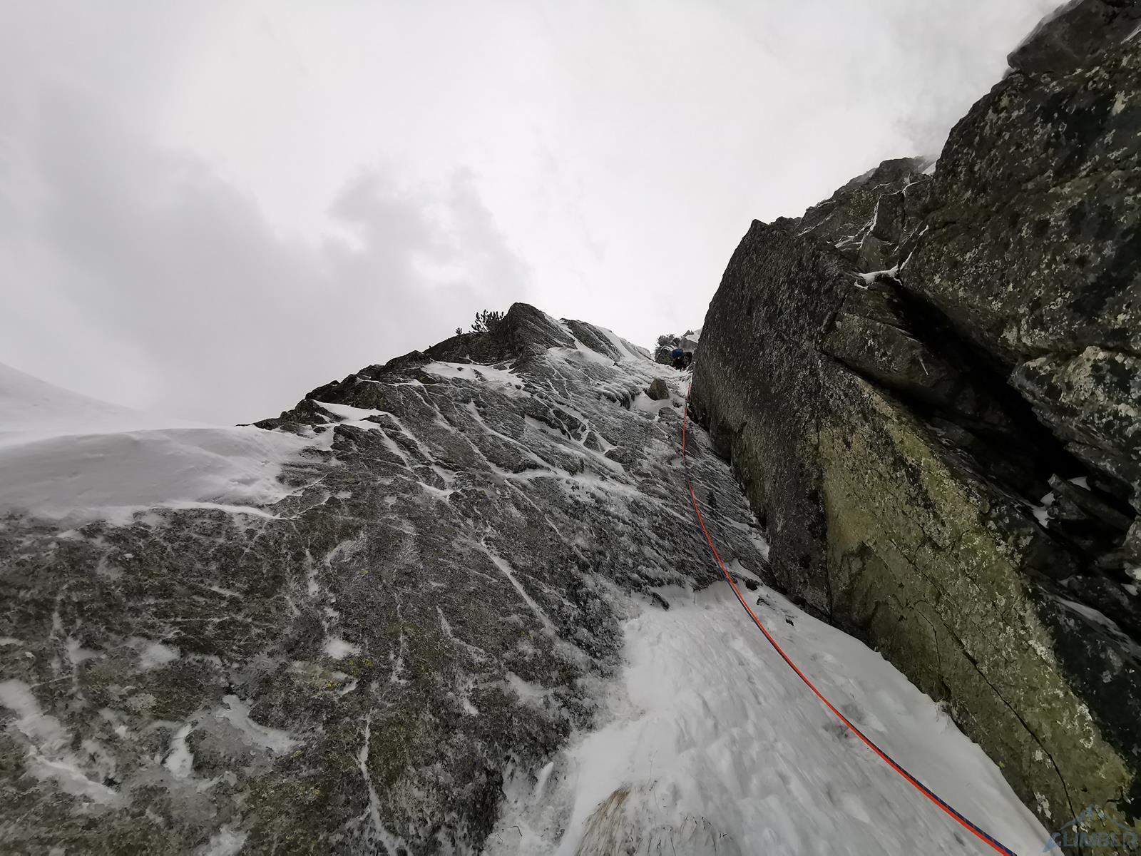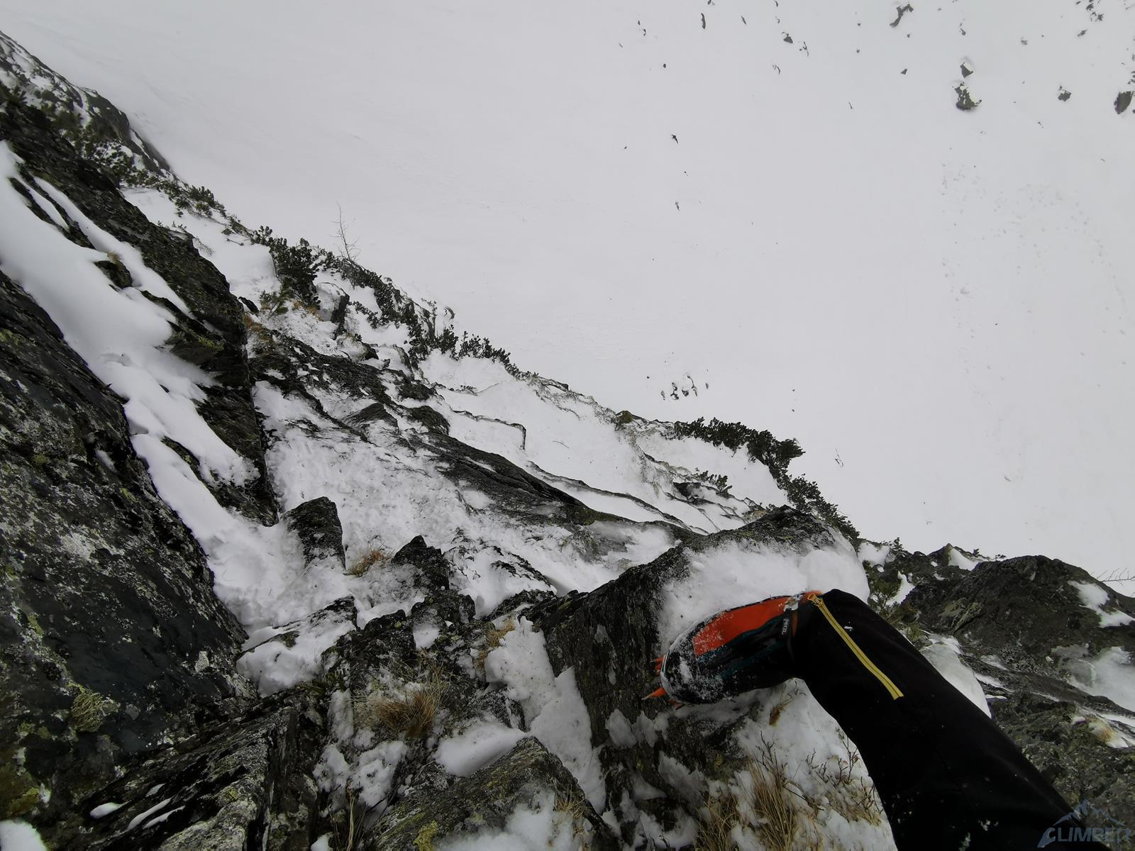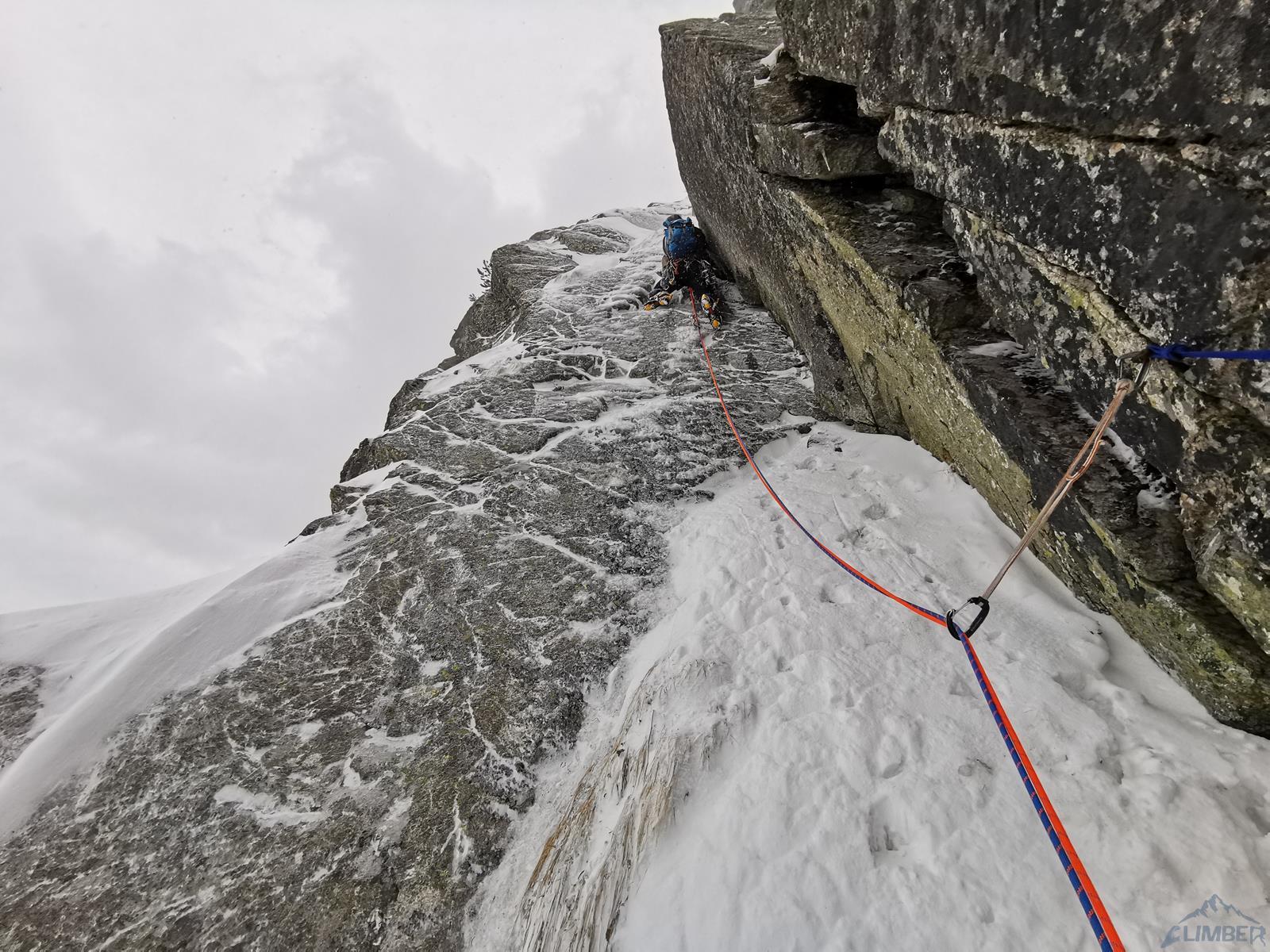 Drugi wyciąg (M5) zaczynamy do góry, po czym trawersujemy w lewo kruchym terenem – najpierw nieprzyjemną załupą, następnie do ścianki z przewieszoną kosówką. Po przejściu ścianki czeka nas kruchy, szeroki kominek oraz słabo asekurowalny (nawet mając haki) i wypychający trawers (raczej M6). Ponieważ chwyty są obłe i zalodzone, miejsce to łatwo się nie poddaje – lota zaliczam najpierw ja, później Szymon 😊. Po przejściu trawersu czeka nas jeszcze krótka ścianka i wyjście w łatwy teren, gdzie można zrobić stan. Śmiejemy się z siebie bo zakładaliśmy szybką i bezstresową akcję, tymczasem dwa nietrudne wyciągi dały nam popalić i zajęły 4 godziny – kolejny raz potwierdza się, że w zimie najczęściej „nie ma nic za darmo"!