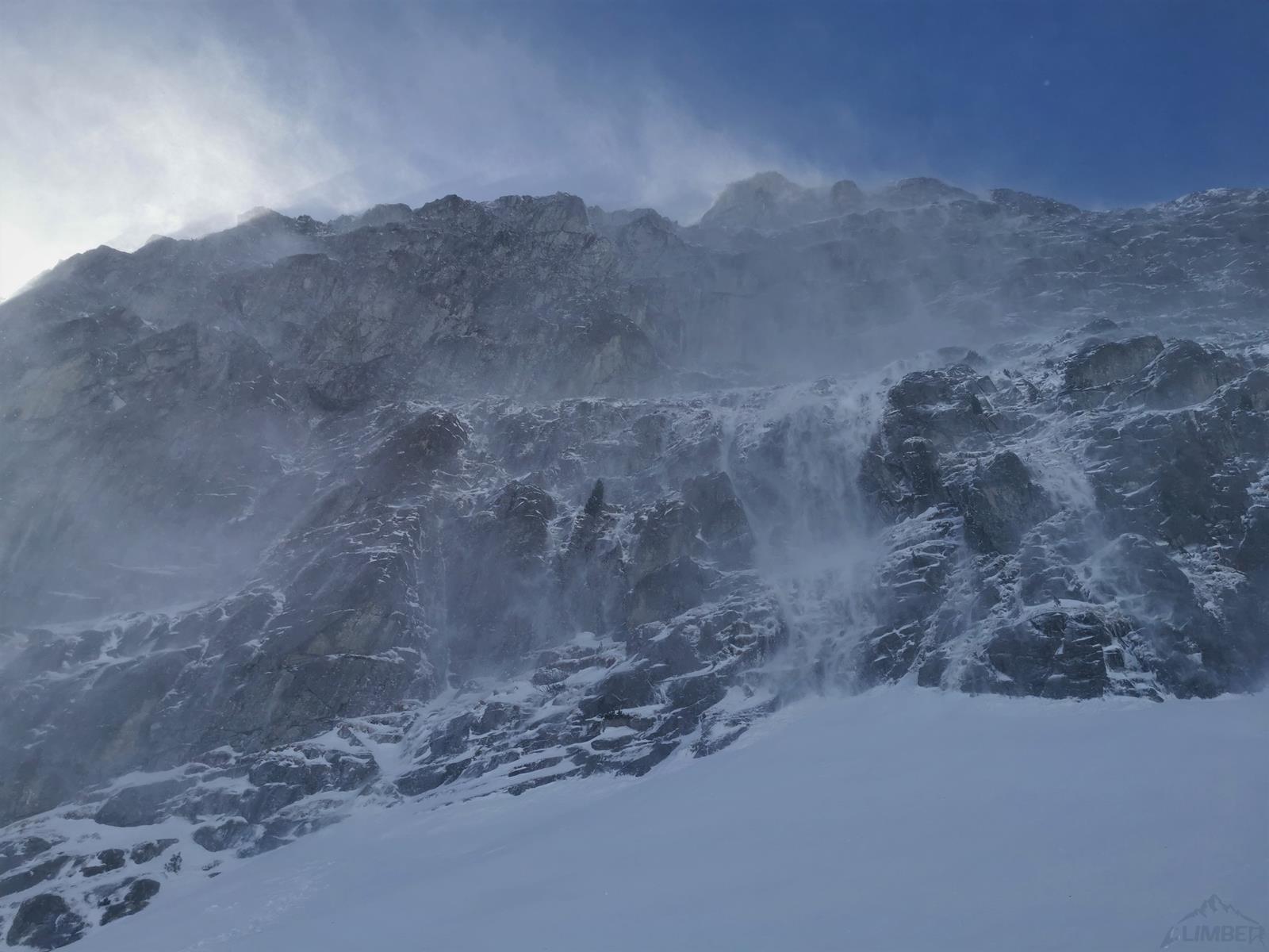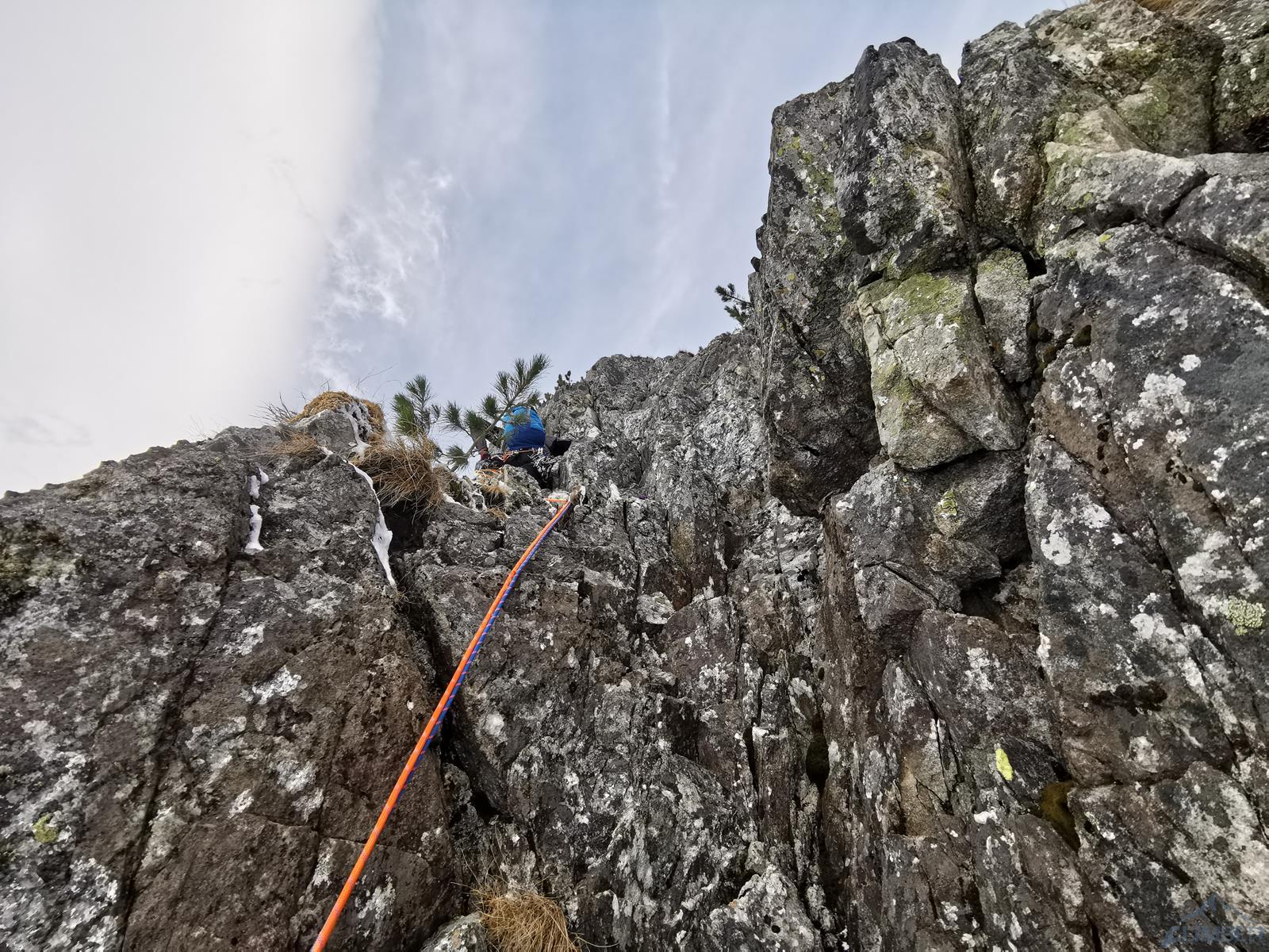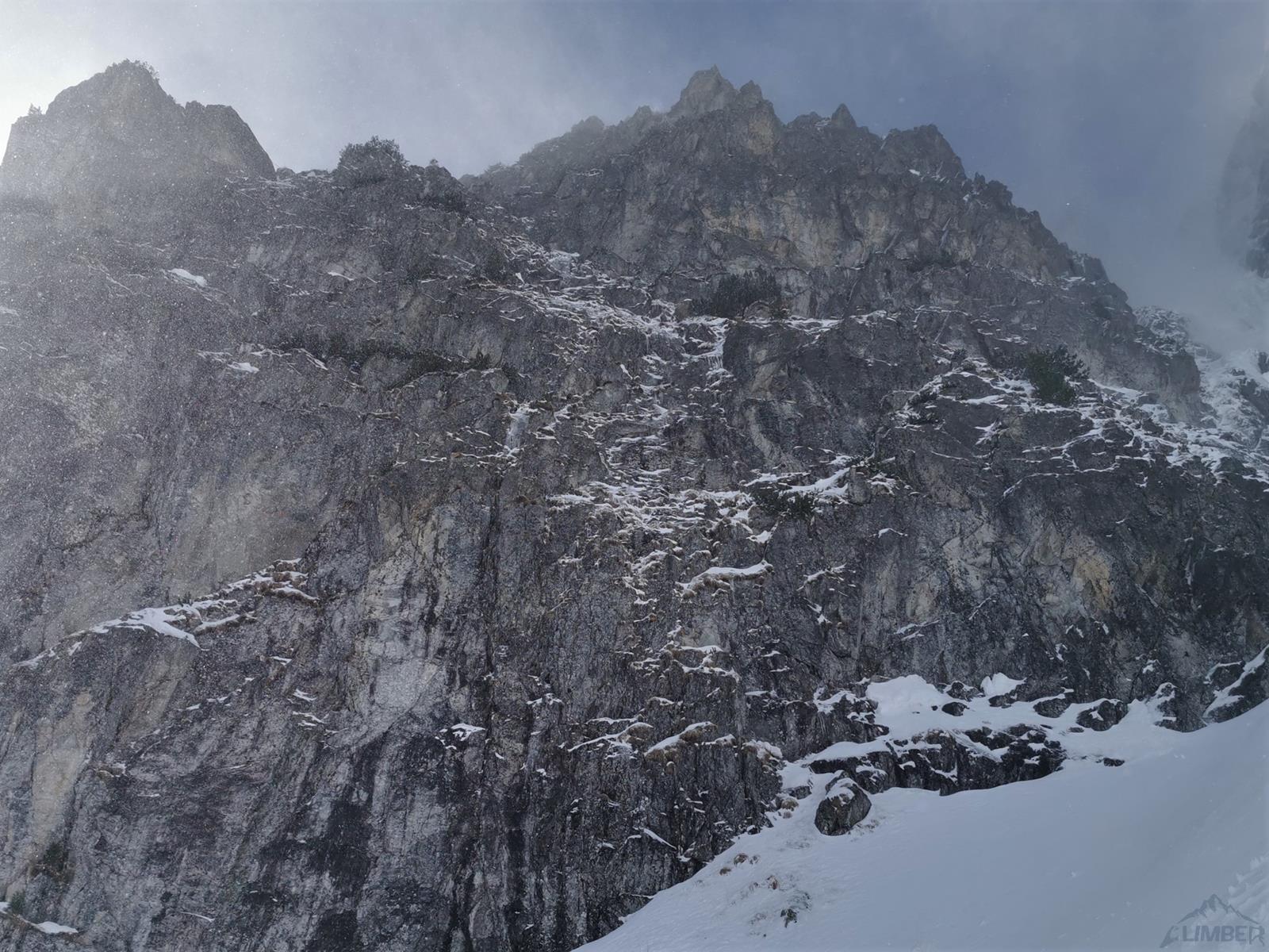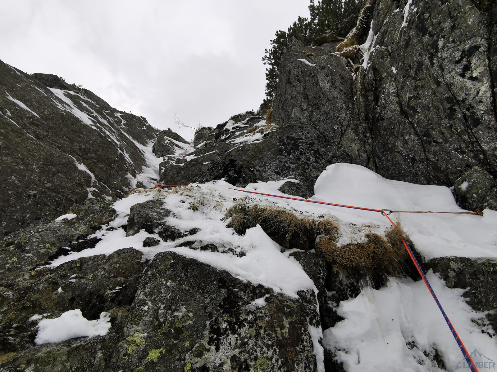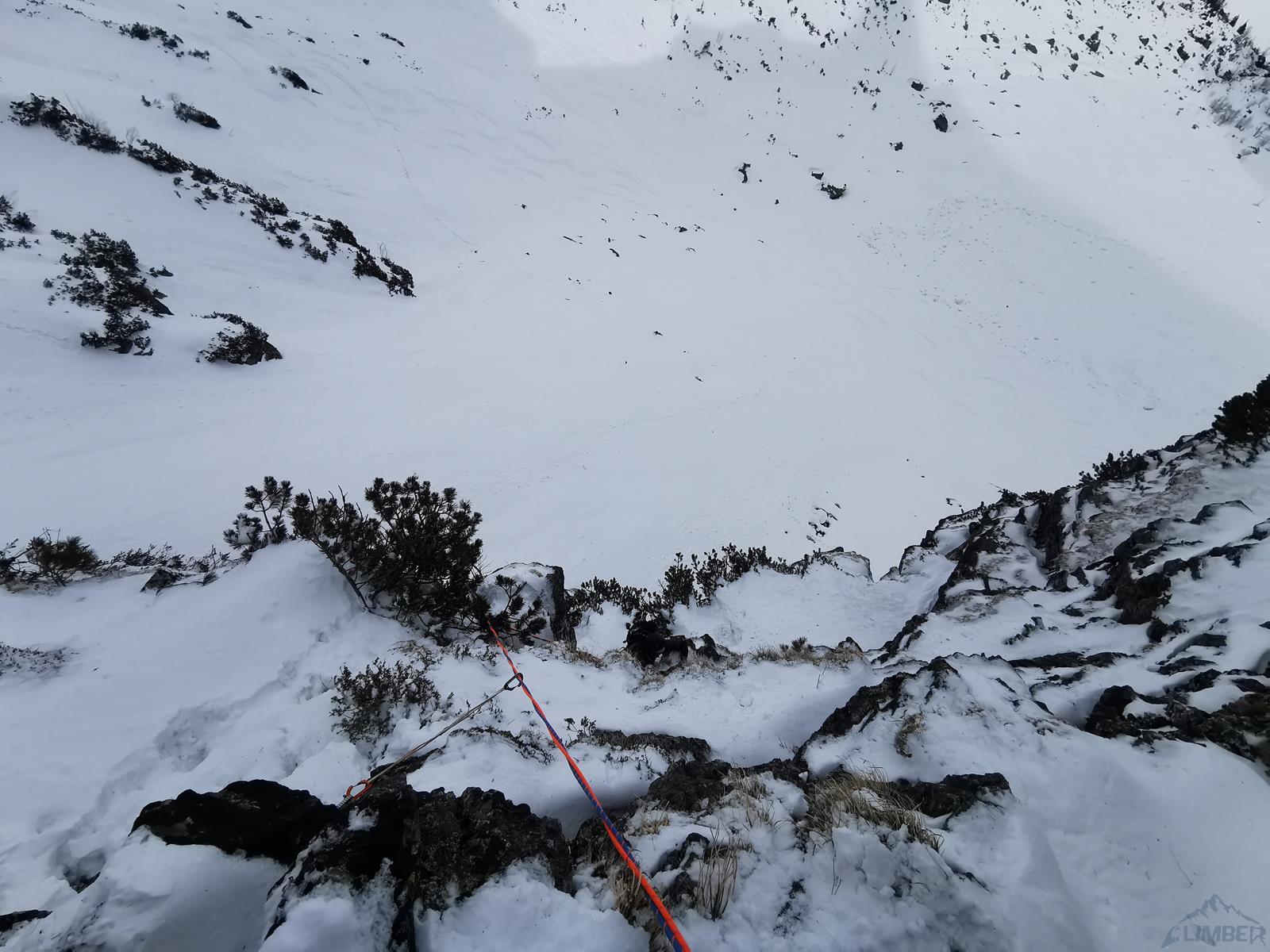 Drugi wyciąg (M5) zaczynamy do góry, po czym trawersujemy w lewo kruchym terenem – najpierw nieprzyjemną załupą, następnie do ścianki z przewieszoną kosówką. Po przejściu ścianki czeka nas kruchy, szeroki kominek oraz słabo asekurowalny (nawet mając haki) i wypychający trawers (raczej M6). Ponieważ chwyty są obłe i zalodzone, miejsce to łatwo się nie poddaje – lota zaliczam najpierw ja, później Szymon 😊. Po przejściu trawersu czeka nas jeszcze krótka ścianka i wyjście w łatwy teren, gdzie można zrobić stan. Śmiejemy się z siebie bo zakładaliśmy szybką i bezstresową akcję, tymczasem dwa nietrudne wyciągi dały nam popalić i zajęły 4 godziny – kolejny raz potwierdza się, że w zimie najczęściej „nie ma nic za darmo"!