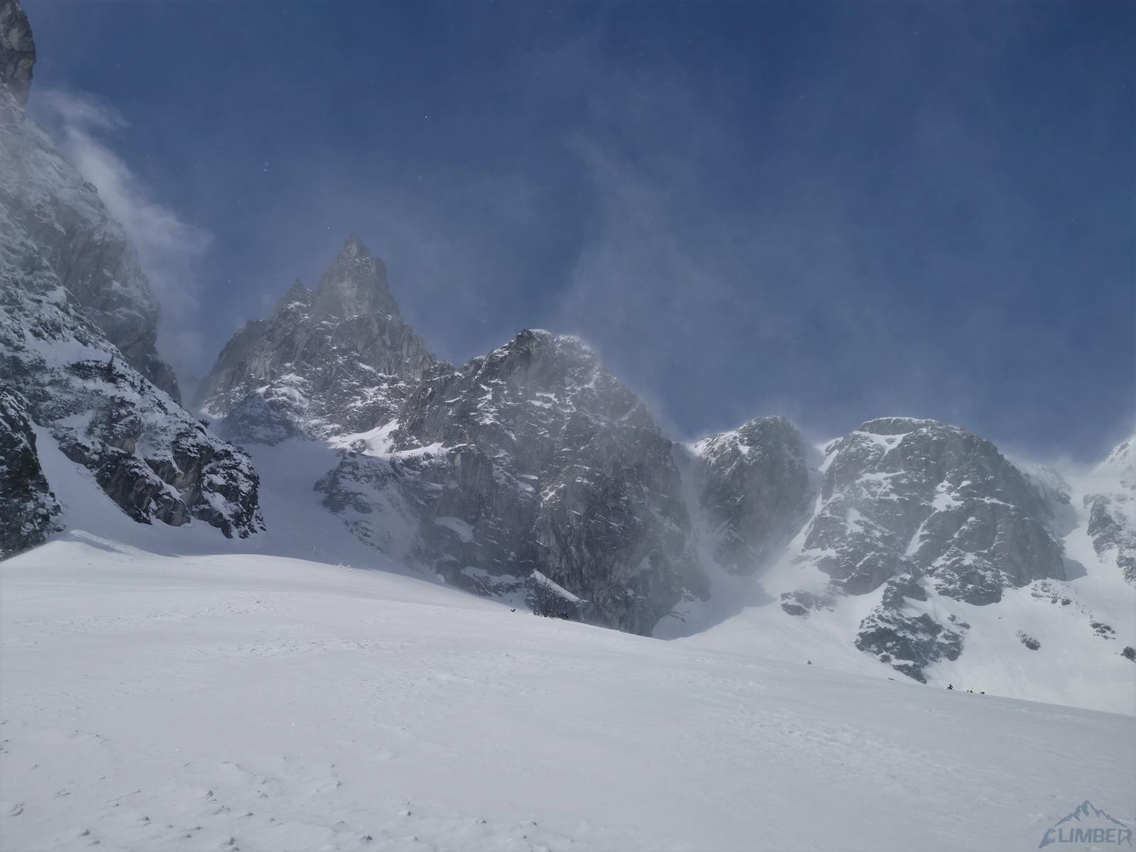 Dalej kontynuujemy łatwym śnieżno-trawkowym terenem i łączymy się z drogą Wesołej Zabawy – kolejne stanowisko zrobiliśmy dopiero w kociołku z trzema zacięciami, podchodząc trochę na lotnej. Tutaj spotykamy się z drugą ekipą uskuteczniającą wspinanie na Progu w lekkej dupówie – Anię wraz ze znajomymi kończących właśnie fajną Rysę Strzelskiego. W nasilającym się wietrze i w akompaniamencie pyłówek przechodzimy ostatni wyciąg – najpierw skalne zacięcie (M4), potem rynnę doprowadzającą na grań. Po wyjściu ze ściany szybko zmykamy do szlaku i nim do opustoszałego Moka oraz na parking.