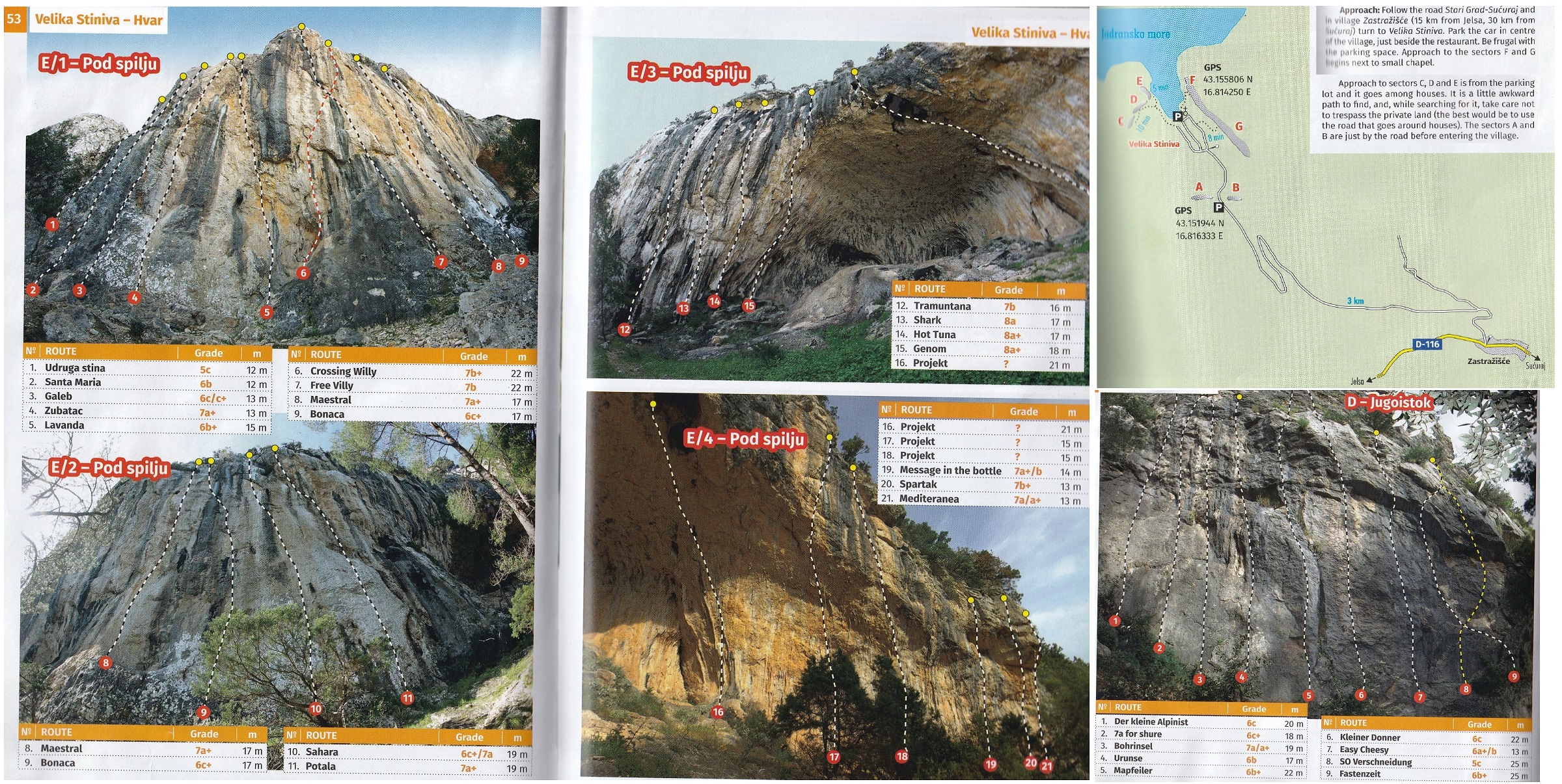 O rejonie Velika Stiniva nie napiszę za wiele - byliśmy tam zaledwie kilka godzin i zrobiliśmy kilka dróg w lewej części wystawionego na wschód sektora E, w tym jednego klasyka - Lavandę (6b+). Na pewno warte zrobienia będą położone na prawo od niej 7a i 7b (przyjechały na nie dwie inne ekipy), prawa część sektora - obok jaskinii - to miejsce dla zdecydowanie mocniejszych zawodników (drogi 8a/a+). Przeszliśmy się również pod sektory C i D - wyglądały jednak tak sobie, na pewno dużo większy potencjał i świetne drogi oferują położone po drugiej stronie wioski sektory F i G - będące miejscem dalszej eksploracji.