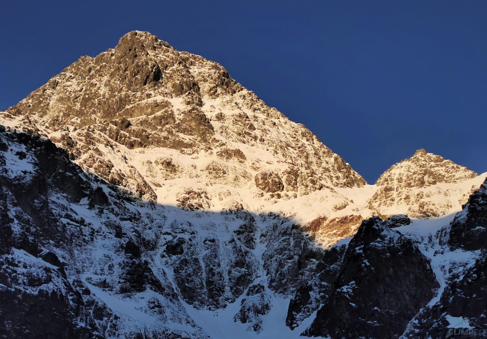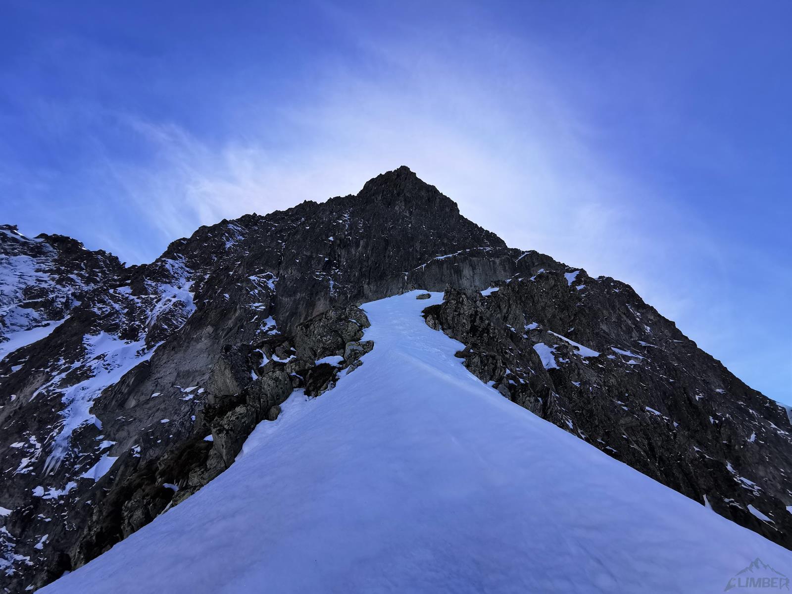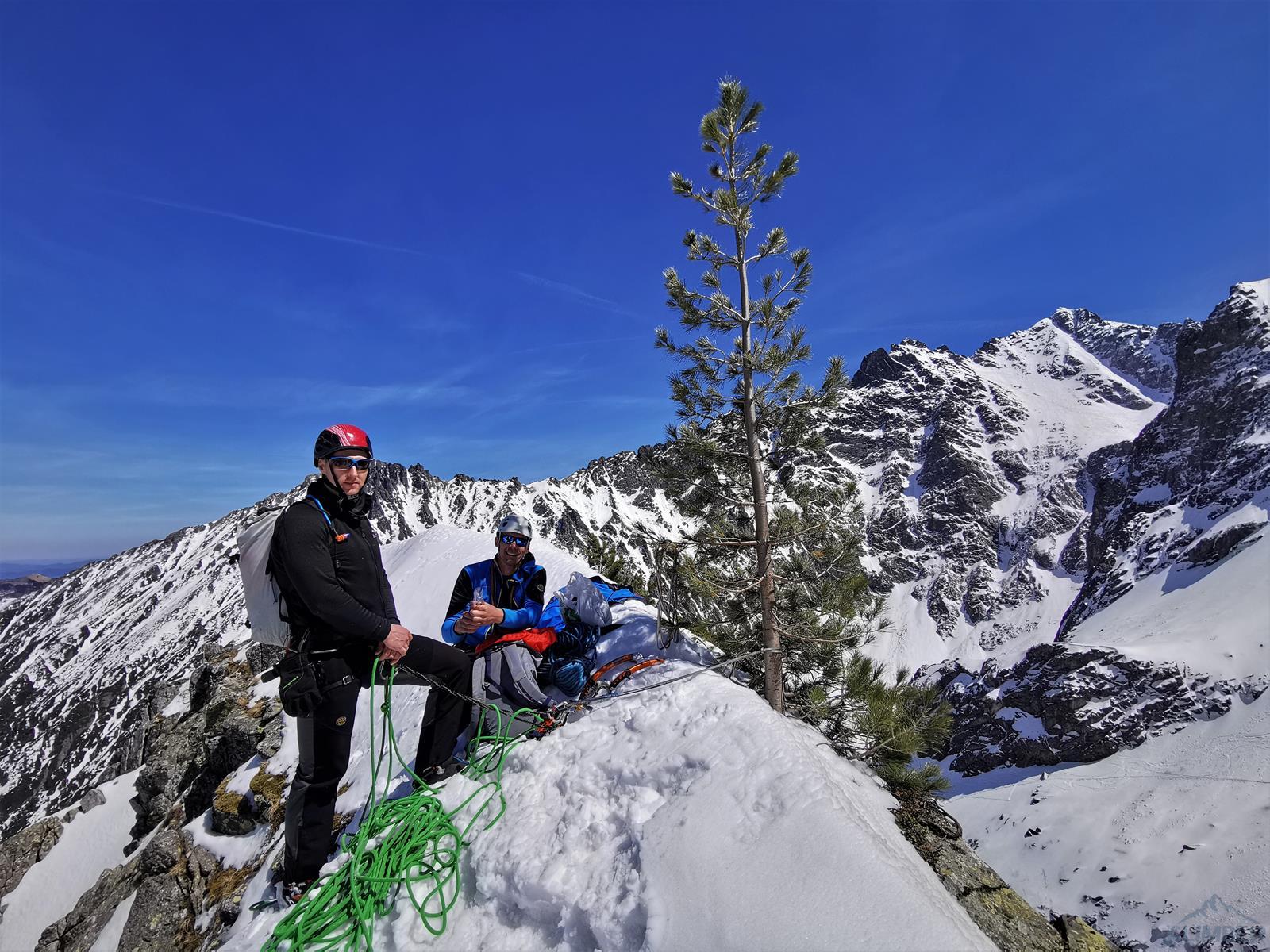 Ostatni wyciąg (ok. M4, 50 metrów) prowadzi skośnie w prawo skalnymi depresjami, po drodze mijamy kilka „ciekawych” miejsc jak bardzo ciasny kominek czy niespodziewana przewieszka – ku naszej uciesze dzielnie spisujący się Szymon po jego przejściu melduje wyjście w łatwy teren podszczytowy. Docieramy do kolegi i ruszamy w kierunku głównego wierzchołka (2438 m.), który osiągamy kilka minut później . Na grani wita nas mocny wiatr, który wcześniej co jakiś czas zrzucał na nas pyłówki – nie zabawiamy więc na MSW za długo i zaczynamy żmudne zejście.