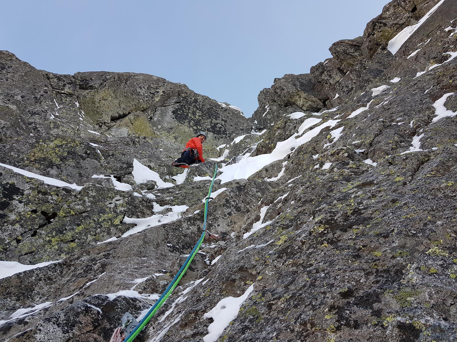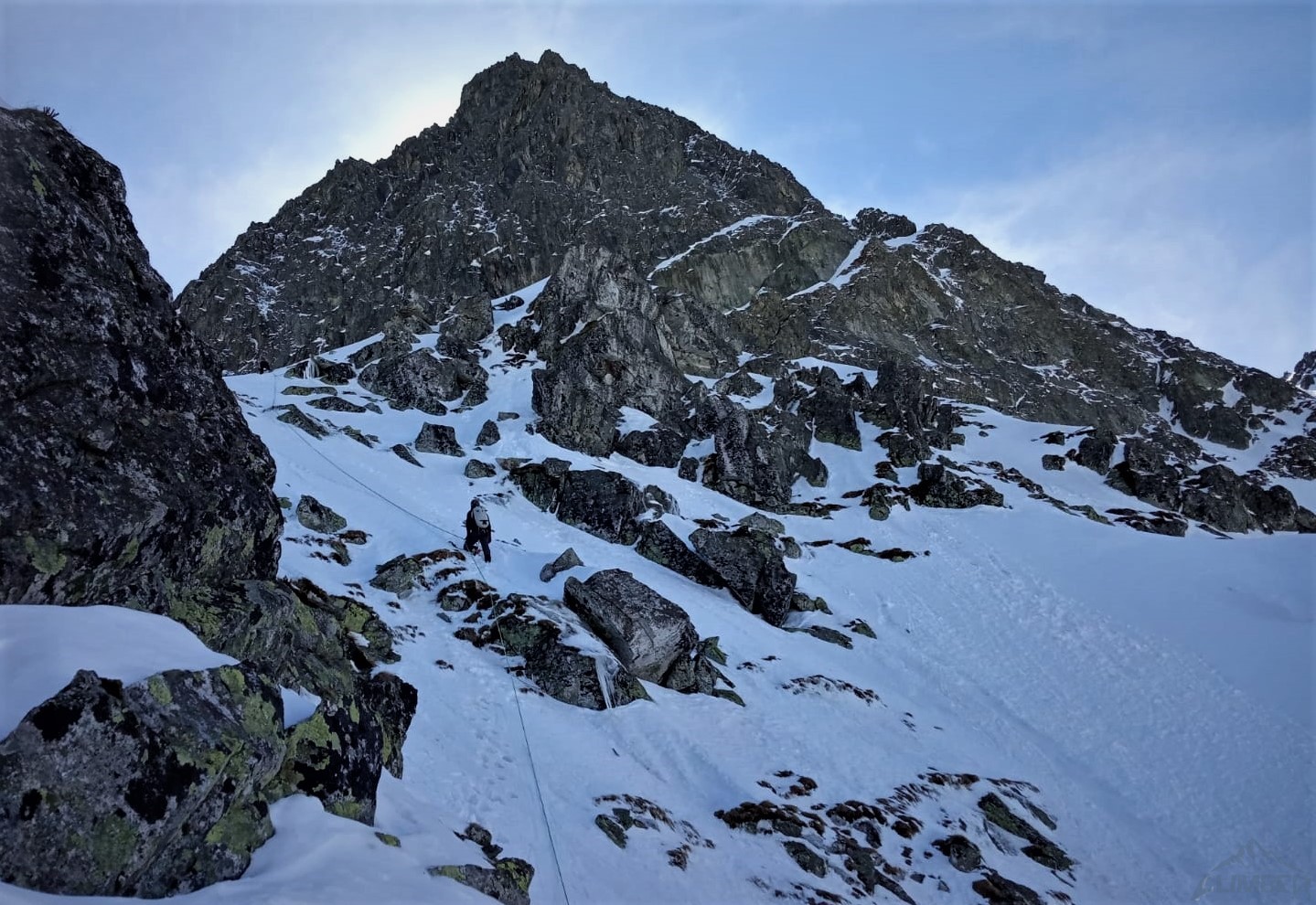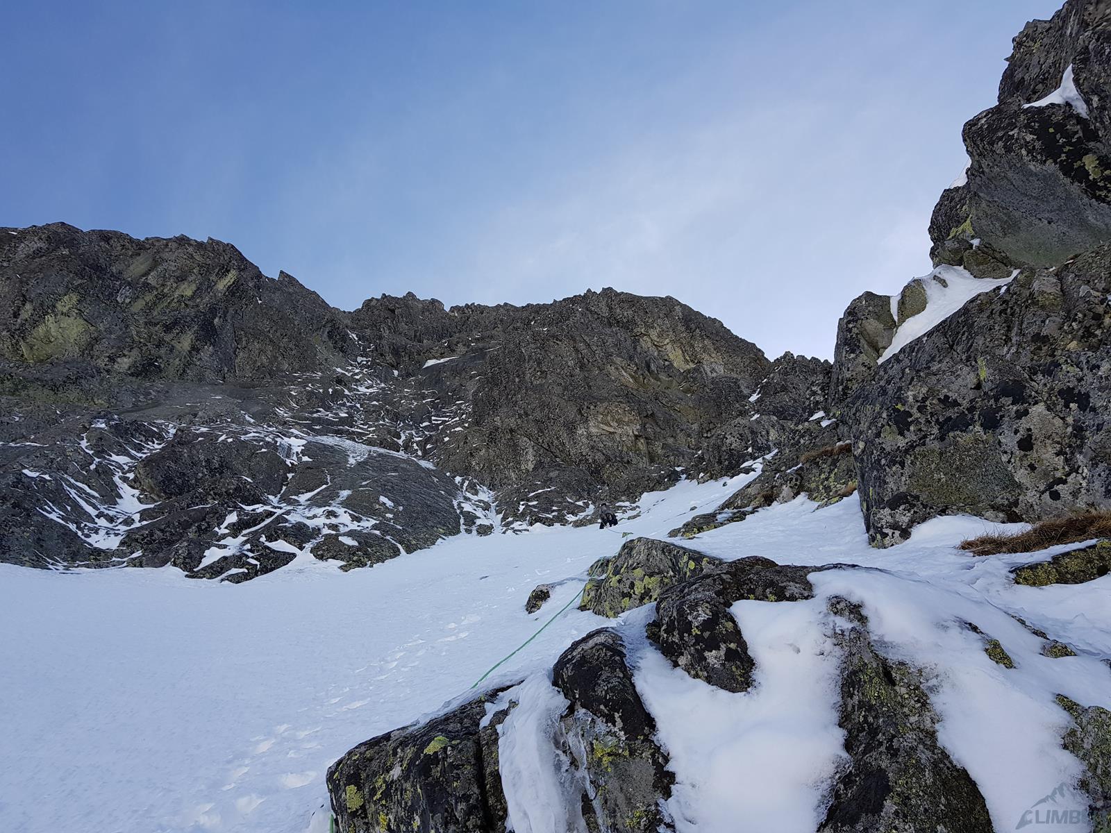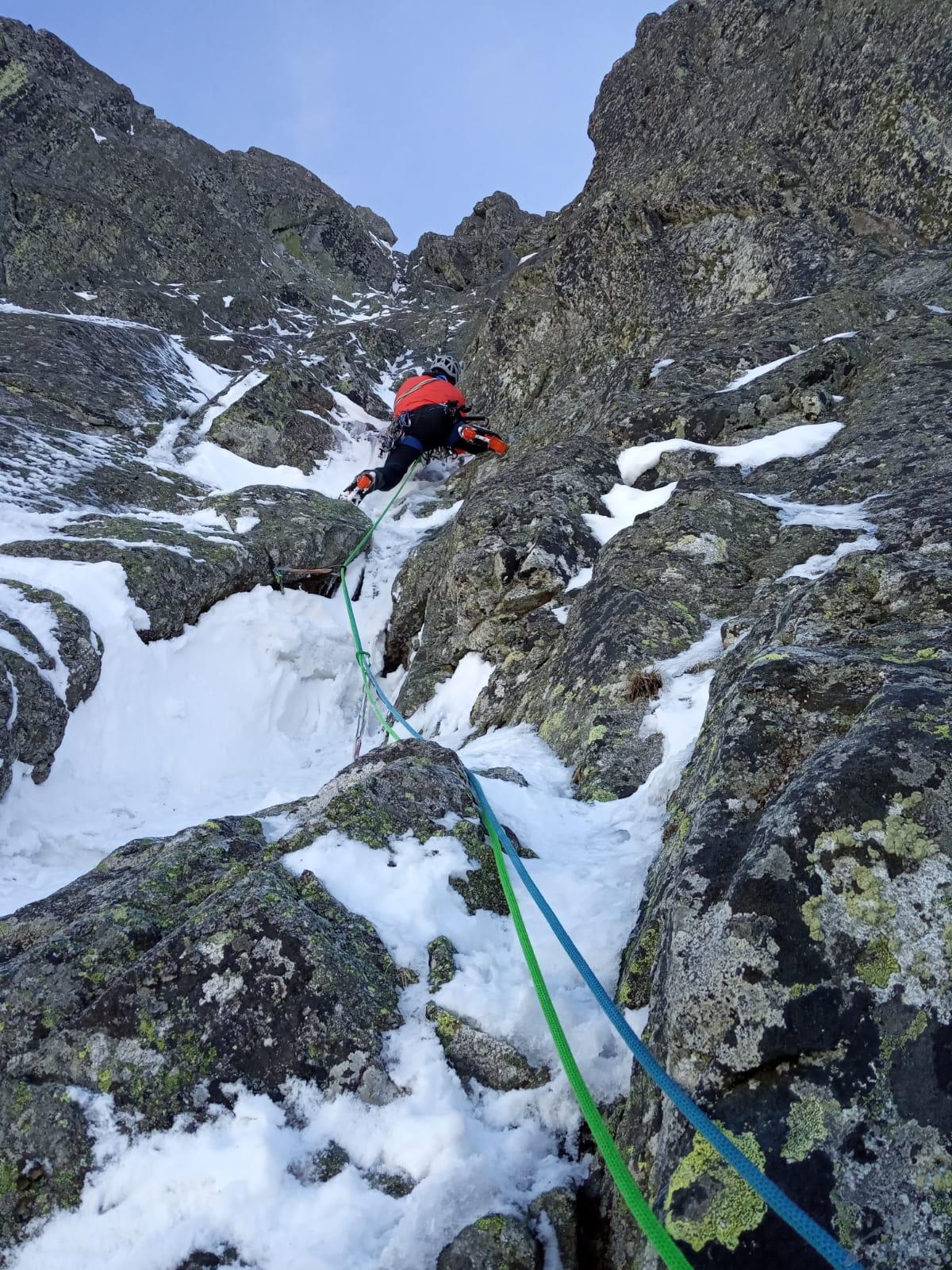Wspinanie rozpoczynamy na wysokości ok. 1560 metrów, od pokonania ścianki znajdującej się pod Wielkim Kominem. Istnieje kilka sposobów jej przejścia, my wybieramy ten najbardziej narzucający się – wprost, oznaczony jako 1C w Mastertopo. Prowadzący dolną część drogi Michał sprawnie pokonuje zacięcie oraz płytkę (bardzo fajne wspinanie za ok. M5 z dobrą asekuracją) i łatwym już terenem dochodzi do gotowego stanowiska u wylotu żlebu opadającego spod komina. Początkowo asekurujemy go na kolejnym odcinku stąd, finalnie jednak podchodzimy kilkanaście metrów pod sam komin by lina nie dyndała w powietrzu oraz by łatwiej reagować na poczynania drugiego zespołu, który od dłuższego czasu walczy powyżej. Chłopaki odpuszczają gdy prowadzący zalicza nieprzyjemny lot i po chwili zostajemy sami.