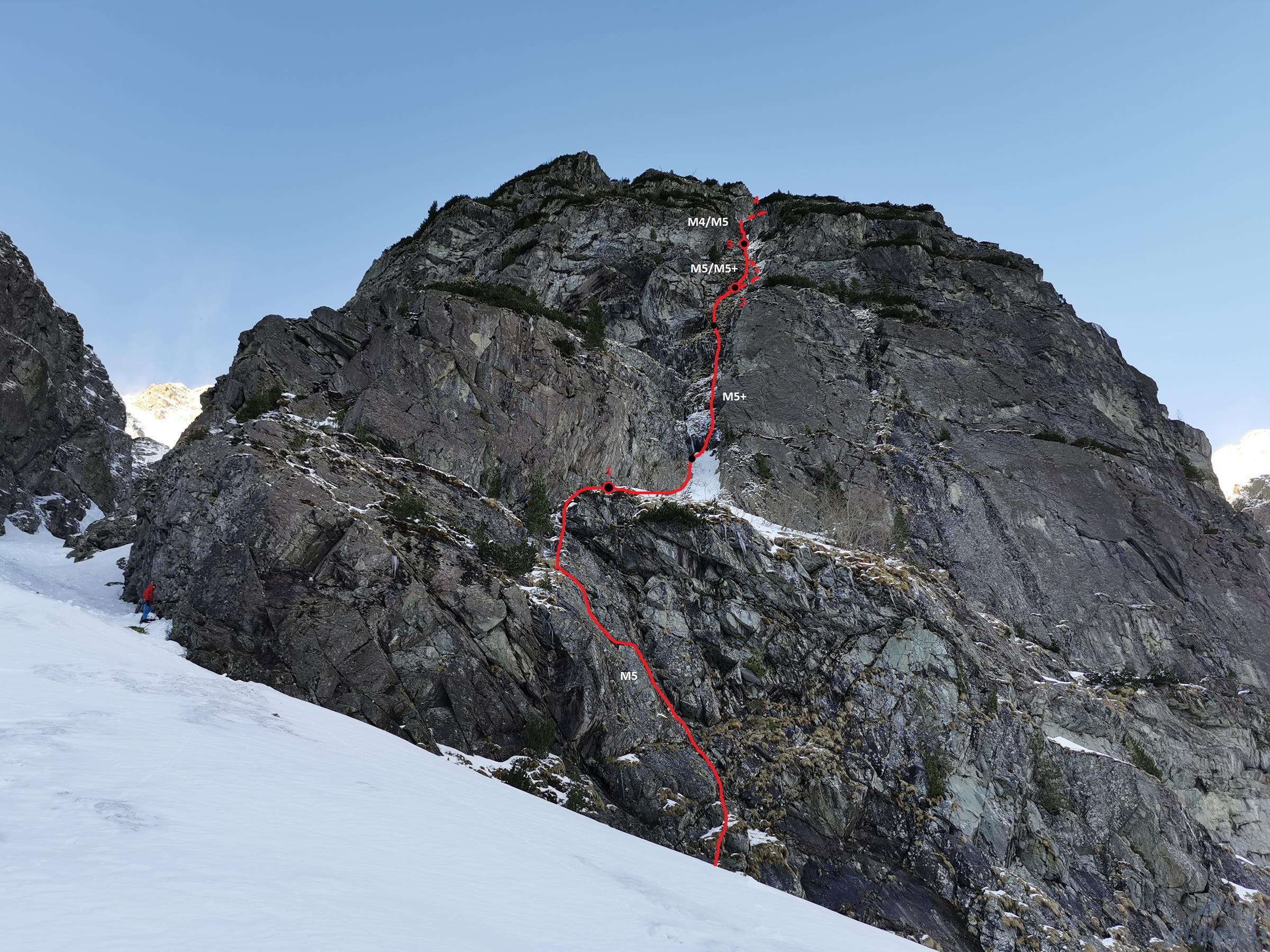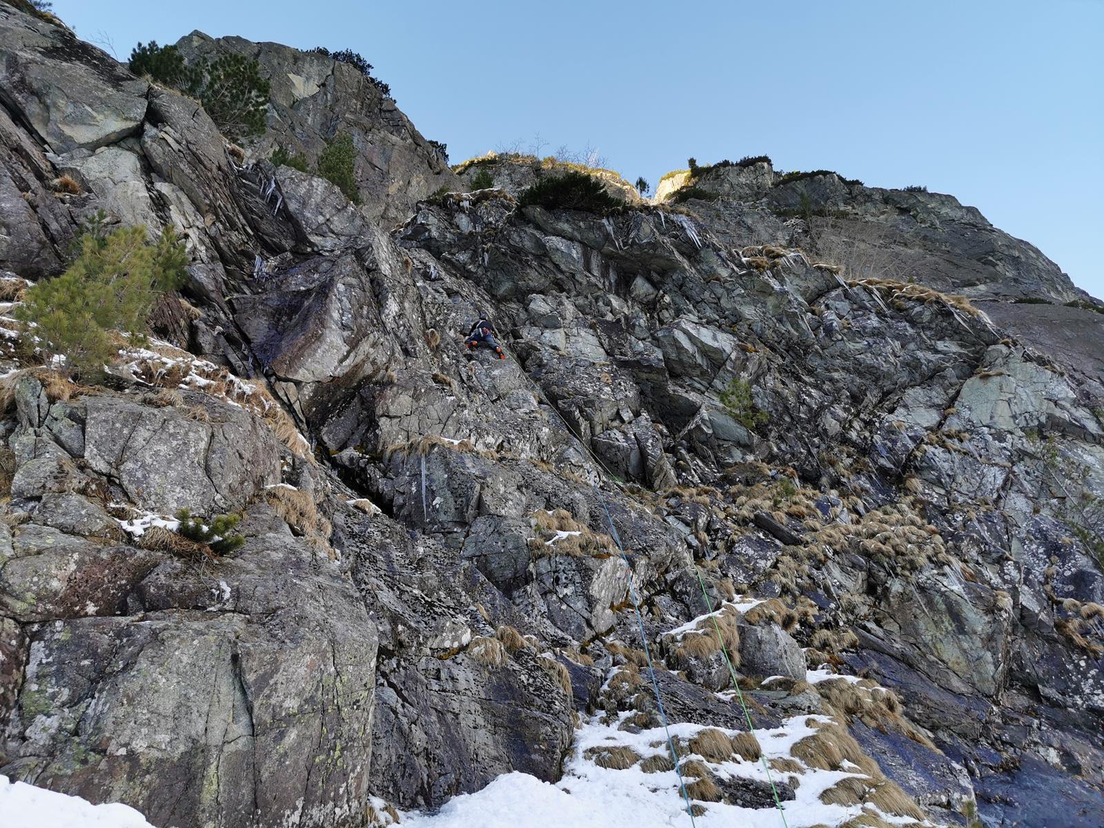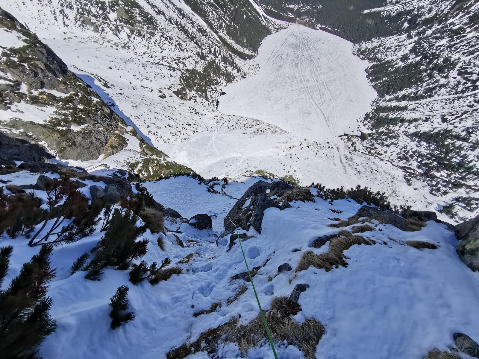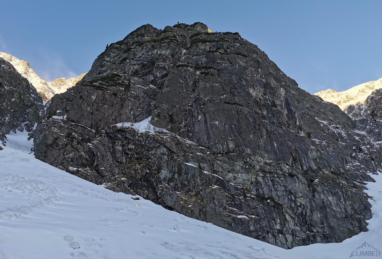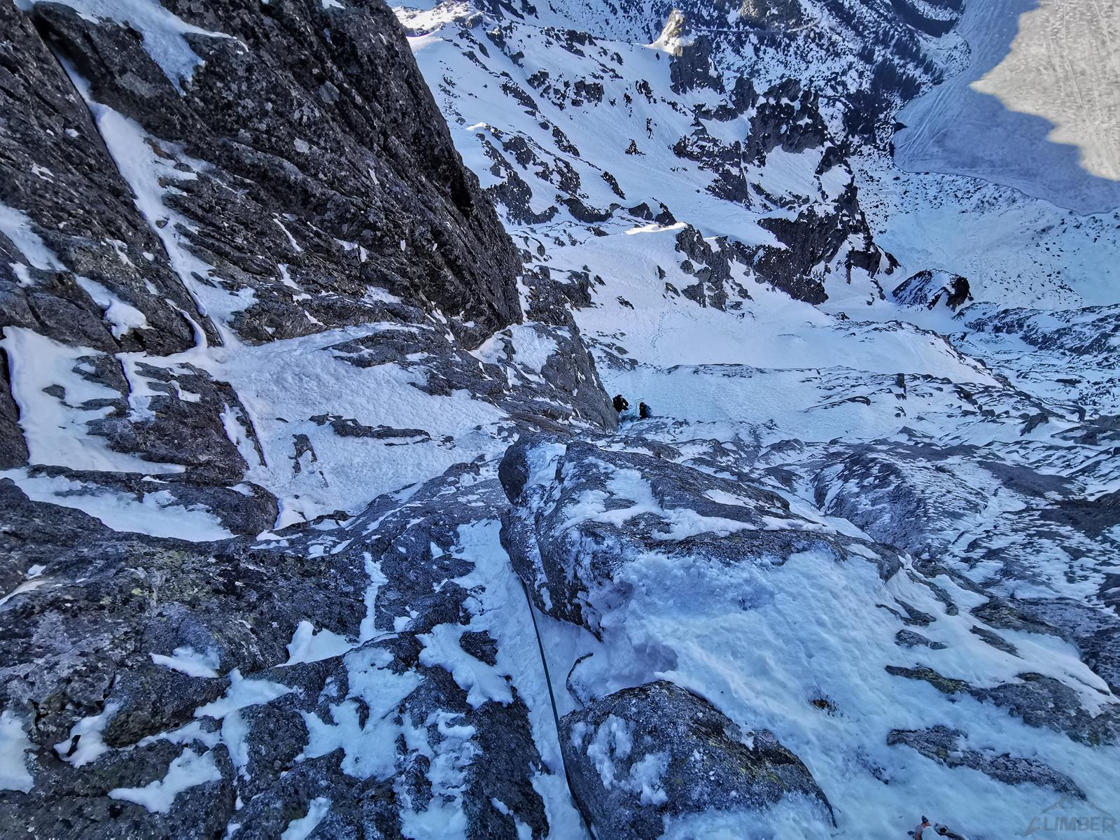 Wspinanie rozpoczynamy na wysokości ok. 1560 metrów, od pokonania ścianki znajdującej się pod Wielkim Kominem. Istnieje kilka sposobów jej przejścia, my wybieramy ten najbardziej narzucający się – wprost, oznaczony jako 1C w Mastertopo. Prowadzący dolną część drogi Michał sprawnie pokonuje zacięcie oraz płytkę (bardzo fajne wspinanie za ok. M5 z dobrą asekuracją) i łatwym już terenem dochodzi do gotowego stanowiska u wylotu żlebu opadającego spod komina. Początkowo asekurujemy go na kolejnym odcinku stąd, finalnie jednak podchodzimy kilkanaście metrów pod sam komin by lina nie dyndała w powietrzu oraz by łatwiej reagować na poczynania drugiego zespołu, który od dłuższego czasu walczy powyżej. Chłopaki odpuszczają gdy prowadzący zalicza nieprzyjemny lot i po chwili zostajemy sami.