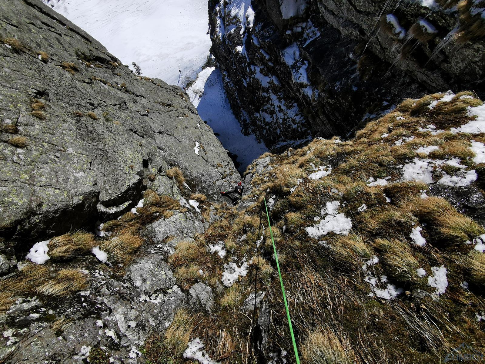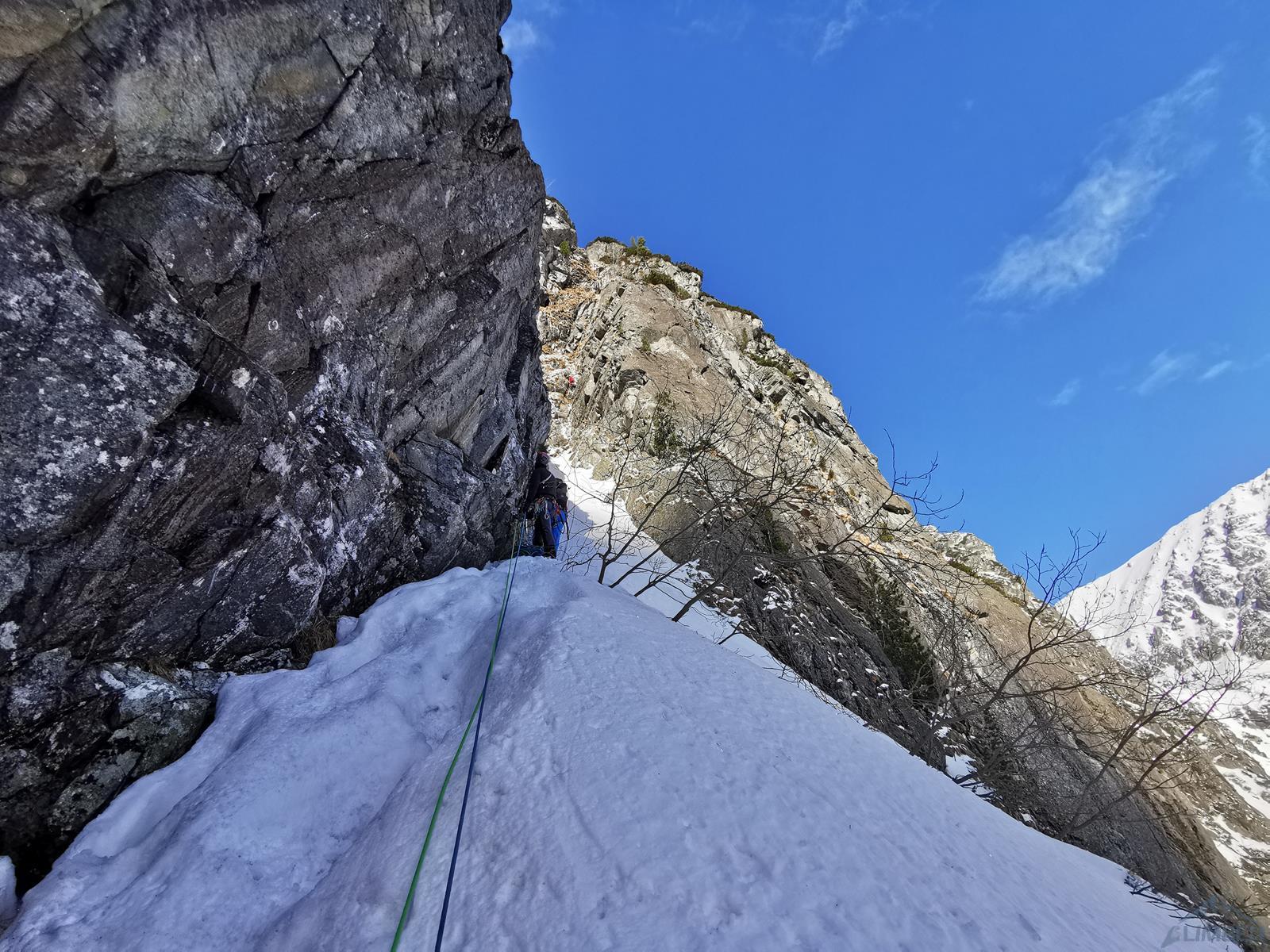 W dniu naszego przejścia i dzień przed nim prawdziwe oblężenie przeżywała wspomniana Direta – zarówno Płytowe Zacięcie, jak i Rynna Wawrytki były świetnie wylane lodem, dzięki czemu drogę można było wręcz przebiec na lotnej lub bez liny – rekordy padały więc jeden po drugim! Filar przejścia w tym sezonie raczej nie miał, za wielu chętnych nie było też w ostatni typowo zimowy weekend. Tuż przed nami próbował jeszcze jeden zespół i szybko wycofał się z paskudnych traw w Wielkim Kominie, mocno opóźniając naszą akcję i zmuszając do zastanowienia się nad pójściem w jego ślady. Decydujemy w końcu by wspinać się dalej i rozważyć odwrót najpierw nad Czołówką, a następnie pod spiętrzeniem szczytowym – w obu przypadkach świadomie kontynuujemy, zdając sobie sprawę z konsekwencji w postaci długiego czasu przejścia, sporej ilości pracy oraz nadszarpniętych nerwów 😉.