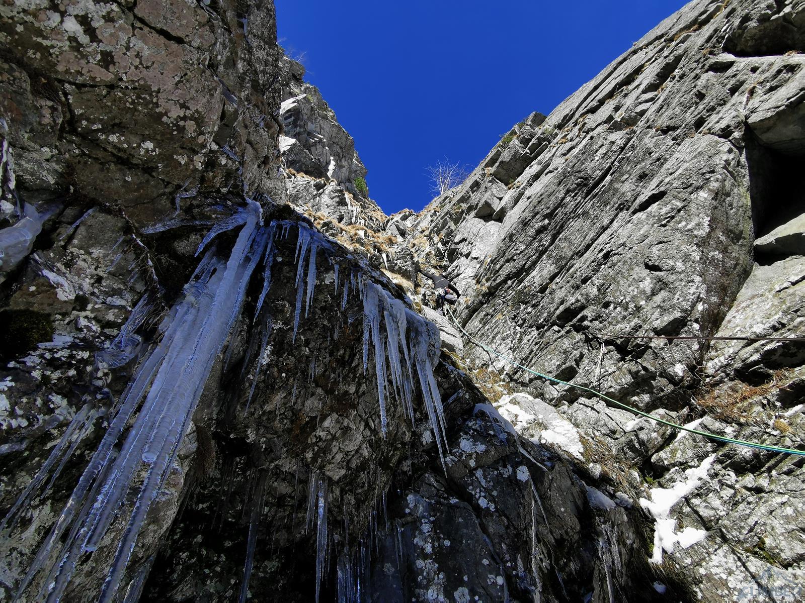 Prowadzenie przejmuje Szymon – po bulderowym wyjściu z Kominka (ok. M4+) czeka go sporo roboty z odśnieżaniem i kruszeniem lodu, na dodatek postanawia urozmaicić sobie wyciąg i zamiast do łatwego żlebu, ładuje się w płytową załupę... Kolejny stan (po ok. 40 metrach) wypada nam pod zalanym lodem płytkim kominkiem, po wejściu do którego kolega funduje nam prawdziwe bombardowanie lodowymi odłamkami. Mimo niewygórowanych trudności (M3/M4, ok. 50 metrów), z powodu dodatkowej roboty przy czyszczeniu, lina do góry przesuwa się bardzo powoli – w końcu dopada nas ciemność. Jakby wrażeń było mało, całkiem znienacka, Michała dopada pewna nieprzyjemna przypadłość, a półwiszący stan dodaje całej sytuacji kolorytu 😊.