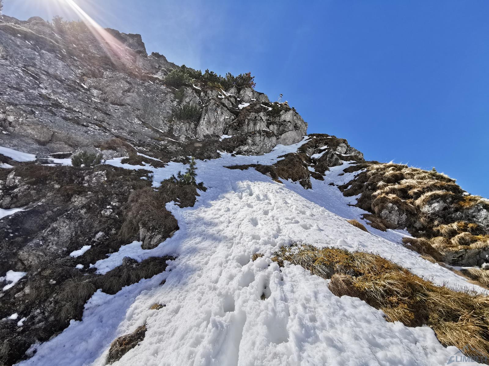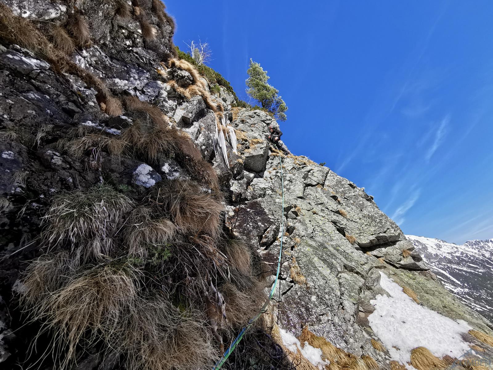 Wyciąg (M5+) okazuje się jednym z gorszych jakie mieliśmy okazję przechodzić w Tatrach – operujące o tej porze roku wysoko Słońce świeci prosto do komina, co powoduje iż liche kępki traw po których trzeba się wspinać wypadają jedna za drugą, podobnie jak luźne kamienie. O asekuracji lepiej nie wspominać, Michał po prowadzeniu jąkał się przez kolejny tydzień 😉. Kolejny odcinek (M5/M5+) nie jest lepszy – tutaj by ominąć najsłabsze trawy w jednymi miejscu schodzimy na letni wariant po płycie, w rakach okazuje się bardzo ciekawie. Na czwartym wyciągu czeka nas jeszcze bulderowe przewinięcie przez Górną Nyżę – ponieważ śnieg po prawej to mokra breja, wybieramy przewieszkę po lewej (solidne M5, w prawo przy dobrym śniegu ok. M4), gdzie wykazać trzeba się pomysłowością. Po wyjściu z trudności lądujemy na Trawniku nad Czołówką, nad którym czeka nas około 1000 metrów (500 deniwelacji) do przejścia na lotnej pod kopułę szczytową.