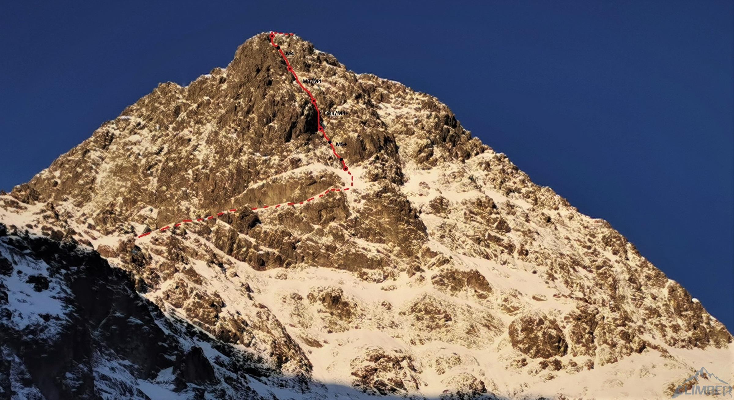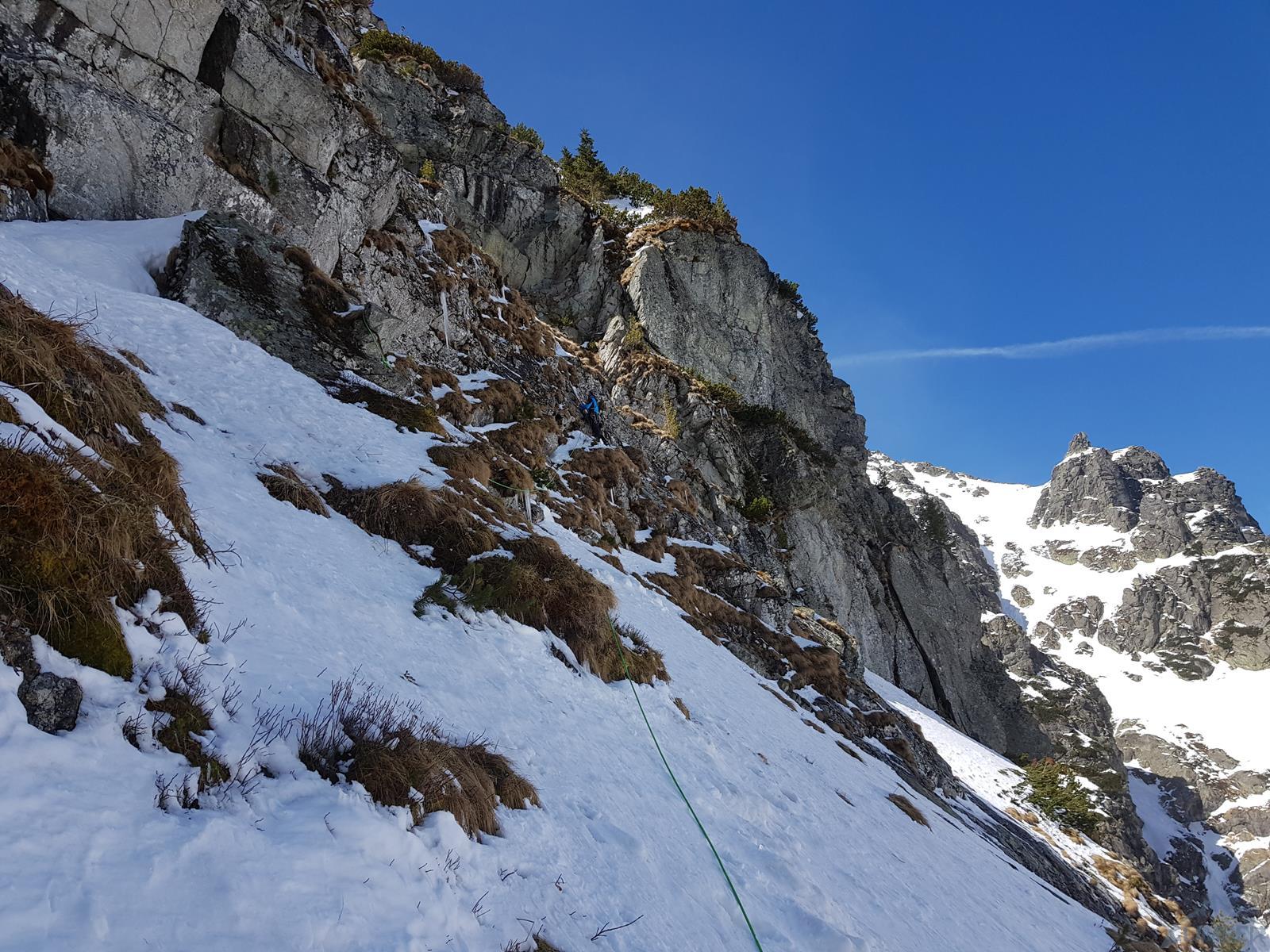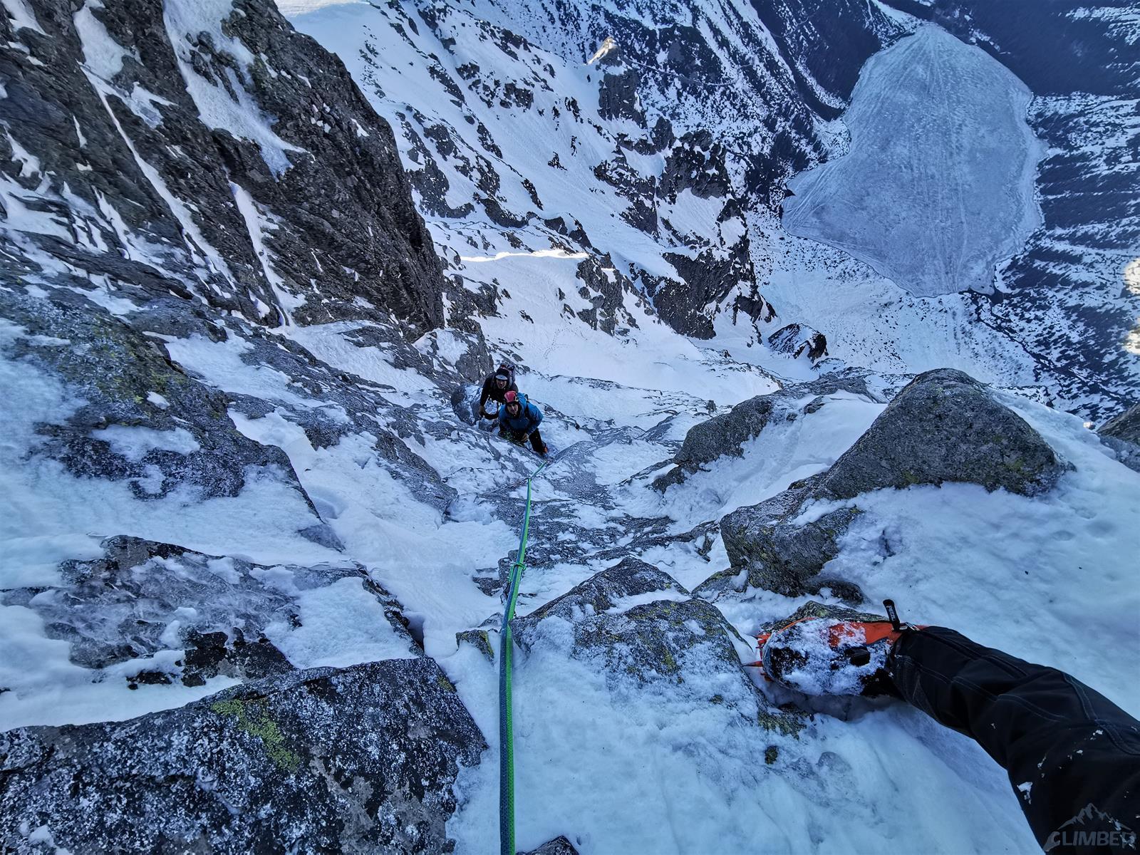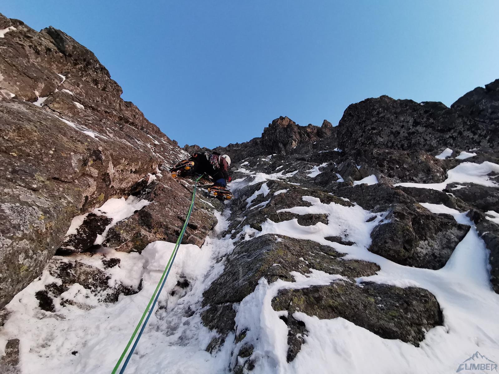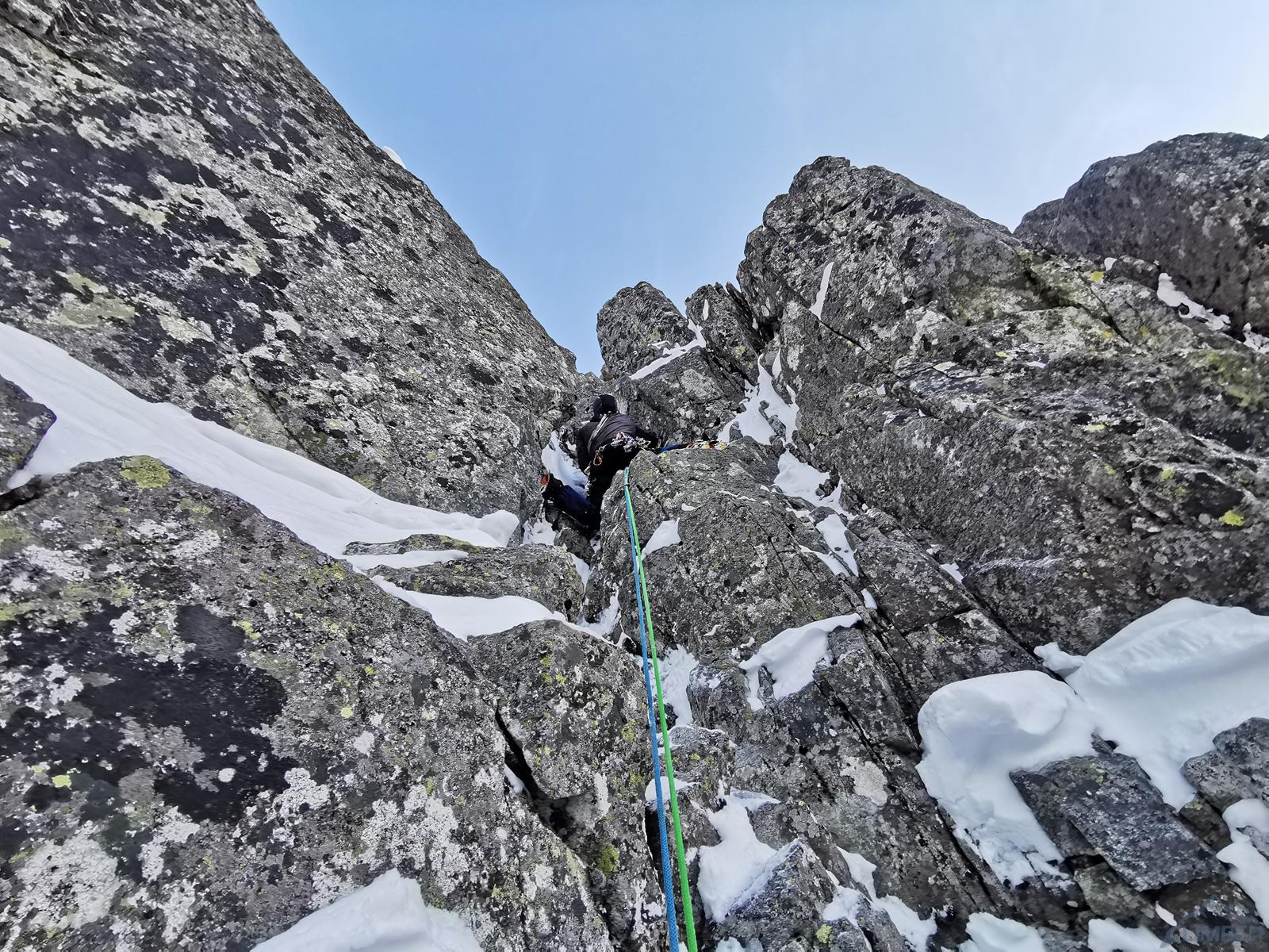 Kolejny wyciąg (M5+) okazuje się wymagający – zarówno wspinaczkowo, jak i asekuracyjnie. Długotrwałe odśnieżanie płyt i rys, bicie haków i reksów gdy tylko pojawia się taka opcja (pozostały sprzęt w zastanych warunkach za bardzo się nie przydaje) i powolne przesuwanie się do góry metr po metrze. W kilku miejscach jest bardzo czujnie, udaje się jednak nie polecieć i po ok. 20 metrach osiągam wygodną półkę, na której można odpocząć lub zrobić stan pośredni. Nad półką czeka jeszcze jeden trudniejszy fragment, po którym chwyty są już znacznie pewniejsze – aż do stanowiska pod Krótkim Kominkiem. Trudności za nami, nadal do szczytu mamy jednak jeszcze około 150 metrów wcale niebanalnego wspinania. Pozostaje cierpliwie robić swoje i zamiast narzekać na zimno czy zmęczenie - cieszyć się przygodą!