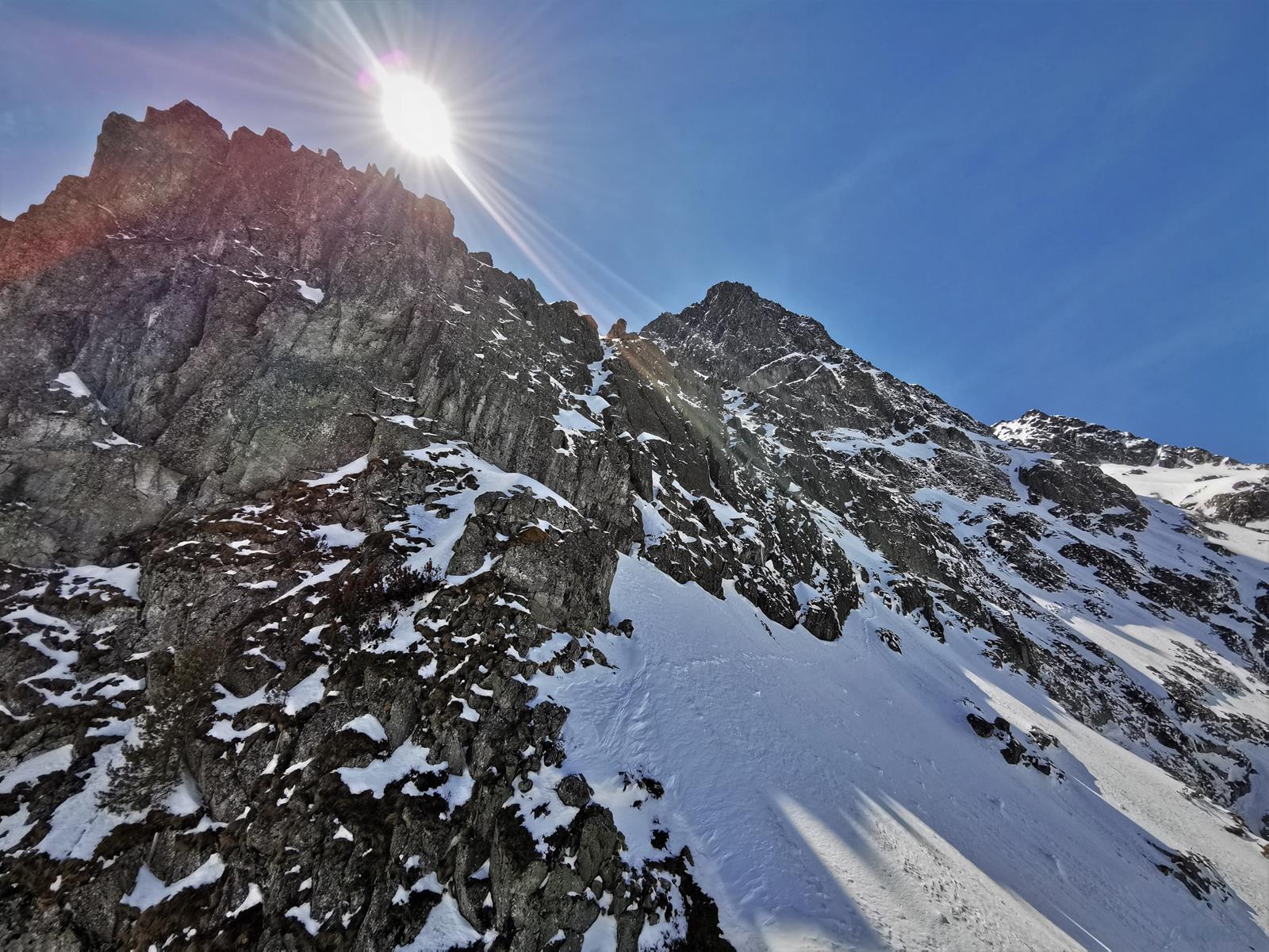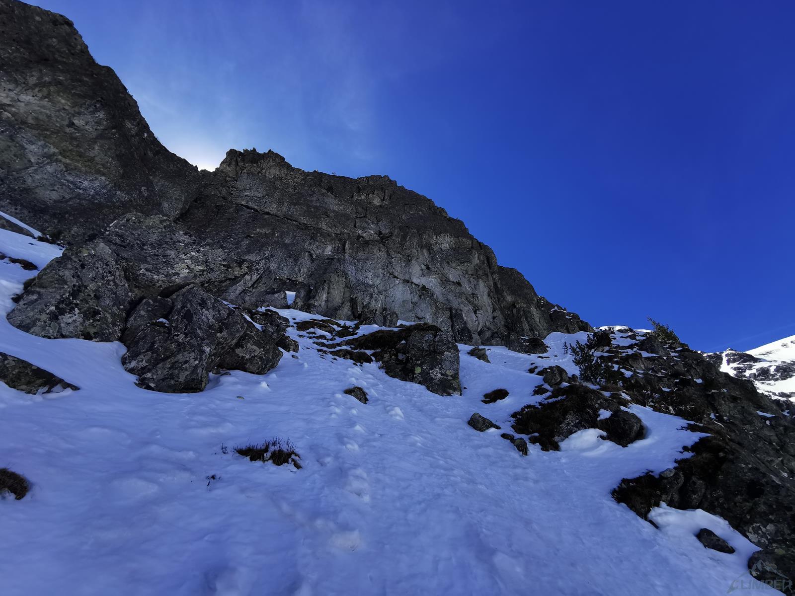 Chowamy jedną linę do plecaka, wiążemy się w trójkę do drugiej i ruszamy – idę pierwszy, podejmując się szukania linii drogi. Miejscami jest to ułatwione - dzięki pozostałościom po śladach innego zespołu, który podjął próbę przejścia Filara trzy tygodnie wcześniej. Po ostatnim opadzie śnieg nie jest jednak zbyt dobry i o betonach możemy tylko pomarzyć. Na szczęście przebieg drogi jest świetnie rozrysowany w Mastertopo, a wątpliwości dotyczą tylko pojedynczych miejsc oraz dojścia w okolice Bandziochowej Strażnicy, gdzie jest sporo opcji. Cały teren od Trawnika do grani jest w większości jedynkowo-dwójkowy, miejsca trójkowe zdarzają się sporadycznie i wynikają raczej z wyboru mniej optymalnej konfiguracji przejścia. Zdarza mi się to już na dojściu do Siodełka nad Czołówką (ok. 1790 m.), gdzie z powodu słabego śniegu wspinam się w załupie tuż przy Górnej Ścianie.