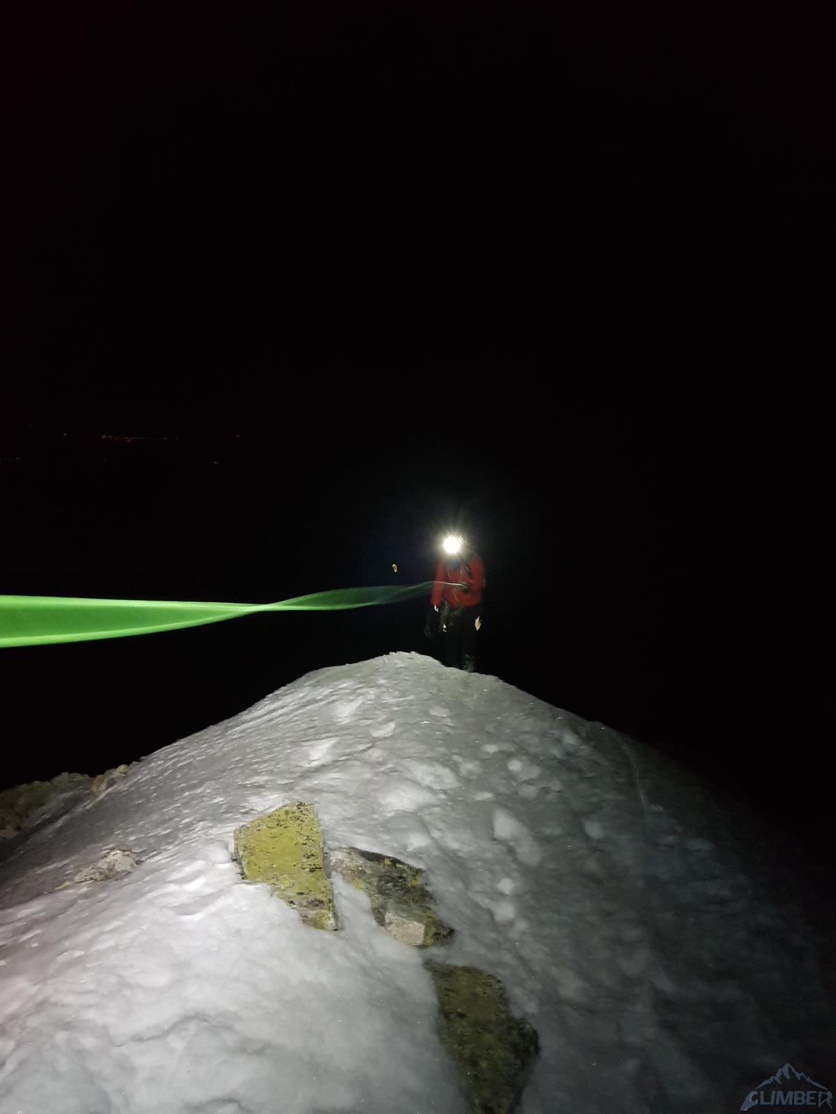 Po zjeździe z grani do żlebu próbuję wypróbować opisywany TUTAJ wariant – okazuje się jednak, że ringa za przełączką nie jesteśmy w stanie namierzyć (o ile tam jest), pozostaje więc nieprzyjemne zejście do kolejnego opisywanego stanowiska, jak zresztą prowadzą ślady zespołów schodzących po zrobionej Direcie. Stąd już dostajemy się w łatwy teren i kierujemy na Hińczową Przełęcz, z której wybieramy wariant zejściowy przez Galerie Cubryńskie i Mnichowy Żleb. Nad Moko docieramy około 3 w nocy i po krótkiej przerwie w Starym Schronisku ruszamy na parking, na którym meldujemy się przed 6 rano – pozostaje zajechać do domu, wziąć prysznic i udać się prosto do pracy 😉.