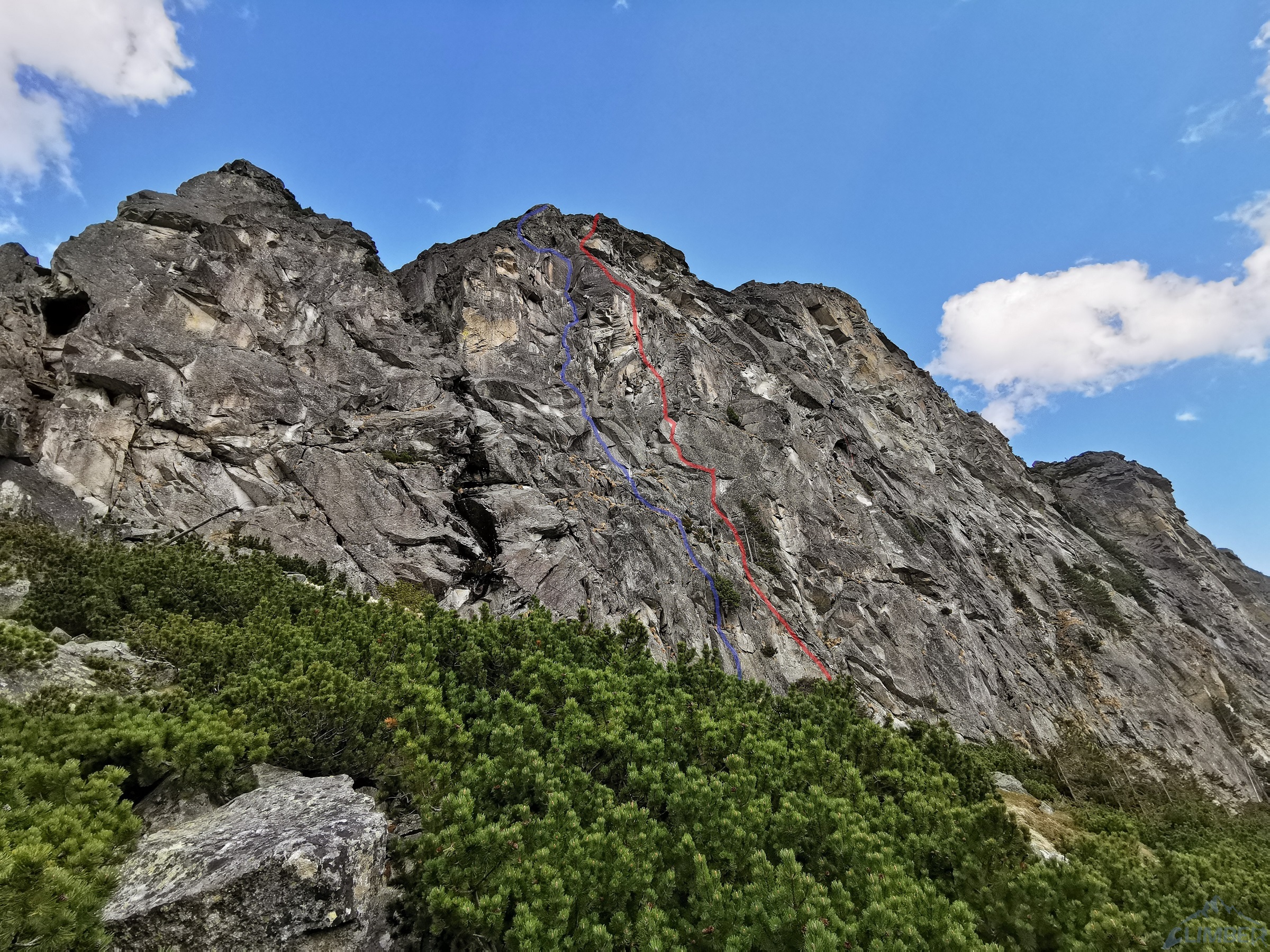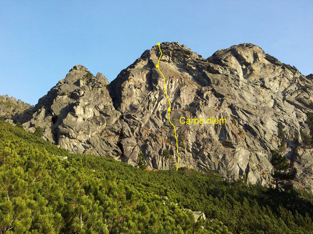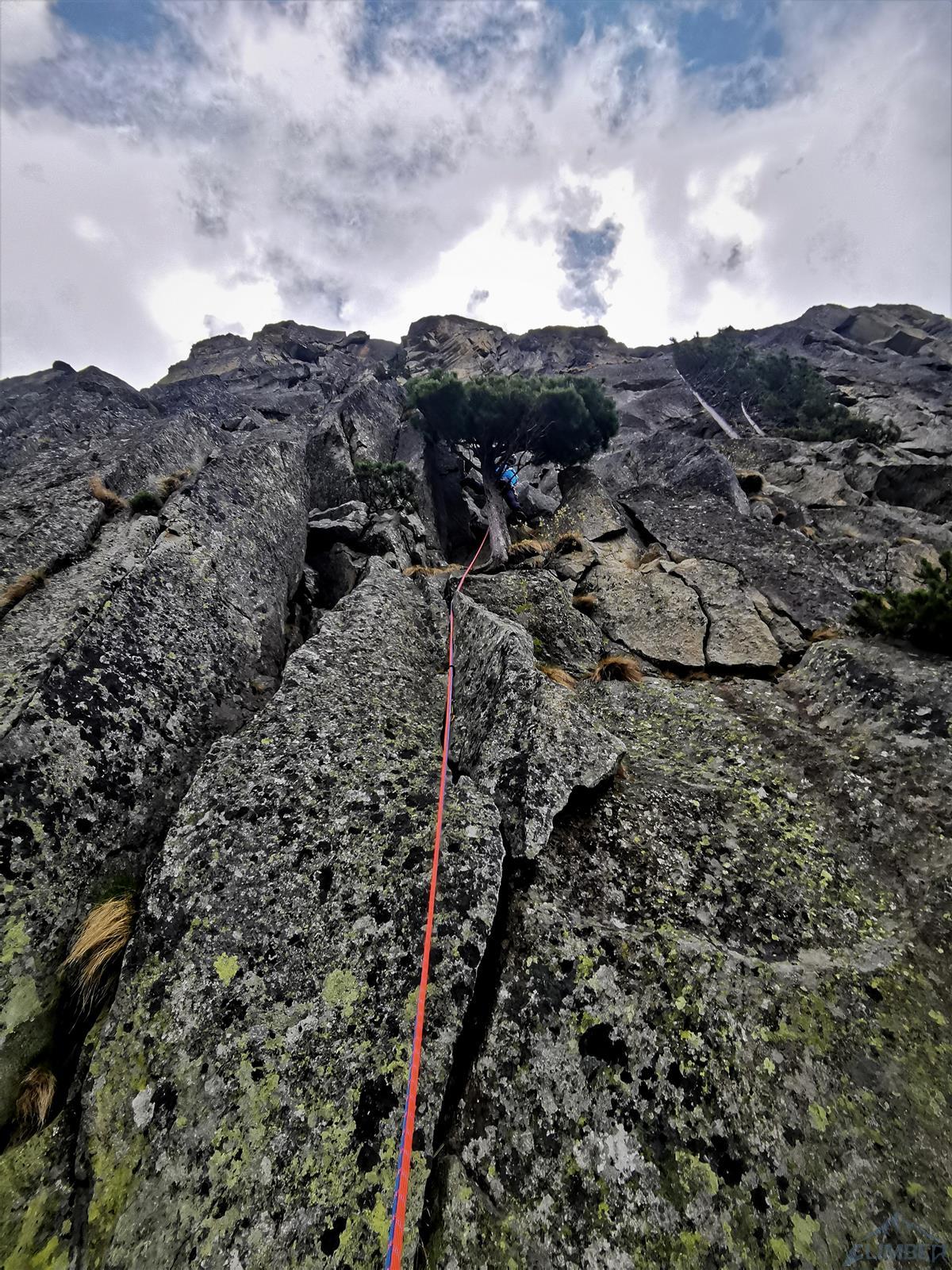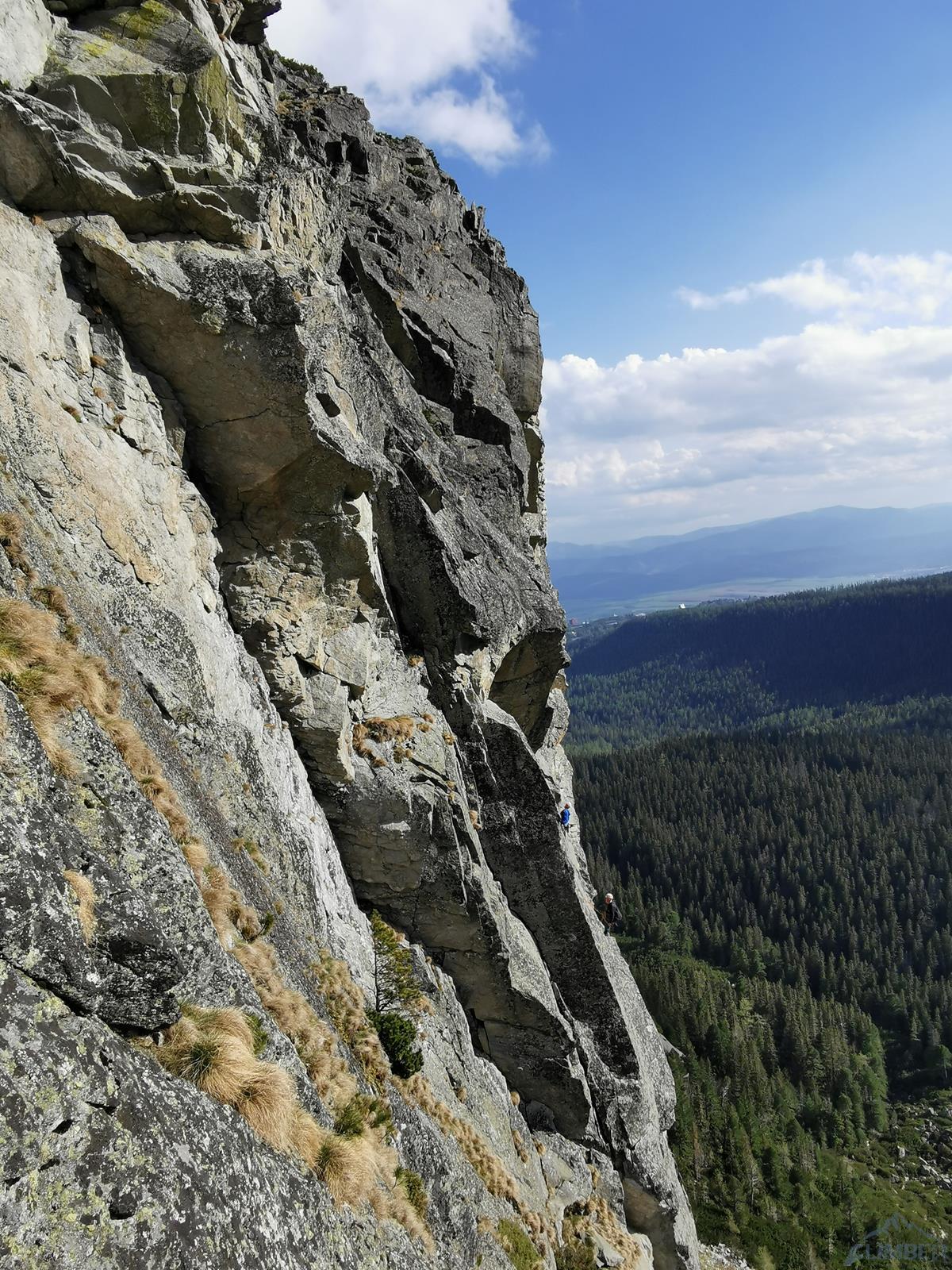 Ponieważ we wcześniejszej relacji nie rozpisywałem się na temat Dieški, uzupełniam zaległości i wrzucam krótki opis drogi. Startujemy na prawo od rampy wprowadzającej do Polskiego Komina – przy wejściu w drogę umieszczono ringa, nie sposób się więc pomylić. Kierujemy się pęknięciem wprost do drzewa, po czym zacięciem (IV+) skośnie w prawo. Inny wariant (robiłem poprzednio) prowadzi ciasnym kominkiem po lewej i systemem zacięć, trudności podobne ale chyba jednak ciekawiej. Obie opcje doprowadzają do stanowiska (2 ringi) na płycie pod zacięciem przechodzącym w komin. Na tym odcinku trzeba się już sprężyć (VI/VI+), wygląda niewinnie ale jest wypychająco, a przy wilgotnej skale – czujnie. Pewności dodaje jednak kilka haków i ring na przewinięciu, kilka łatwych metrów dalej docieramy do stanu (ponownie 2 ringi). Trzeci wyciąg jest całkiem ładny – zaczynamy ryską i przewijamy się w prawo do zacięcia. Kilka metrów wyżej czeka nas czujny trawers (VI-, stare haki) i ciekawe wyjście z małej przewieszki – stanowisko z gotowych punktów znajdziemy tuż nad nią.