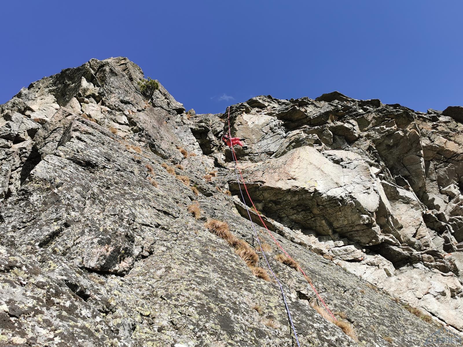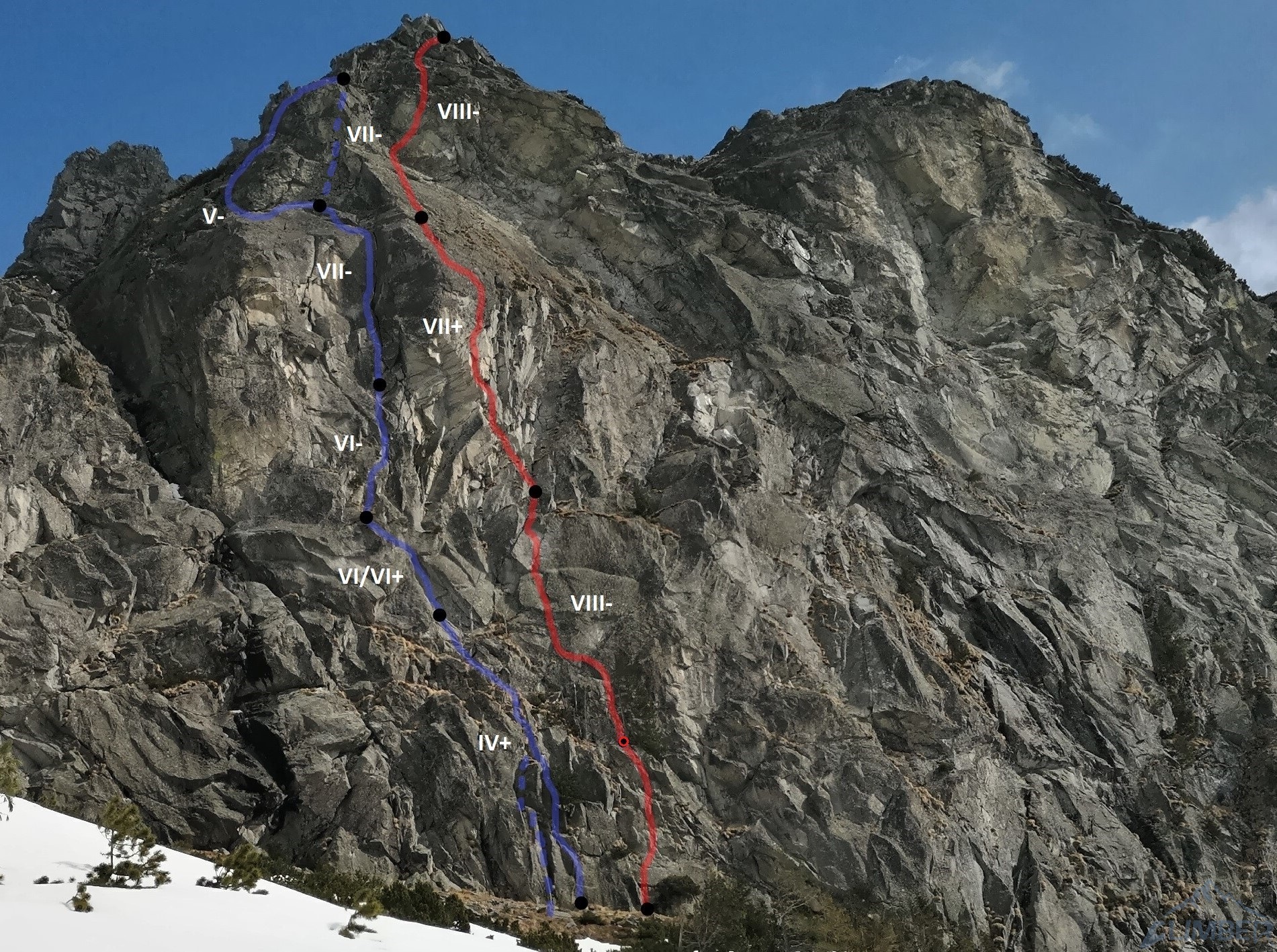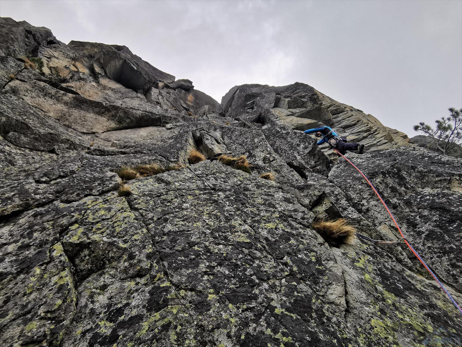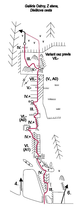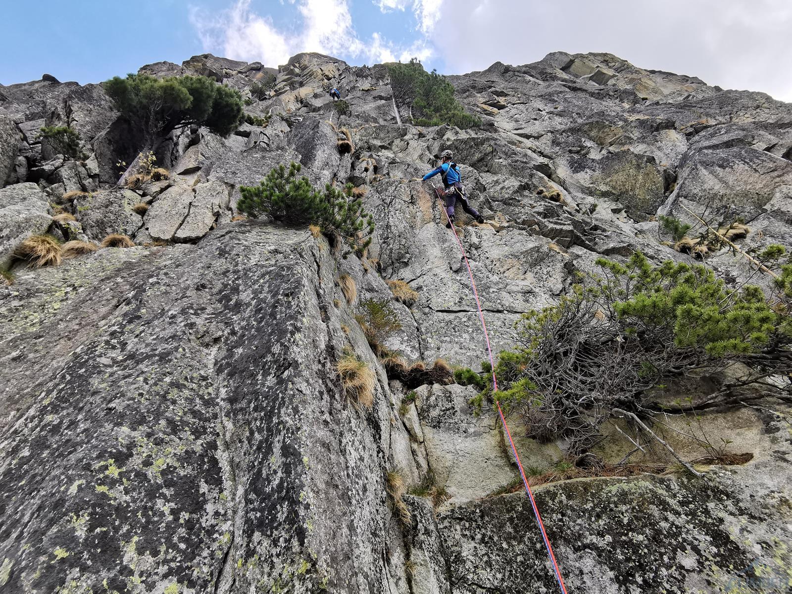 Ponieważ we wcześniejszej relacji nie rozpisywałem się na temat Dieški, uzupełniam zaległości i wrzucam krótki opis drogi. Startujemy na prawo od rampy wprowadzającej do Polskiego Komina – przy wejściu w drogę umieszczono ringa, nie sposób się więc pomylić. Kierujemy się pęknięciem wprost do drzewa, po czym zacięciem (IV+) skośnie w prawo. Inny wariant (robiłem poprzednio) prowadzi ciasnym kominkiem po lewej i systemem zacięć, trudności podobne ale chyba jednak ciekawiej. Obie opcje doprowadzają do stanowiska (2 ringi) na płycie pod zacięciem przechodzącym w komin. Na tym odcinku trzeba się już sprężyć (VI/VI+), wygląda niewinnie ale jest wypychająco, a przy wilgotnej skale – czujnie. Pewności dodaje jednak kilka haków i ring na przewinięciu, kilka łatwych metrów dalej docieramy do stanu (ponownie 2 ringi). Trzeci wyciąg jest całkiem ładny – zaczynamy ryską i przewijamy się w prawo do zacięcia. Kilka metrów wyżej czeka nas czujny trawers (VI-, stare haki) i ciekawe wyjście z małej przewieszki – stanowisko z gotowych punktów znajdziemy tuż nad nią.