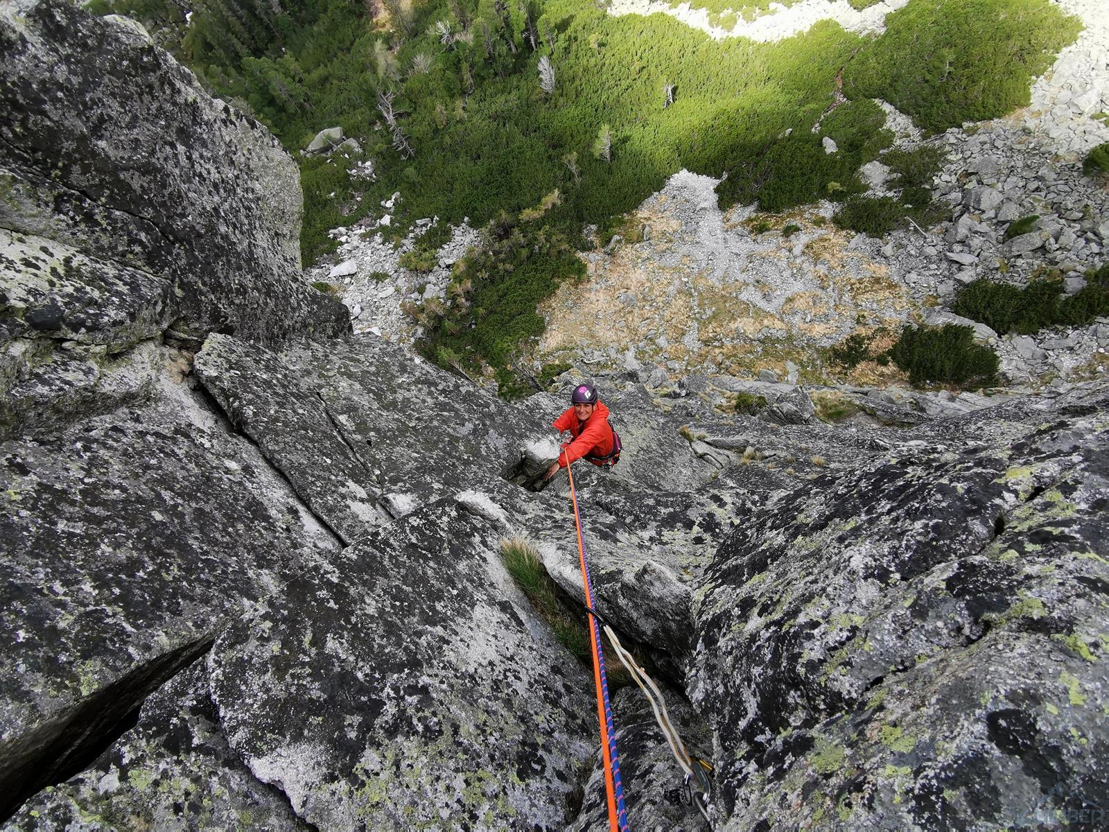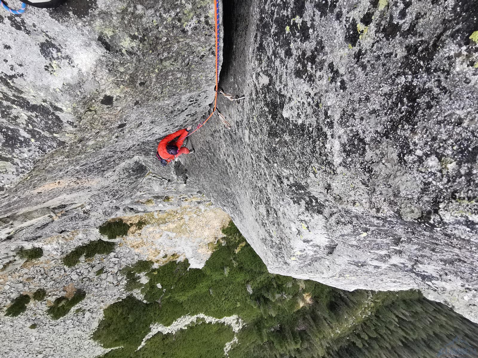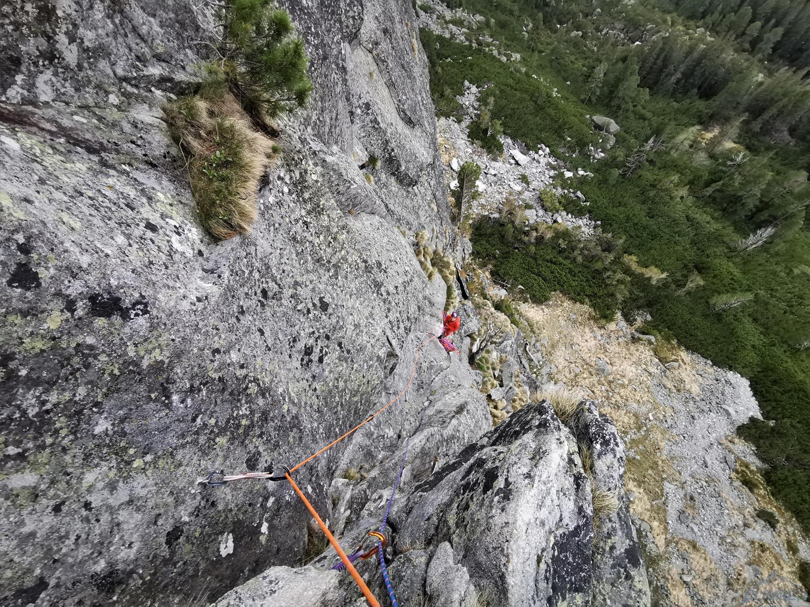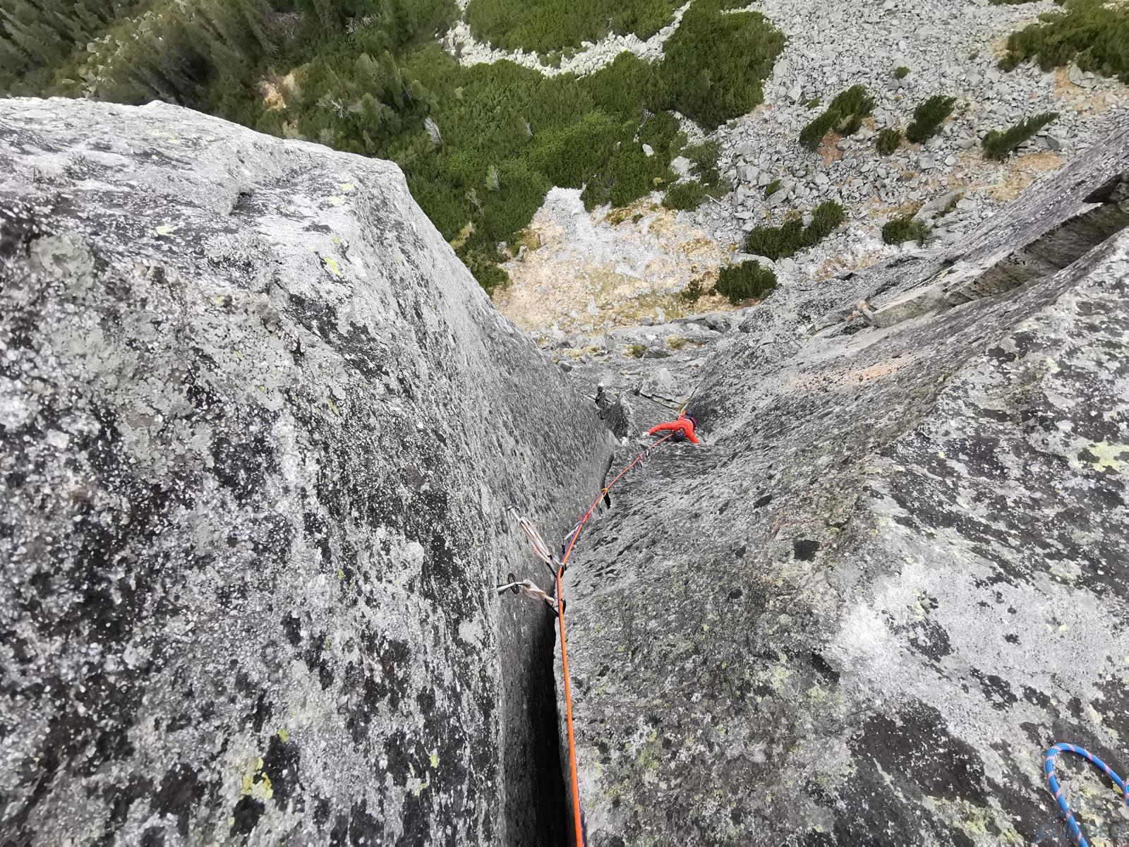 Kolejny wyciąg to jeden z najładniejszych wspinaczkowych odcinków w Tatrach – estetyczne zacięcie z rysą, które najlepiej przejść dilfrem – kiedyś robiłem rozpieraczką i poległem na wyjściu, gdy zacięcie staje dęba. Tym razem idzie szybko i sprawnie, choć ostatnie ruchy przy lekko wilgotnej jeszcze skale były dość czujne – ten fragment jest zresztą najtrudniejszy i (niestety) ubezpieczony obecnie ringiem i hakiem, jedyne co więc nam grozi przy niepowodzeniu to zawiśnięcie w bloku. Na dojściu do zacięcia są dwa haki, a w jego środkowej części konieczne są 2-3 friendy (Camy 0.75, 1 i 2, bardziej bojaźliwi mogą zabrać również 3-kę). Stanowisko (2 ringi, zaraz obok łańcuch z drogi Správny čas) jest co prawda kilka metrów wyżej, ja postanawiam zrobić jednak własne tuż nad zacięciem, by Ania miała ładne fotki 😊.