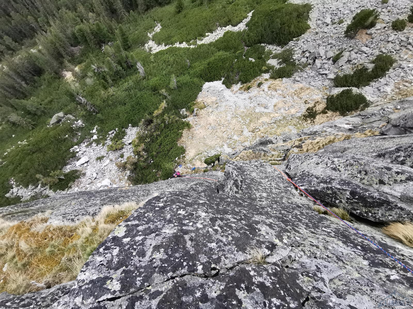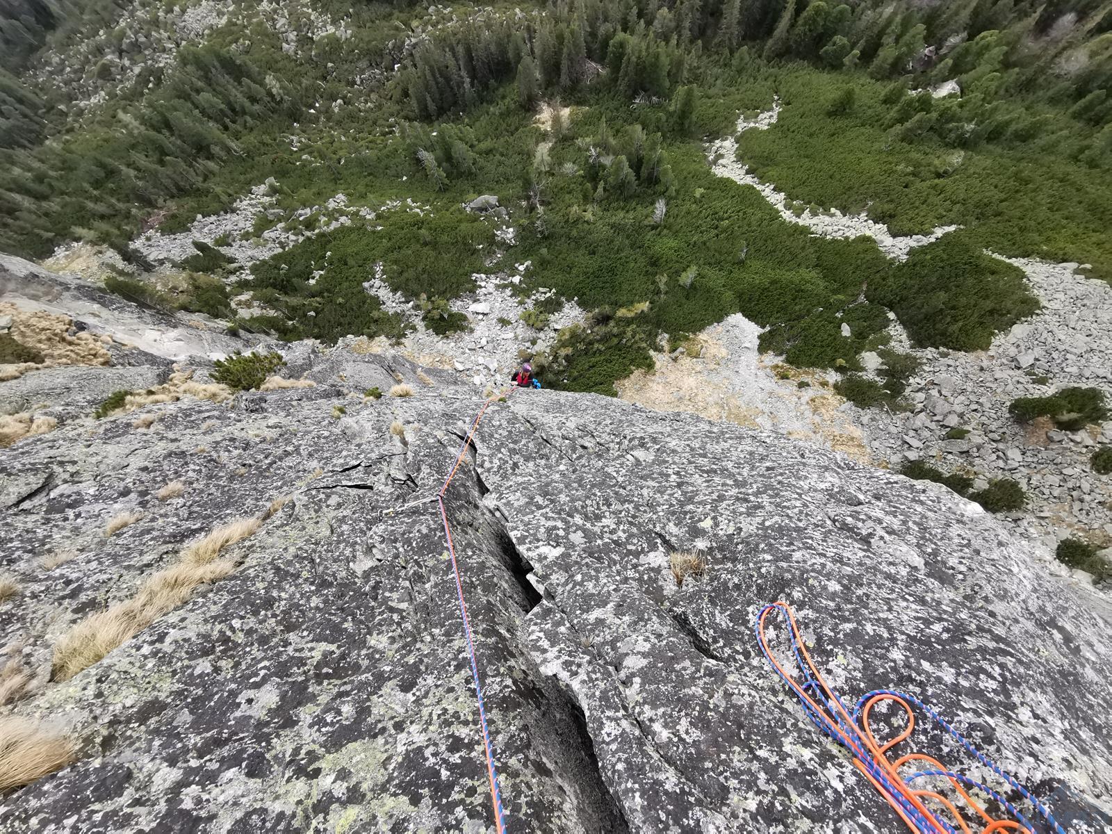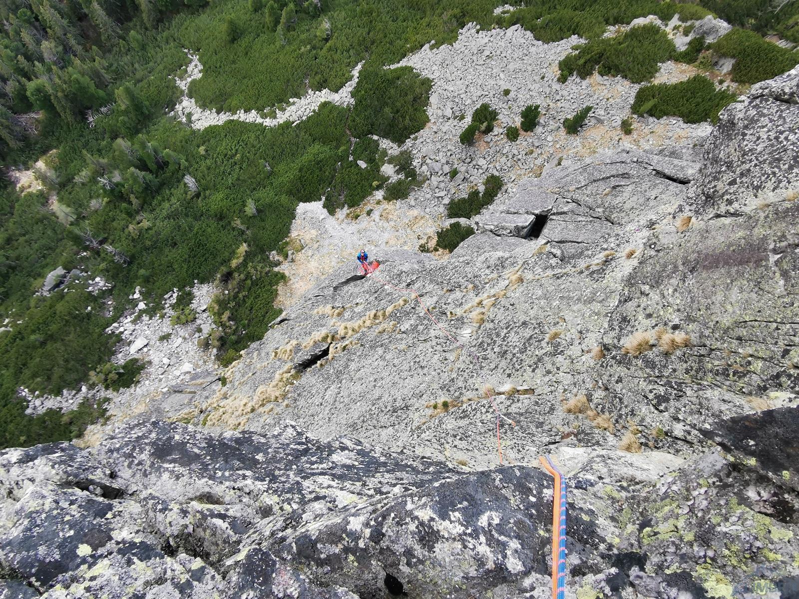 Kolejny wyciąg to jeden z najładniejszych wspinaczkowych odcinków w Tatrach – estetyczne zacięcie z rysą, które najlepiej przejść dilfrem – kiedyś robiłem rozpieraczką i poległem na wyjściu, gdy zacięcie staje dęba. Tym razem idzie szybko i sprawnie, choć ostatnie ruchy przy lekko wilgotnej jeszcze skale były dość czujne – ten fragment jest zresztą najtrudniejszy i (niestety) ubezpieczony obecnie ringiem i hakiem, jedyne co więc nam grozi przy niepowodzeniu to zawiśnięcie w bloku. Na dojściu do zacięcia są dwa haki, a w jego środkowej części konieczne są 2-3 friendy (Camy 0.75, 1 i 2, bardziej bojaźliwi mogą zabrać również 3-kę). Stanowisko (2 ringi, zaraz obok łańcuch z drogi Správny čas) jest co prawda kilka metrów wyżej, ja postanawiam zrobić jednak własne tuż nad zacięciem, by Ania miała ładne fotki 😊.