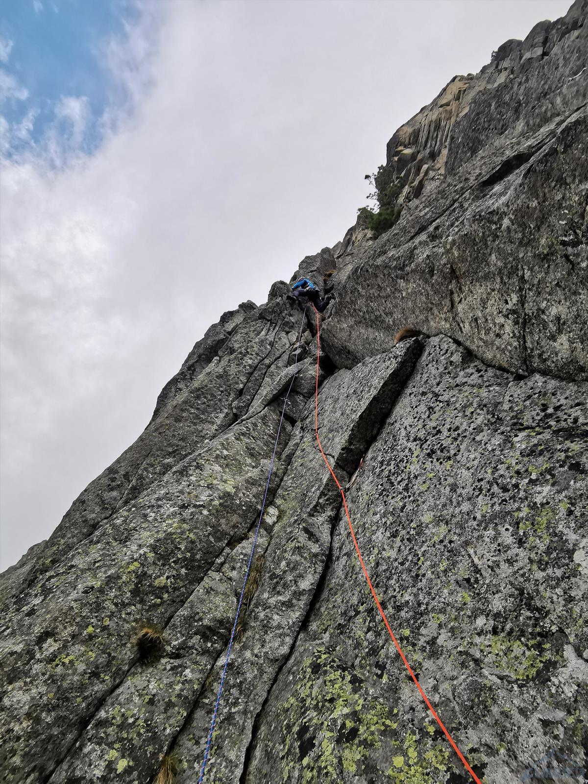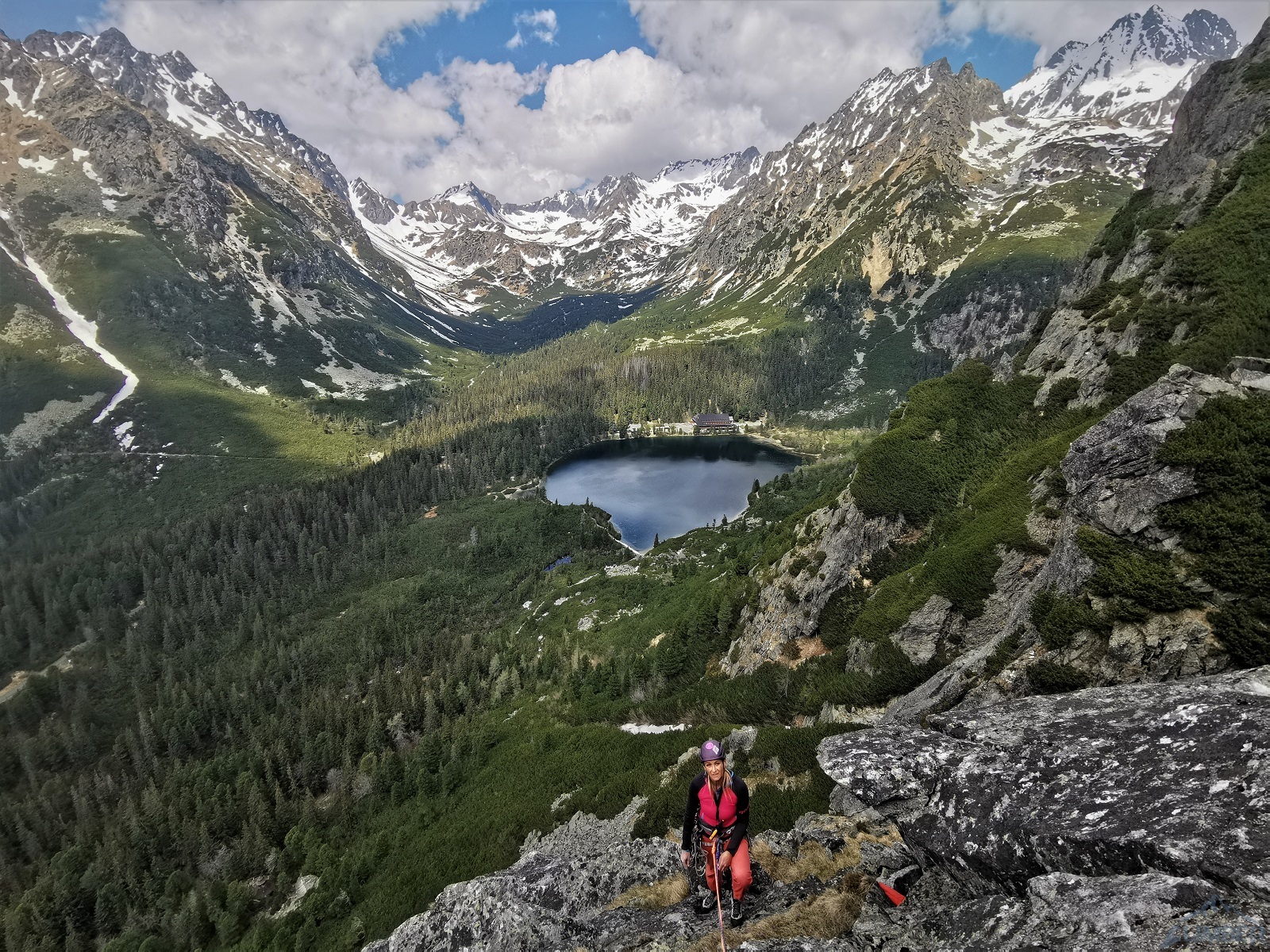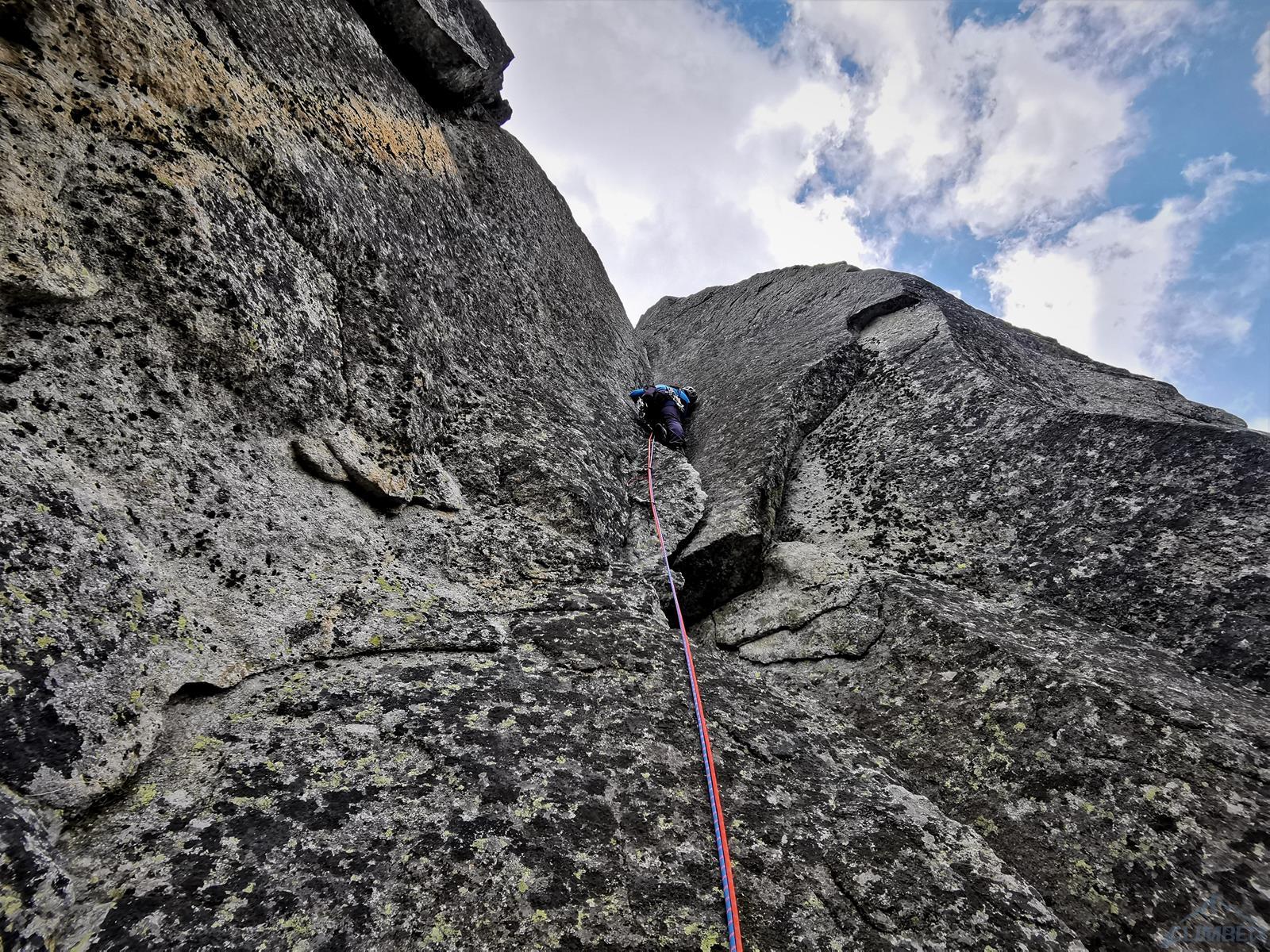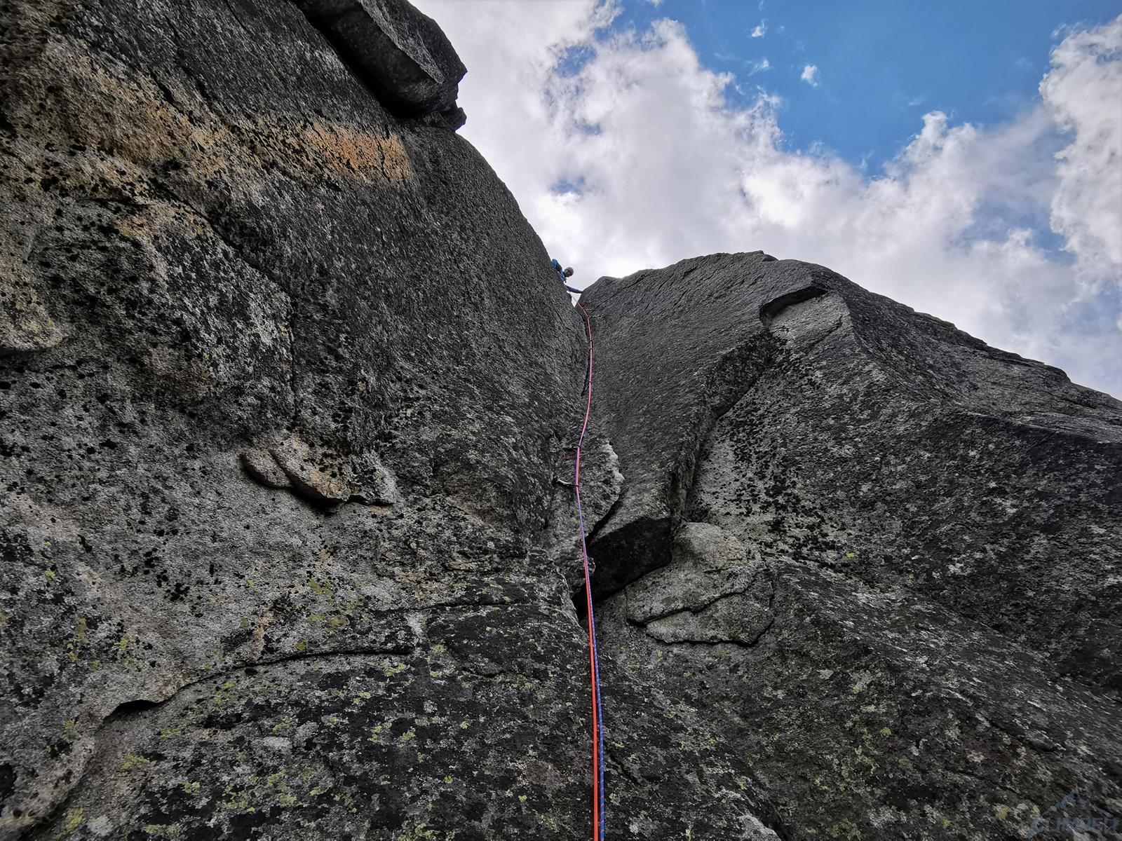 Kolejny wyciąg to jeden z najładniejszych wspinaczkowych odcinków w Tatrach – estetyczne zacięcie z rysą, które najlepiej przejść dilfrem – kiedyś robiłem rozpieraczką i poległem na wyjściu, gdy zacięcie staje dęba. Tym razem idzie szybko i sprawnie, choć ostatnie ruchy przy lekko wilgotnej jeszcze skale były dość czujne – ten fragment jest zresztą najtrudniejszy i (niestety) ubezpieczony obecnie ringiem i hakiem, jedyne co więc nam grozi przy niepowodzeniu to zawiśnięcie w bloku. Na dojściu do zacięcia są dwa haki, a w jego środkowej części konieczne są 2-3 friendy (Camy 0.75, 1 i 2, bardziej bojaźliwi mogą zabrać również 3-kę). Stanowisko (2 ringi, zaraz obok łańcuch z drogi Správny čas) jest co prawda kilka metrów wyżej, ja postanawiam zrobić jednak własne tuż nad zacięciem, by Ania miała ładne fotki 😊.