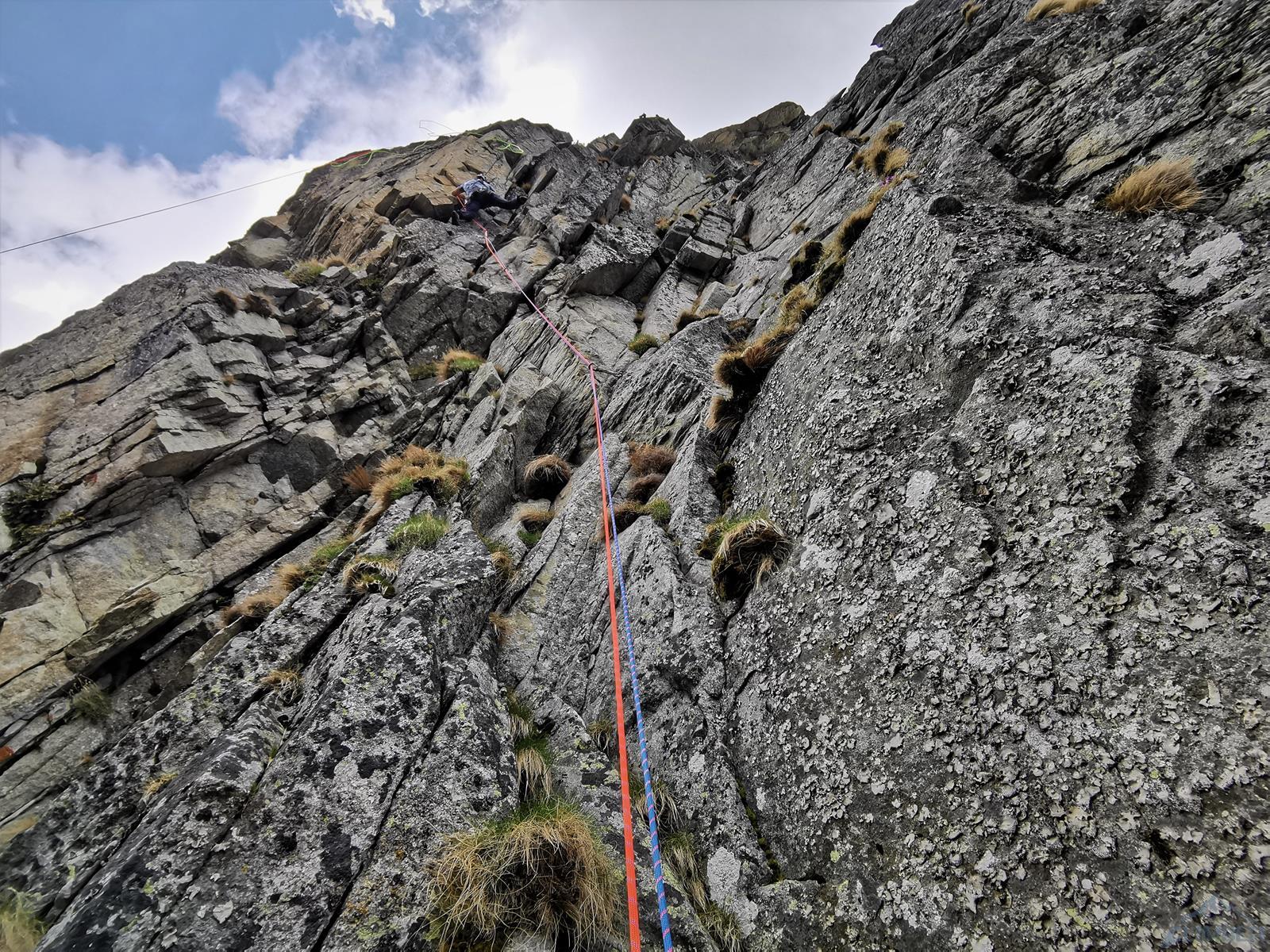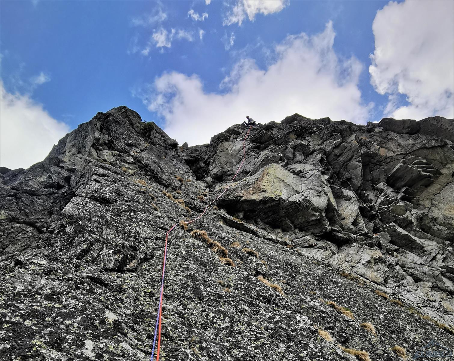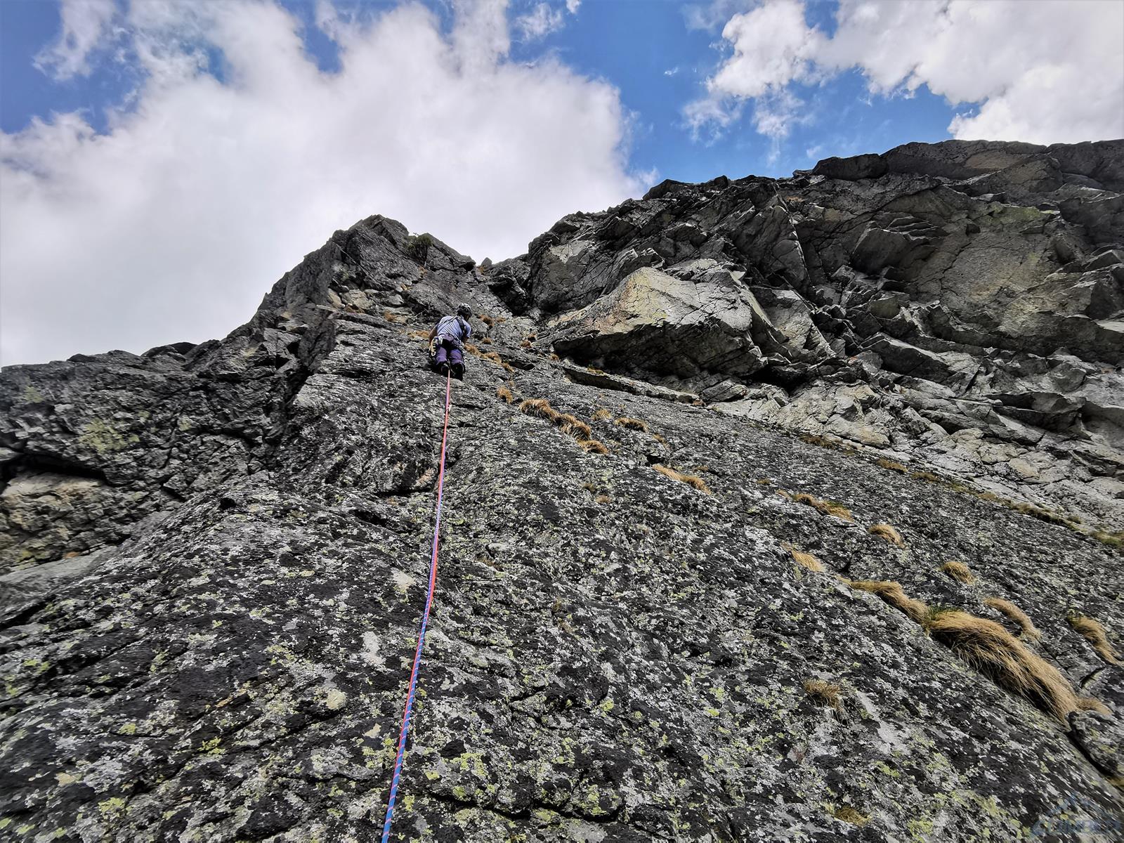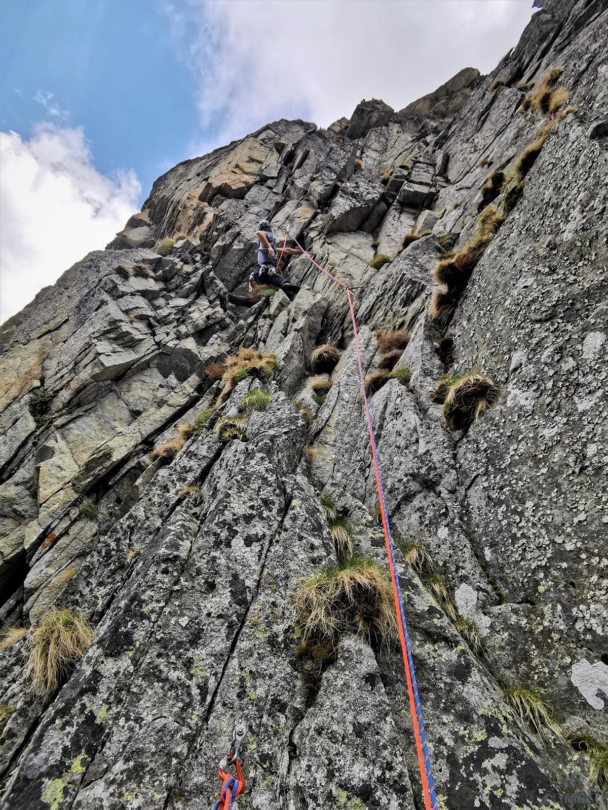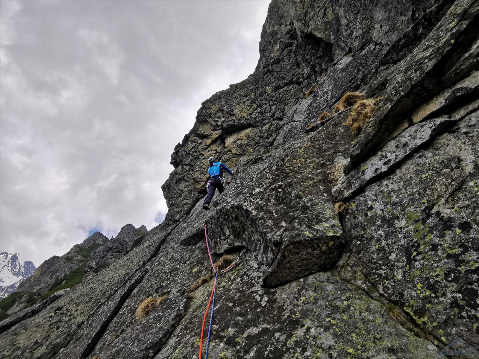 Drugi wyciąg (ok. 40 metrów) to jeden z najładniejszych i najbardziej ciągowych wyciągów siódemkowych (VII+) jakie robiłem w Tatrach – po łatwym początku czeka nas kilka świetnych sekwencji po dobrych chwytach w lekkim przewieszeniu. Trudnych ruchów nie ma, ale idzie się zbułować lub coś pomylić przy tak bogatej rzeźbie skały. Tym razem udaje mi się OS-em, choć ostatnie łatwiejsze metry do stanowiska pokonuję już na oparach 😊. Ściągam Anię, która również zachwyca się różnorodnością i efektownością tego odcinka, odpoczywamy i szykujemy się na ostatni fragment.