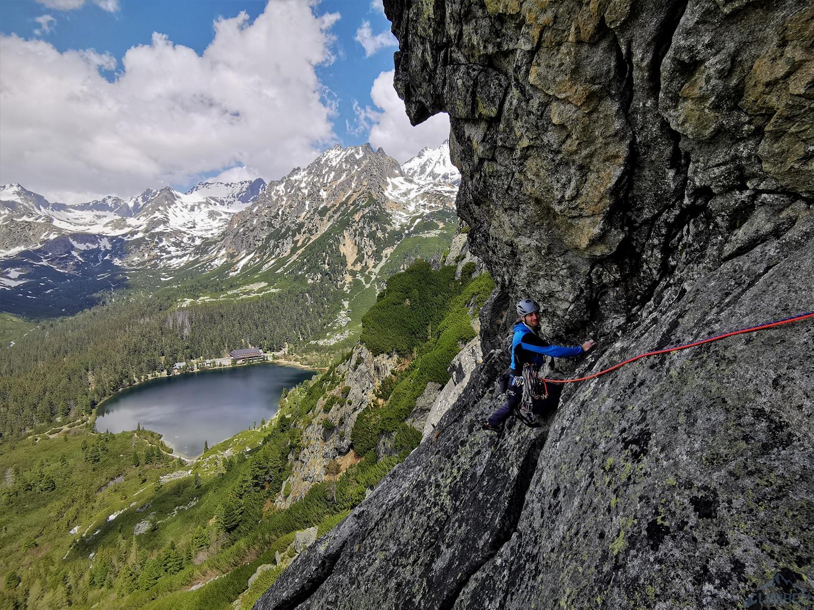 Długi weekend spędzamy w Rudawach, gdy jednak trzeciego dnia wspinania okazuje się, że w Tatrach jest szansa na okno pogodowe – bez wahania postanawiamy przenieść się 500 kilometrów by rozpocząć w nich wreszcie sezon letni. Wysoko w górach nadal mnóstwo śniegu, jest jednak miejsce w którym bez problemu można wspinać się nawet wczesną wiosną – Galeria Osterwy. Po wieczornej ulewie skała z rana jest lekko wilgotna, z każdą minutą jest jednak coraz lepiej, a gdy Słońce pojawia się na ścianie – warunki robią się idealne. Zaczynamy od tradowego mega-klasyka, drogi tria Dieška-Halás-Marek (VII-), na którą wracam po kilku latach (RELACJA). Na drugi cel obieramy sportową Carpe Diem (VIII-), która mimo iż powstała całkiem niedawno (2015) – już zyskała miano jednej z najładniejszych linii na ścianie.