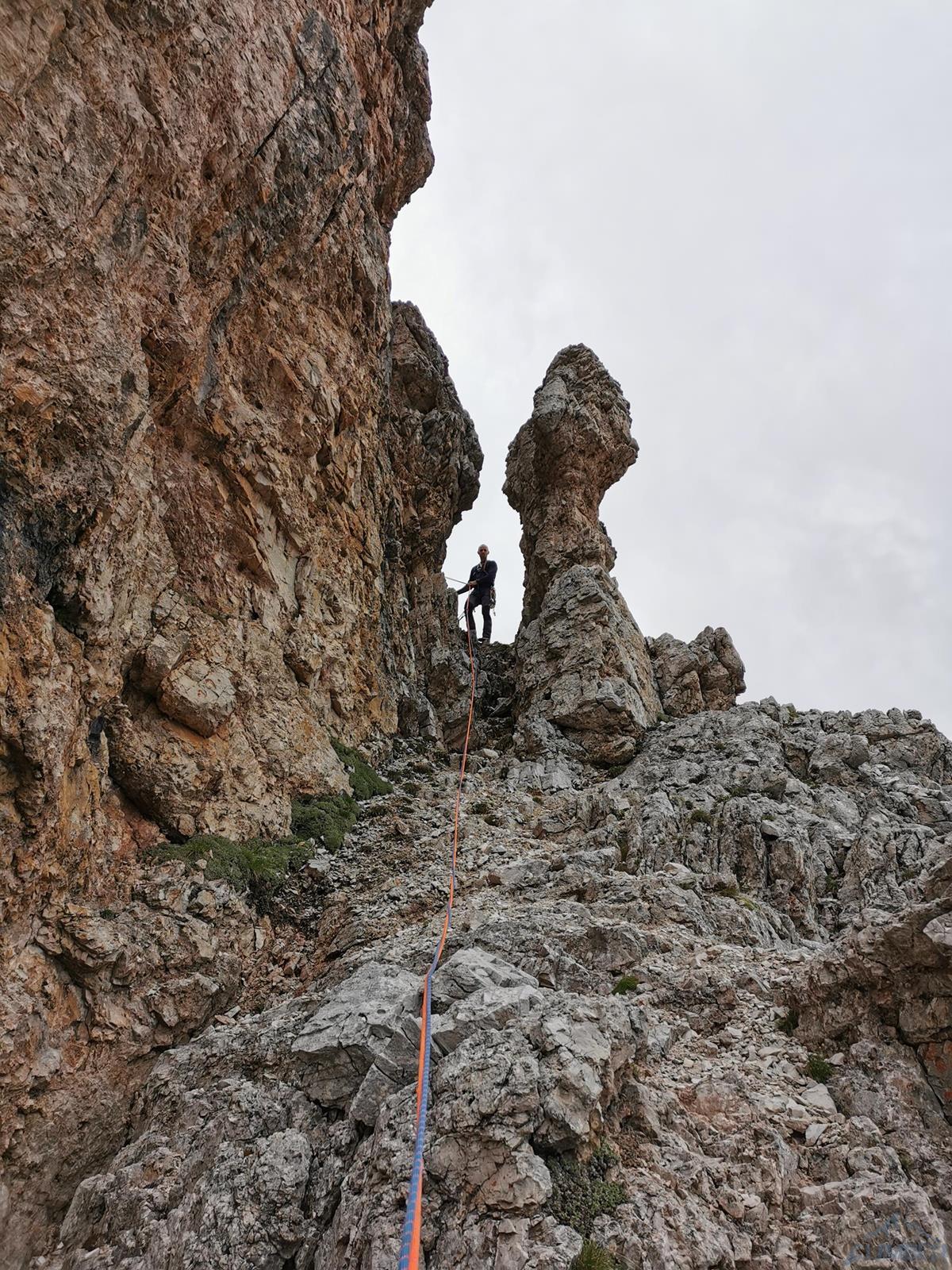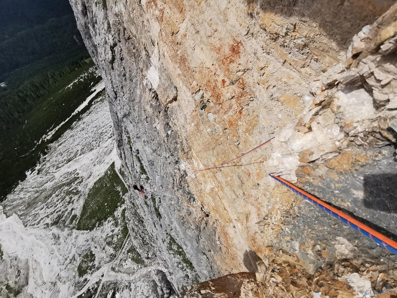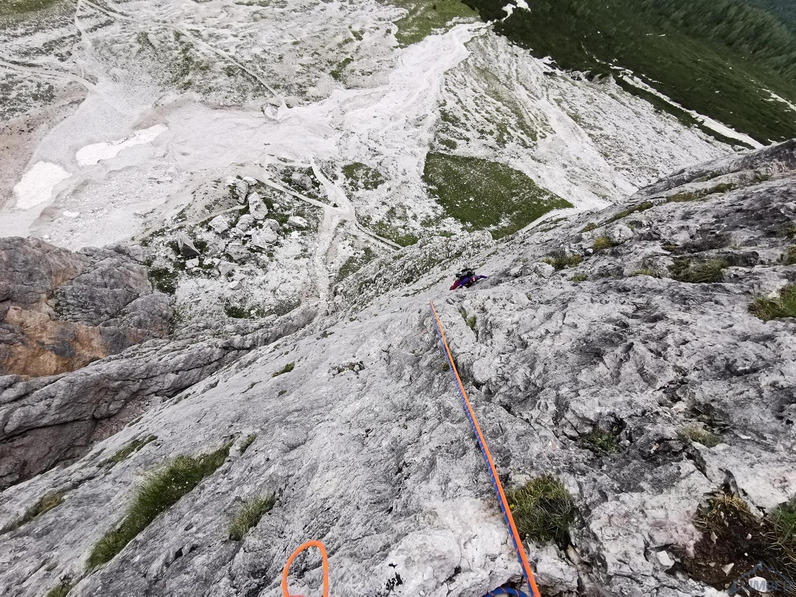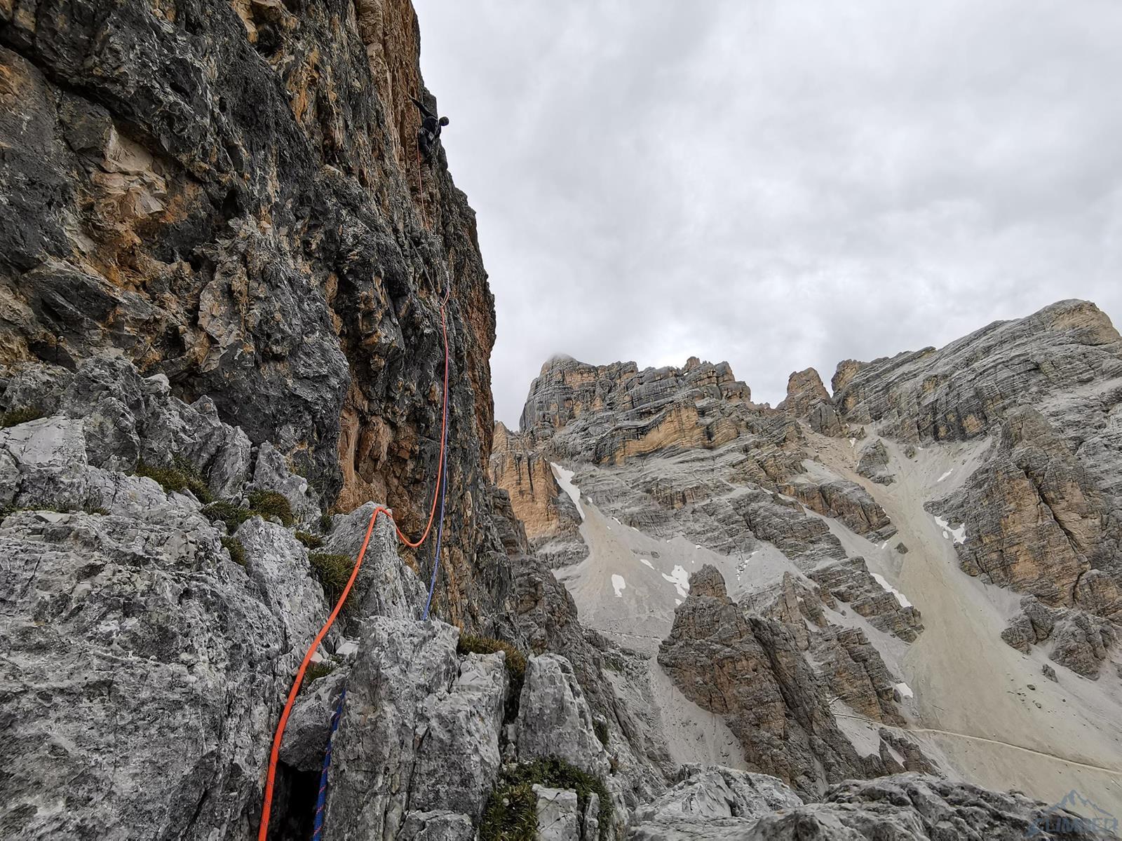 Kolejny wyciąg to wspinanie zupełnie inne niż do tej pory – pokonujemy ciąg zacięć po prawej stronie (haki i własna, ok. 6a), mijamy małą grotę i po 50 metrach wychodzimy na wygodną półkę po lewej stronie (miały być dwa haki ale nie namierzyłem). Wyciąg następny to mała łamigłówka – ciężko zlokalizować opisywaną w topo płytę bo teren jest bardzo rozległy. Generalnie kierujemy się skośnie w lewo, celując w przełamanie ściany nad wyraźnym zacięciem po lewej i staramy się by trudności nie przekroczyły V+. Tutaj można już odetchnąć – łączymy się z drogą Alverà-Pompanin/Primo Spigolo i do końca pozostają nam dwa łatwe (IV+) i przyjemne wyciągi – my pokonujemy je na lotnej. Idziemy zacięciami na prawo od ostrza filara, po drodze pokonując uklamione przewieszki. Ostatni fragment to już łatwa rampa kierująca nas do charakterystycznego okna skalnego, za którym wychodzimy w łatwy teren. Ewidentna ścieżka w poprzek zbocza prowadzi nas w kierunku urwiska, które opisywałem w relacji z Constantini-Ghedina - po tym fragmencie już całkiem bezpiecznie kontynuujemy do ruin starego schroniska (w sumie ok. 30 minut) i szlaku prowadzącego do Rifugio Dibona (dodatkowe 45 minut). Warto jednak minąć ruiny i w kilka minut podejść do schroniska Giussani na zasłużonego, pysznego weissbier'a 😊.