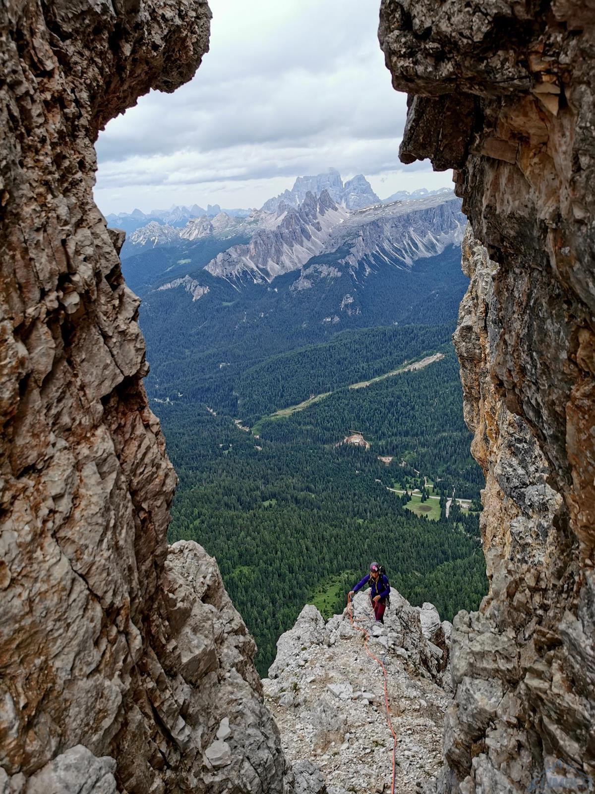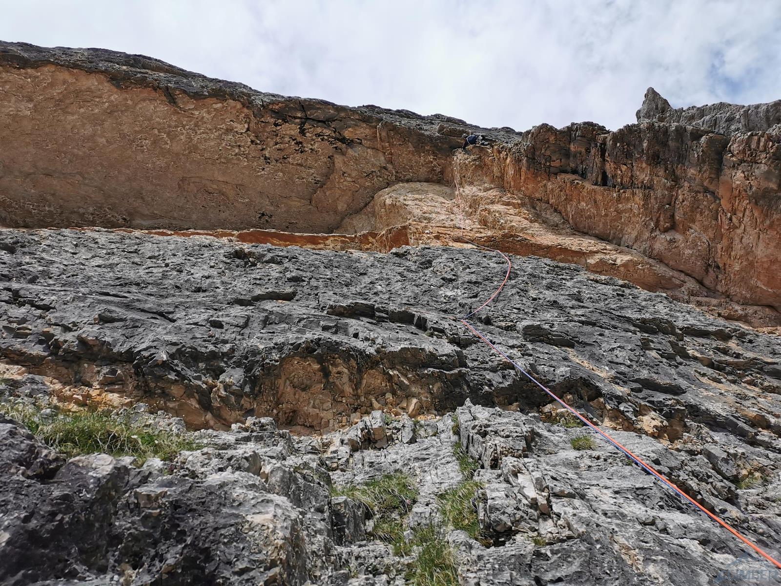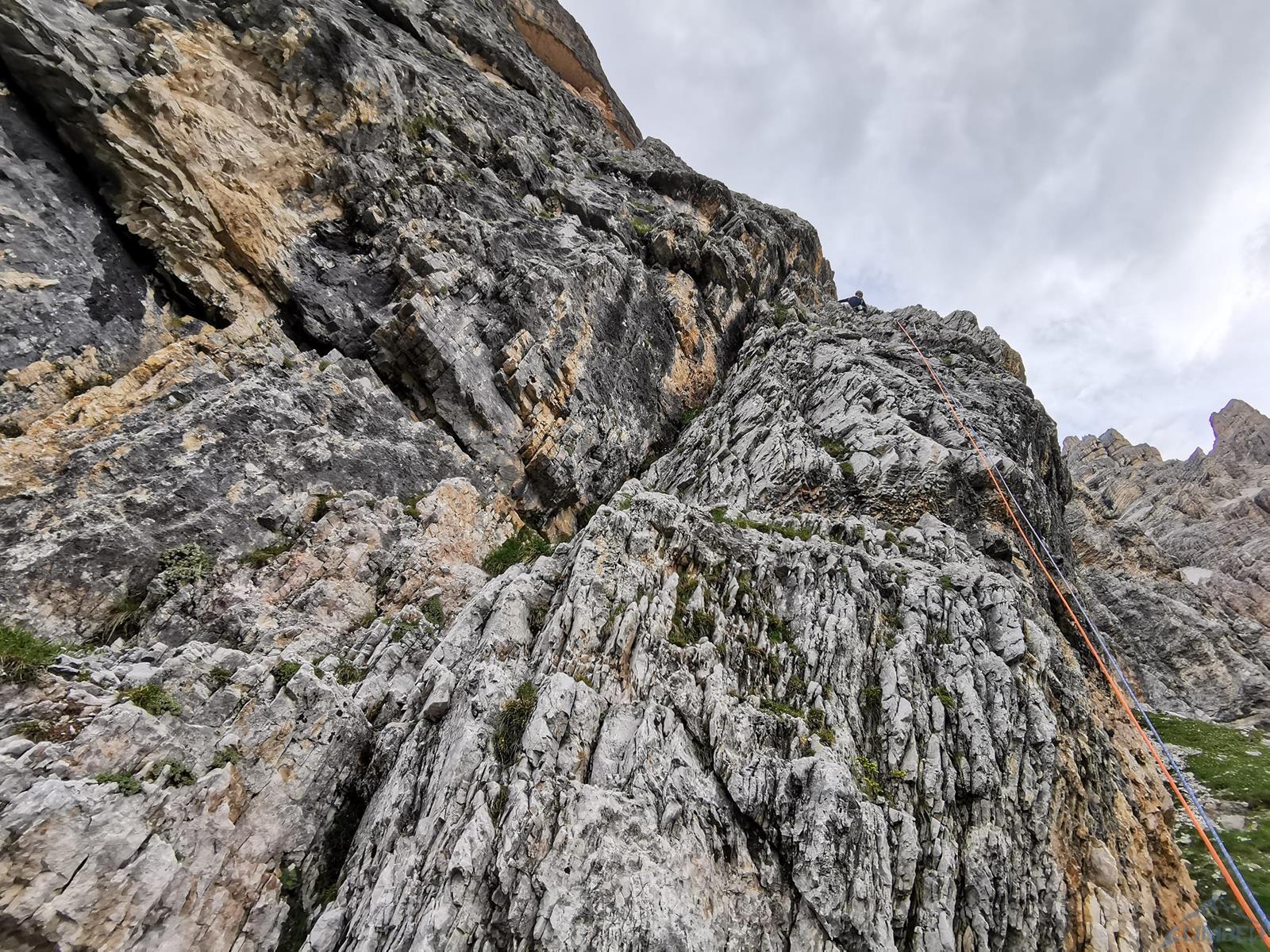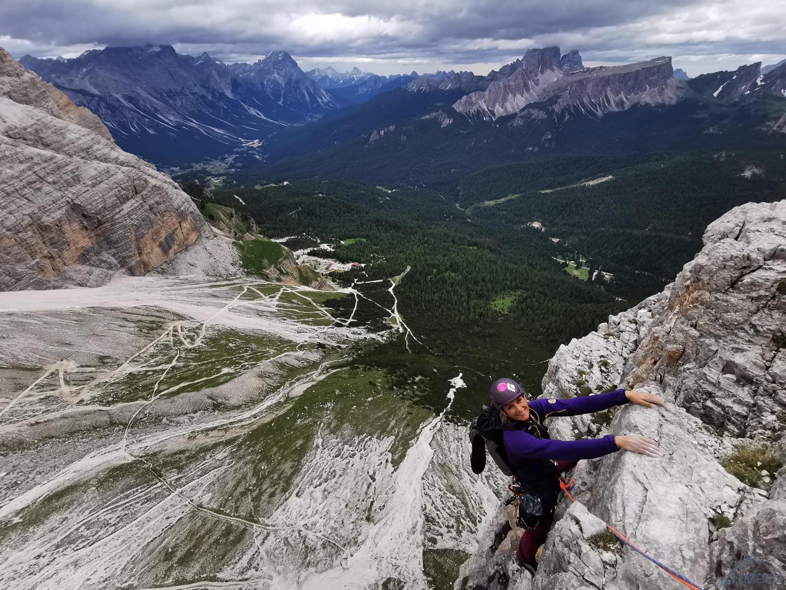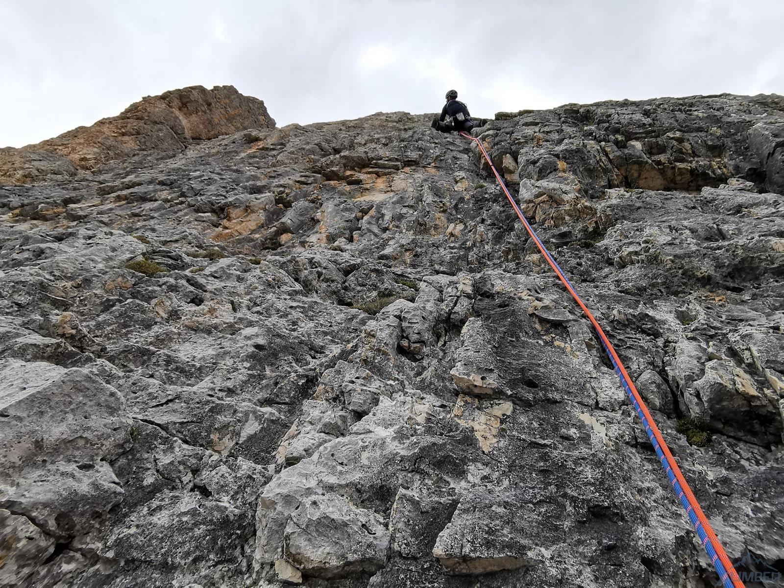 Kolejny wyciąg to wspinanie zupełnie inne niż do tej pory – pokonujemy ciąg zacięć po prawej stronie (haki i własna, ok. 6a), mijamy małą grotę i po 50 metrach wychodzimy na wygodną półkę po lewej stronie (miały być dwa haki ale nie namierzyłem). Wyciąg następny to mała łamigłówka – ciężko zlokalizować opisywaną w topo płytę bo teren jest bardzo rozległy. Generalnie kierujemy się skośnie w lewo, celując w przełamanie ściany nad wyraźnym zacięciem po lewej i staramy się by trudności nie przekroczyły V+. Tutaj można już odetchnąć – łączymy się z drogą Alverà-Pompanin/Primo Spigolo i do końca pozostają nam dwa łatwe (IV+) i przyjemne wyciągi – my pokonujemy je na lotnej. Idziemy zacięciami na prawo od ostrza filara, po drodze pokonując uklamione przewieszki. Ostatni fragment to już łatwa rampa kierująca nas do charakterystycznego okna skalnego, za którym wychodzimy w łatwy teren. Ewidentna ścieżka w poprzek zbocza prowadzi nas w kierunku urwiska, które opisywałem w relacji z Constantini-Ghedina - po tym fragmencie już całkiem bezpiecznie kontynuujemy do ruin starego schroniska (w sumie ok. 30 minut) i szlaku prowadzącego do Rifugio Dibona (dodatkowe 45 minut). Warto jednak minąć ruiny i w kilka minut podejść do schroniska Giussani na zasłużonego, pysznego weissbier'a 😊.
