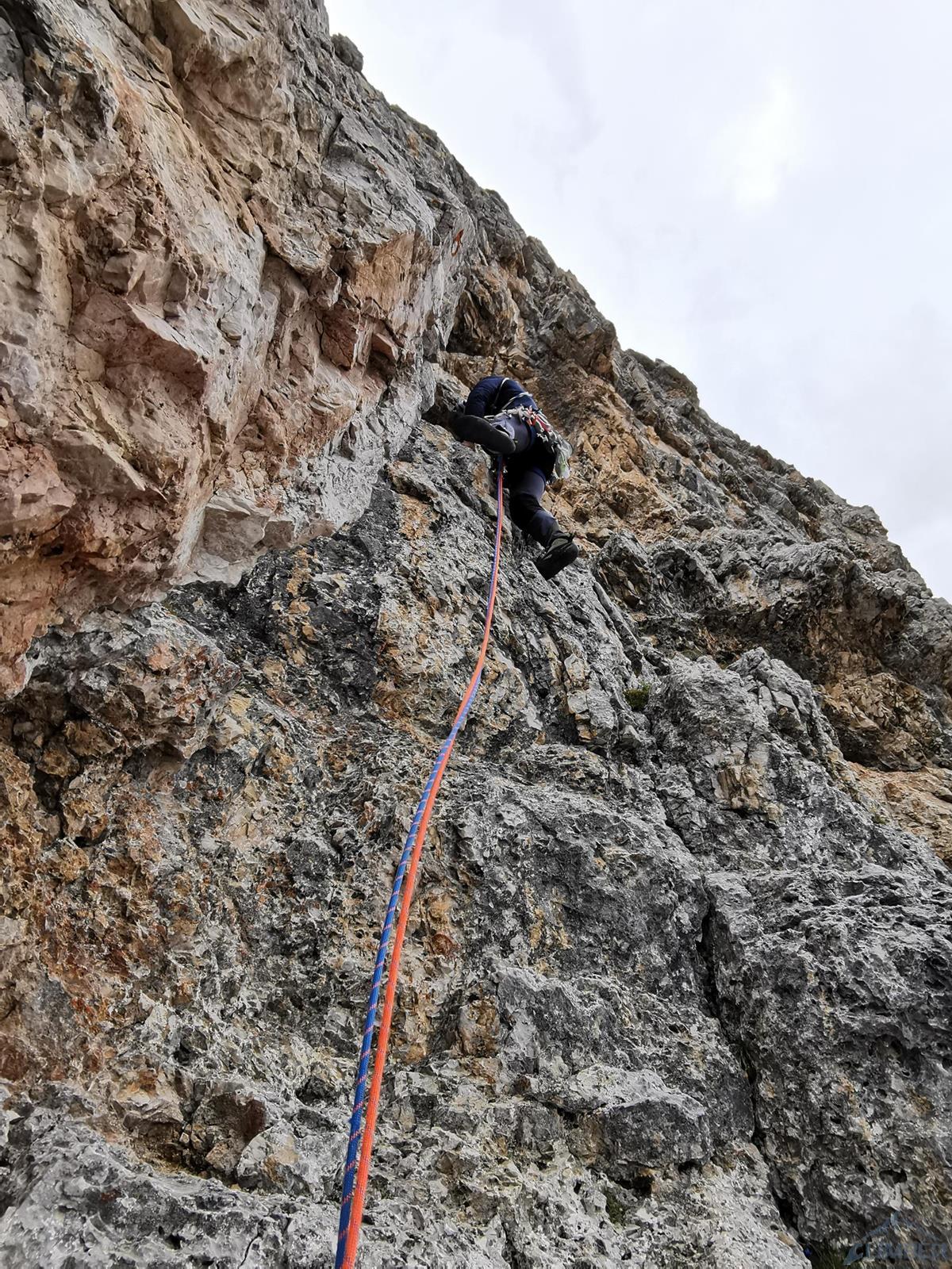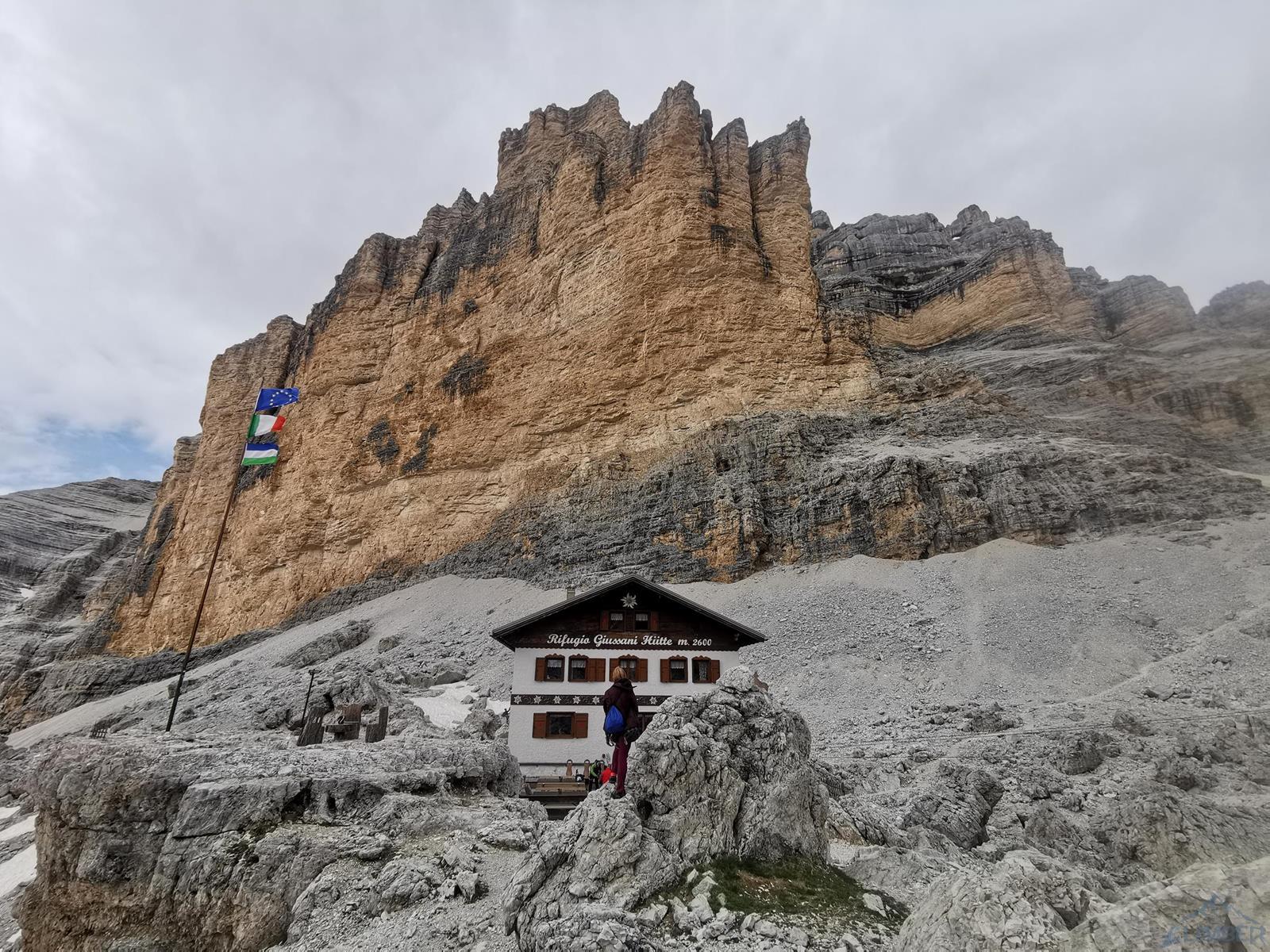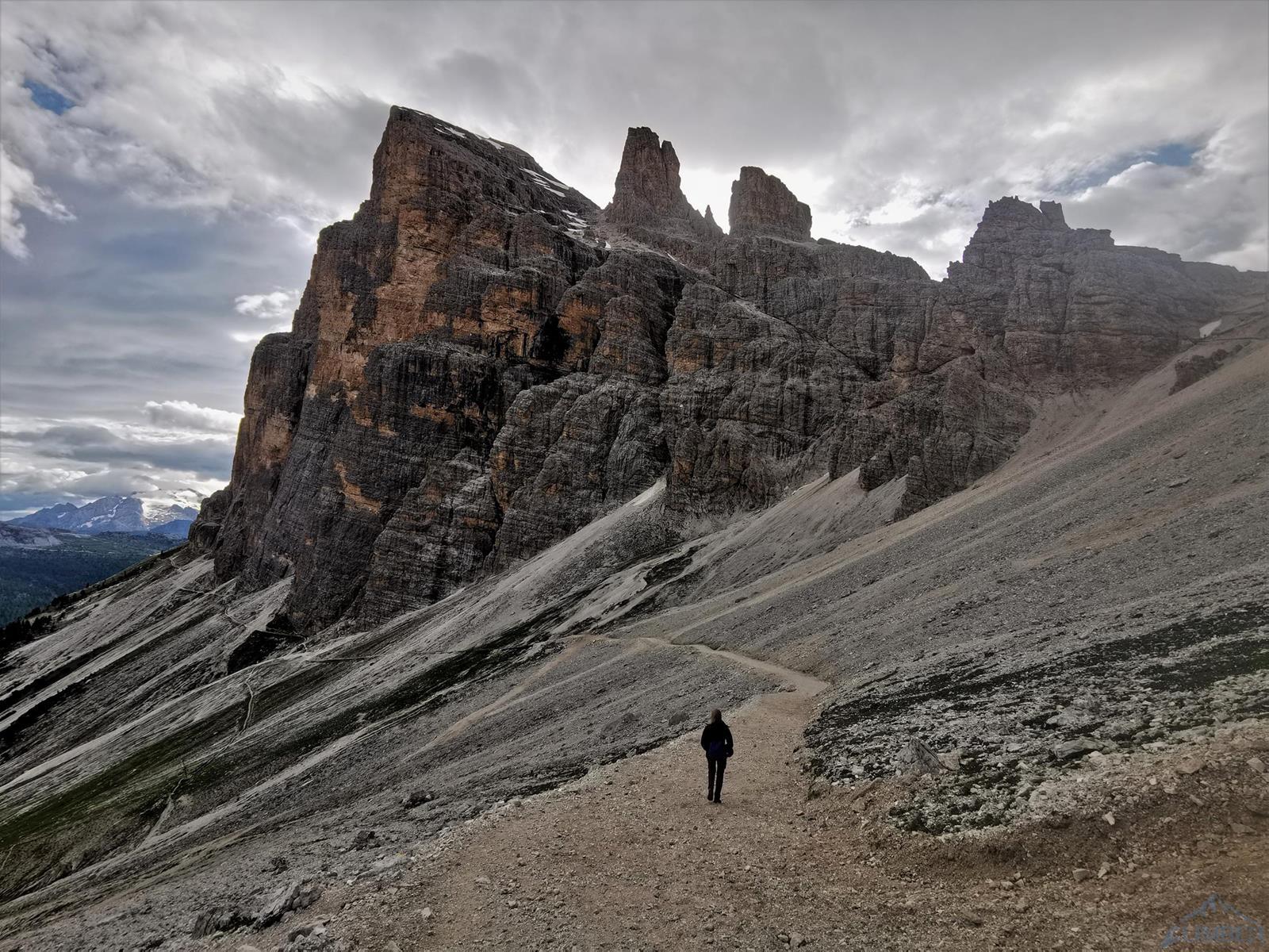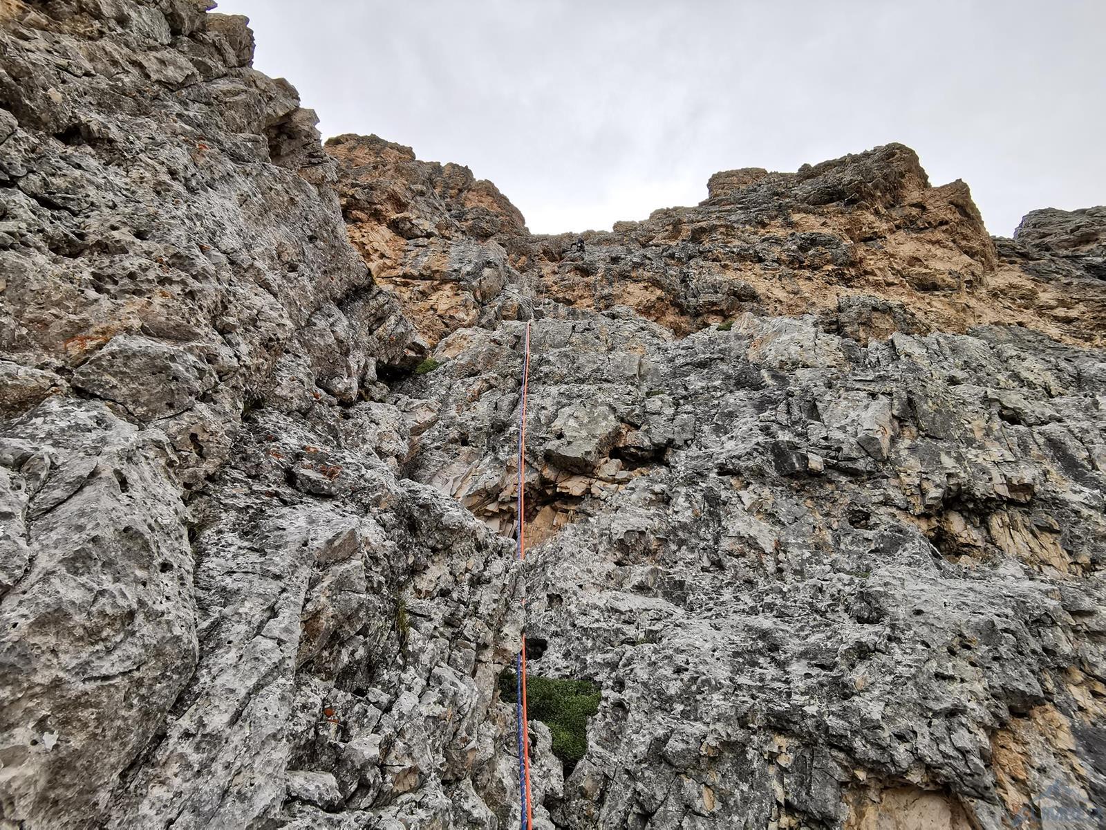 Kolejny wyciąg to wspinanie zupełnie inne niż do tej pory – pokonujemy ciąg zacięć po prawej stronie (haki i własna, ok. 6a), mijamy małą grotę i po 50 metrach wychodzimy na wygodną półkę po lewej stronie (miały być dwa haki ale nie namierzyłem). Wyciąg następny to mała łamigłówka – ciężko zlokalizować opisywaną w topo płytę bo teren jest bardzo rozległy. Generalnie kierujemy się skośnie w lewo, celując w przełamanie ściany nad wyraźnym zacięciem po lewej i staramy się by trudności nie przekroczyły V+. Tutaj można już odetchnąć – łączymy się z drogą Alverà-Pompanin/Primo Spigolo i do końca pozostają nam dwa łatwe (IV+) i przyjemne wyciągi – my pokonujemy je na lotnej. Idziemy zacięciami na prawo od ostrza filara, po drodze pokonując uklamione przewieszki. Ostatni fragment to już łatwa rampa kierująca nas do charakterystycznego okna skalnego, za którym wychodzimy w łatwy teren. Ewidentna ścieżka w poprzek zbocza prowadzi nas w kierunku urwiska, które opisywałem w relacji z Constantini-Ghedina - po tym fragmencie już całkiem bezpiecznie kontynuujemy do ruin starego schroniska (w sumie ok. 30 minut) i szlaku prowadzącego do Rifugio Dibona (dodatkowe 45 minut). Warto jednak minąć ruiny i w kilka minut podejść do schroniska Giussani na zasłużonego, pysznego weissbier'a 😊.
