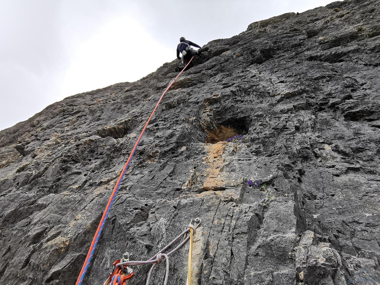 Po wyjściu nad okapy wracamy do płytowego wspinania – czwarty wyciąg prowadzi w pięknej czarnej skale i oferuje dość równe szóstkowe trudności, z jednym baldem za ok. 6b. Na 50 metrach są dwa spity i hak, ponownie więc przydają się chłodna głowa i pewna łydka 😊. Piąty wyciąg jest trochę lepiej urzeźbiony a więc i nieco łatwiejszy (ok. 6a+), trzy bolty i nieco własnego sprzętu w zupełności wystarczają. Na kolejnym odcinku wspinamy się doskonałą czarną skałą, ścianka delikatnie się przewiesza – jest więc dość ciągowo. Trudności oscylują ok. 6b, a na 50 metrach mamy (aż!) 6 spitów, do których da się dorzucić małe friendy i tricamy (te drugie warto zabrać w ścianę – siadają w wielu miejscach!). Stanowisko znajduje się na skraju wielkiej półki, gdzie kończą się główne trudności drogi. Jest to ostatni stan zjazdowy, jeżeli więc nie idziemy dalej – można stąd wygodnie i szybko wrócić pod ścianę. My tymczasem kontynuujemy wspinanie – na początek przenosimy stanowisko 50 metrów dalej – nad szarą turniczkę na prawo od wielkiej żółtej nyży.