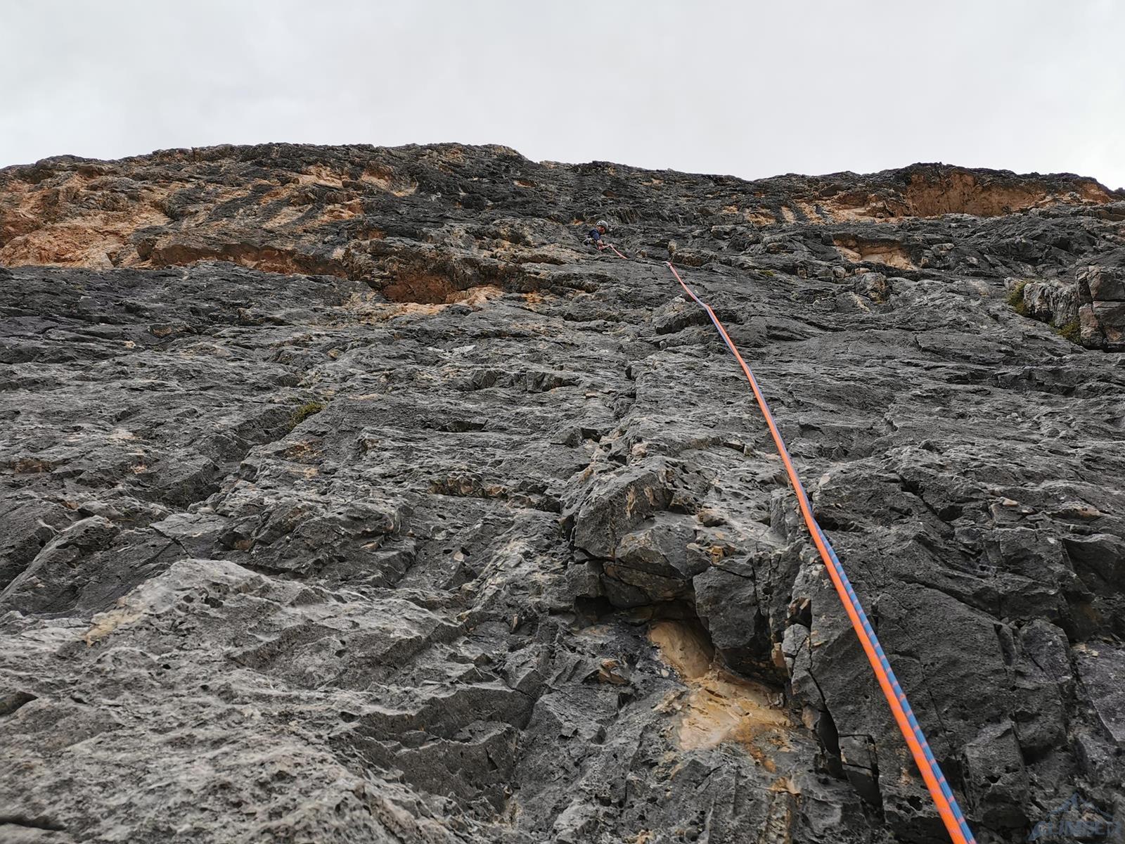 Pierwszy wyciąg to wspomniana skalna rampa o trudnościach trójkowych – po 60 metrach docieramy do stanowiska pod ogromną płytą, nad którą górują żółte dachy przecinające ścianę. Drugi odcinek (ok. VII+/6b+) może być odebrany jako najtrudniejszy na drodze. Na 50 metrach do dyspozycji mamy 4 spity i 1 haka (plus to co rzadko uda się założyć samemu), musimy dobrze odczytywać przebieg drogi, a pod sam koniec do pokonania mamy dość niebanalne miejsce. Powtórki prowadzenia na tak długich wyciągach byłyby trochę męczące, dobrze więc nastawić się na przejście zarówno tego odcinka jak i całej drogi w stylu on sight 😉. Trzeci wyciąg prowadzi przez imponujące okapy i pierwotnie wyceniony był na 6c (VII+/VIII-) – zdecydowanie jednak tyle nie ma i zaskakuje przystępnością. Zaczynamy płytą, wchodzimy w ciasne żółte zacięcie, z którego przewijamy się pod okapem w prawo. Warto porządnie przedłużyć przeloty, czeka nas bowiem spory trawers, po którym do stanowiska trzeba jeszcze podejść do góry.