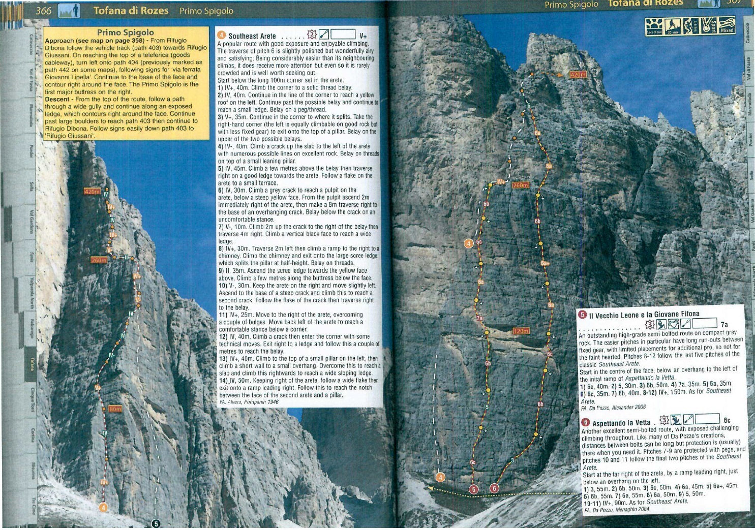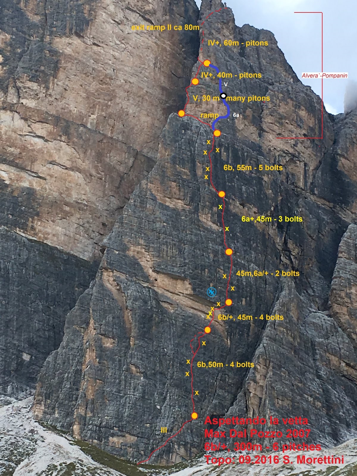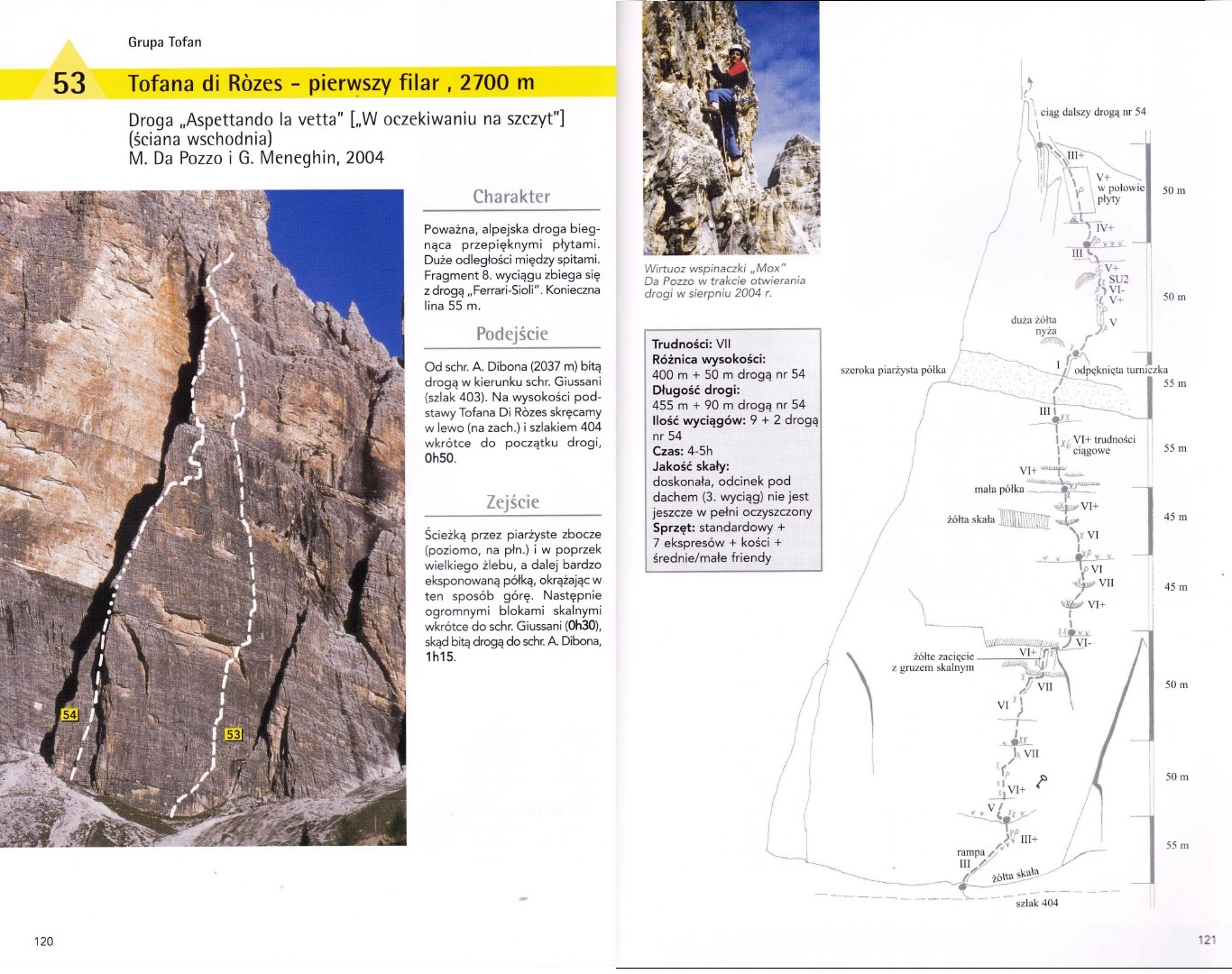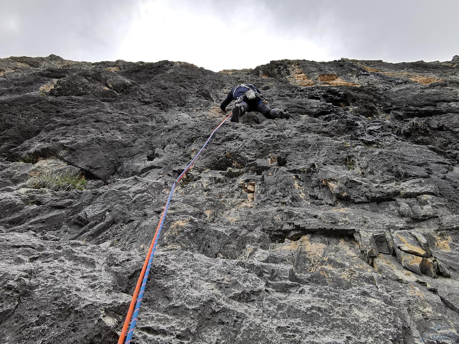 Pod ścianę podchodzimy od prawej strony – tym wariantem pod Pierwszy Filar jest trochę bliżej niż w przypadku podejścia lewą stroną i trawersowania pod drugim, Pilastro di Rozes. Bez problemu odnajdujemy rampę startową, szpeimy się i niespiesznie startujemy – dziś z powodu zimna i wymagającej asekuracji oraz dość ciągowych trudności prowadzenie przypada w całości mi. Przed rozpoczęciem wspinania ucinamy sobie jeszcze pogawędkę z włoskim zespołem zmierzającym pod łatwiejszego (V+) klasyka na tej samej ścianie – drogę Alverà-Pompanin (nazywaną również jak sam filar - Primo Spigolo). Po południu spotkamy się z chłopakami ponownie w górnej części ściany – nasza droga dwa ostatnie wyciągi prowadzi bowiem wspomnianą linią. Przy okazji, jeżeli kogoś interesują wyłącznie trudności Aspettando lub jeżeli jest taka konieczność – po 6 wyciągach (uwaga 300 metrów!) można wrócić zjazdami pod ścianę, odpuszczając cztery ostatnie wyciągi. Warto jednak przejść całą ścianę - na górze czeka jeszcze sporo ciekawego wspinania. Uwaga druga - w opisie poniżej podaję orientacyjne wyceny poszczególnych wyciągów ponieważ dostępne materiały są mocno rozbieżne, do tego na wielu płytowych odcinkach można nieświadomie wybierać warianty różniące się trudnościami o pół/jeden stopień.