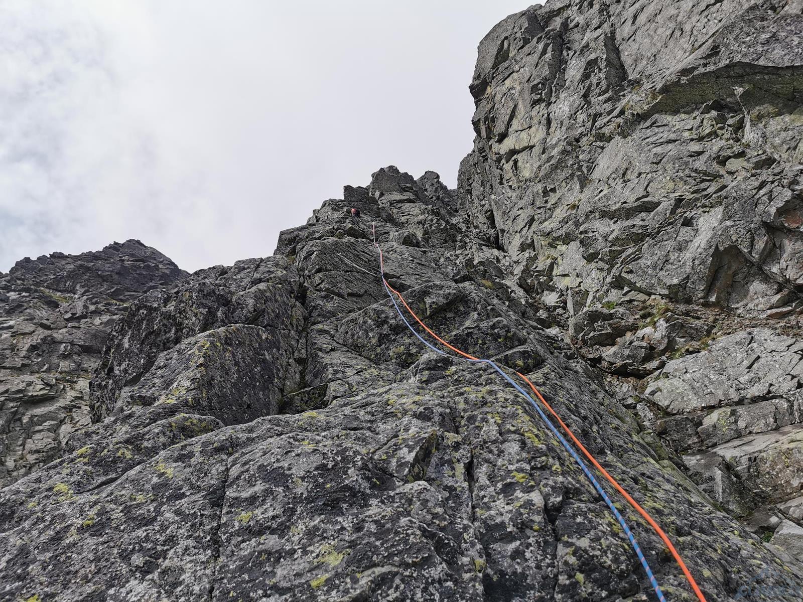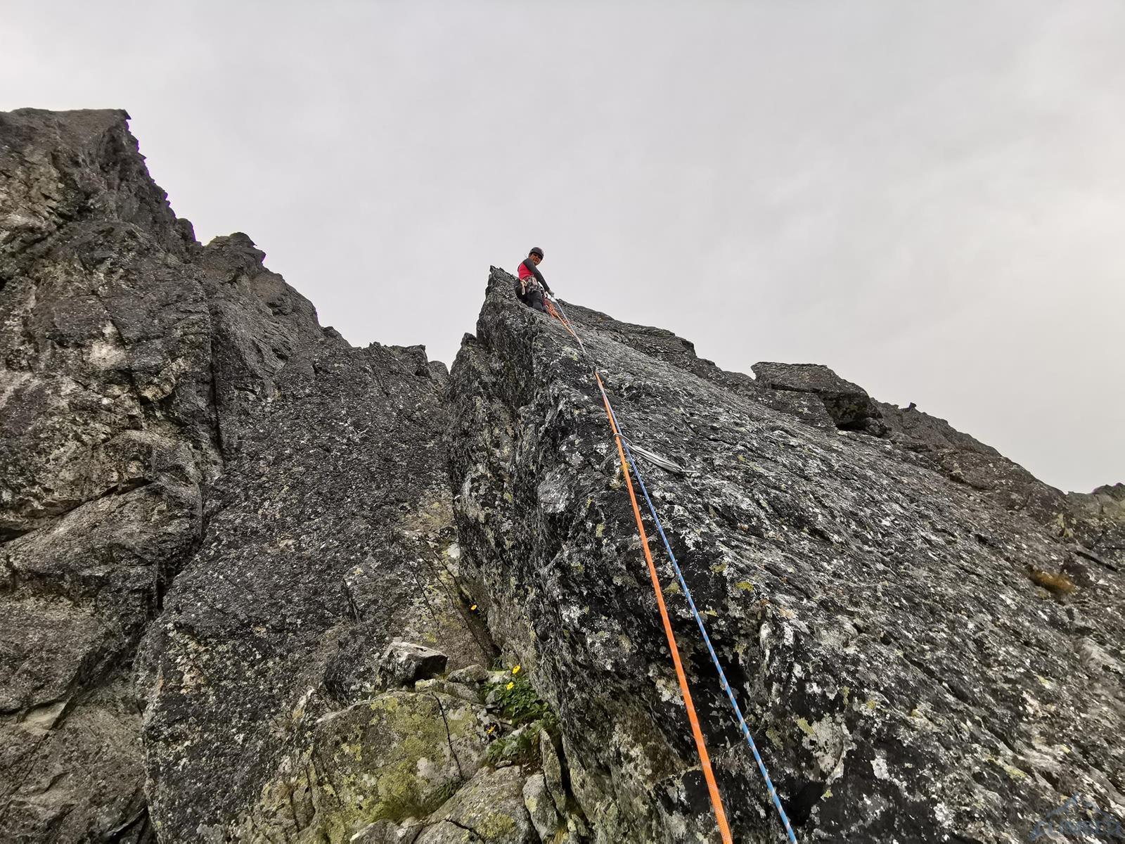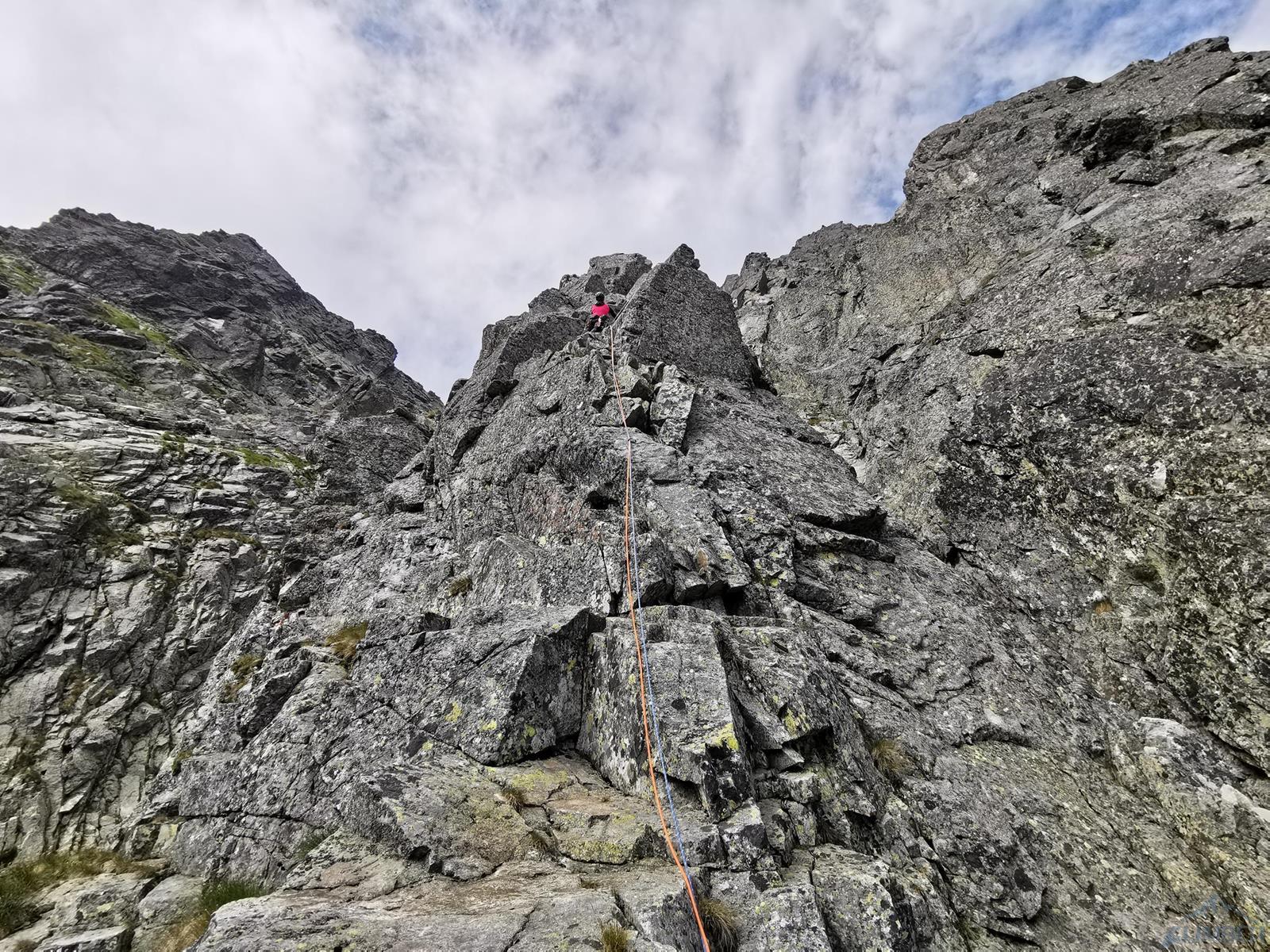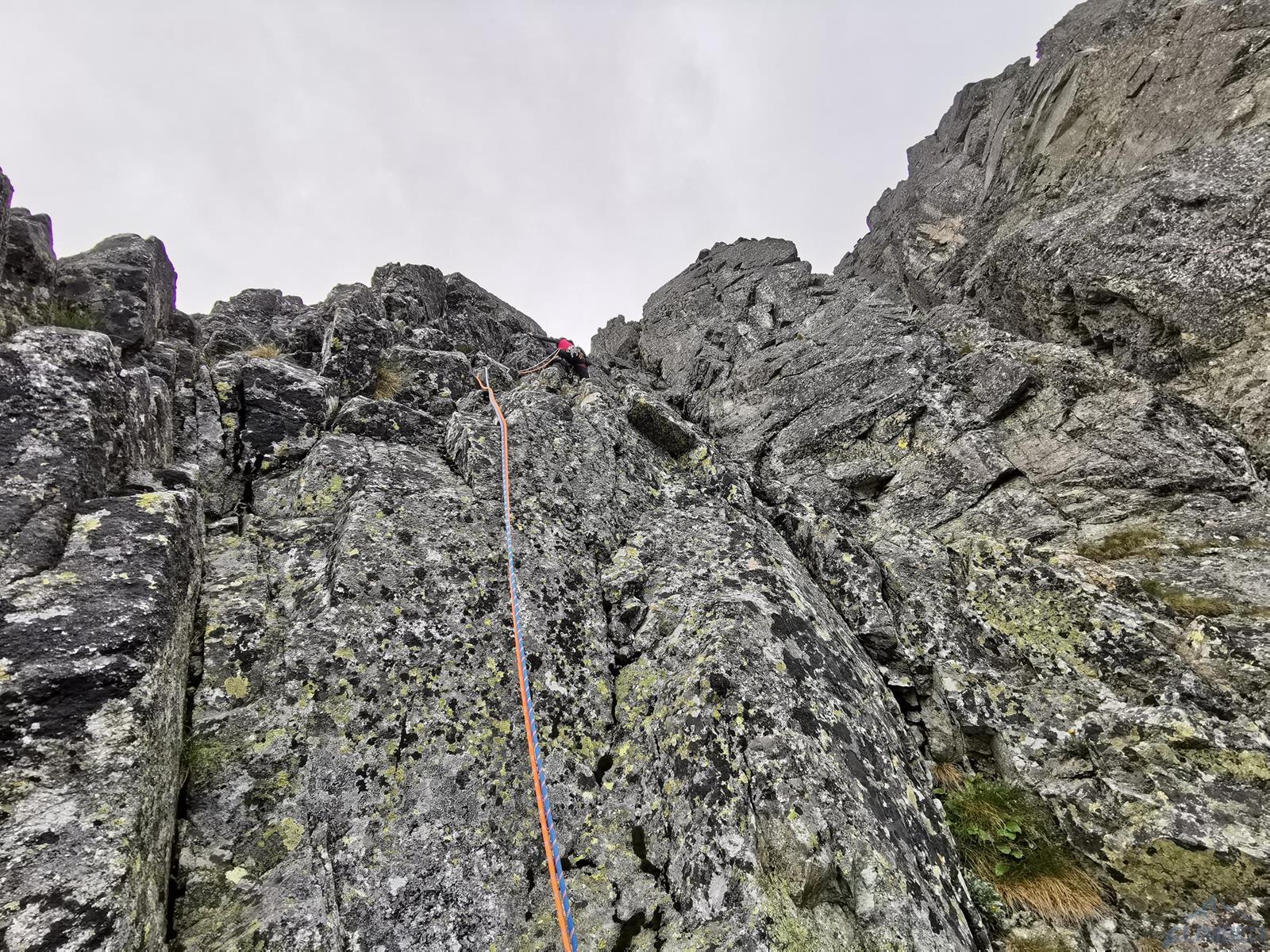 Sobotni poranek na obozie w Zbójnickiej Chacie wita nas gęstymi chmurami. Padać zacząć może w każdej chwili, wybieramy więc nieodległą, łatwą (V), prawie w całości obitą i wyposażoną w stanowiska zjazdowe drogę na Jaworowym Szczycie – Filar Kellego (znaną również jako Żebro Kelle-Šuna). Pod ścianą dopada nas deszcz i zaliczamy odwrót, późnym popołudniem jednak wracamy – tym razem zabierając ze sobą kolegę. Drogę robiłem już kilka lat wcześniej (RELACJA), nadaje się ona świetnie na szybką akcję - również w niepewną pogodę i tuż po deszczu. Tym razem - w sam raz na wypełnienie czasu pomiędzy obiadem i kolacją w schronisku 😊.