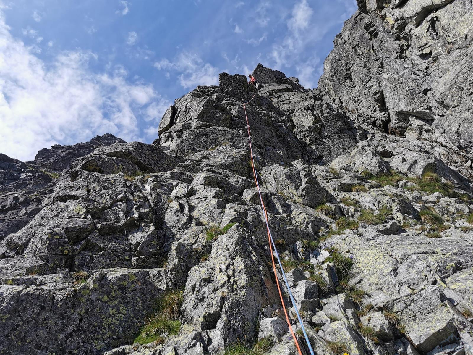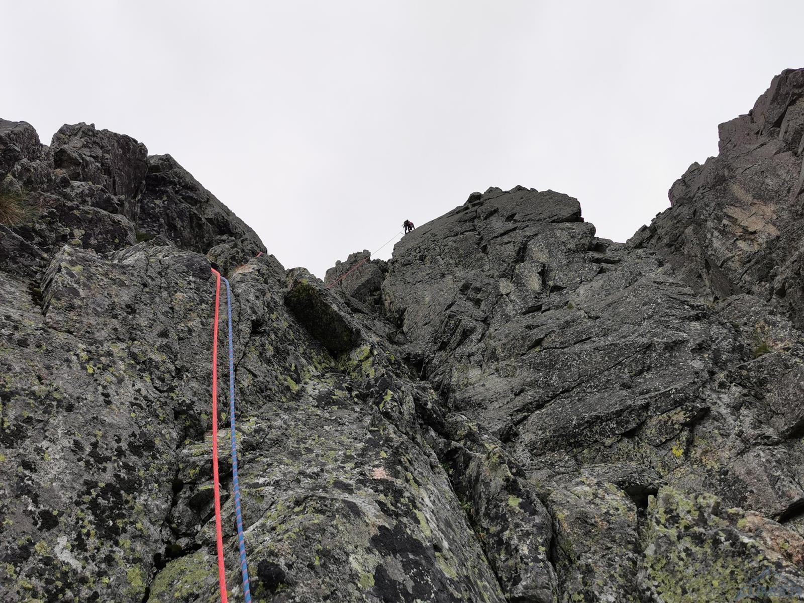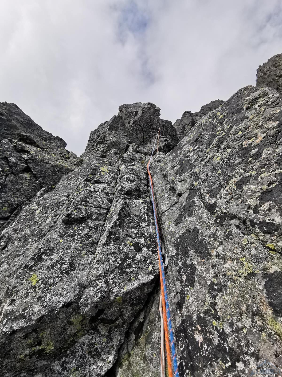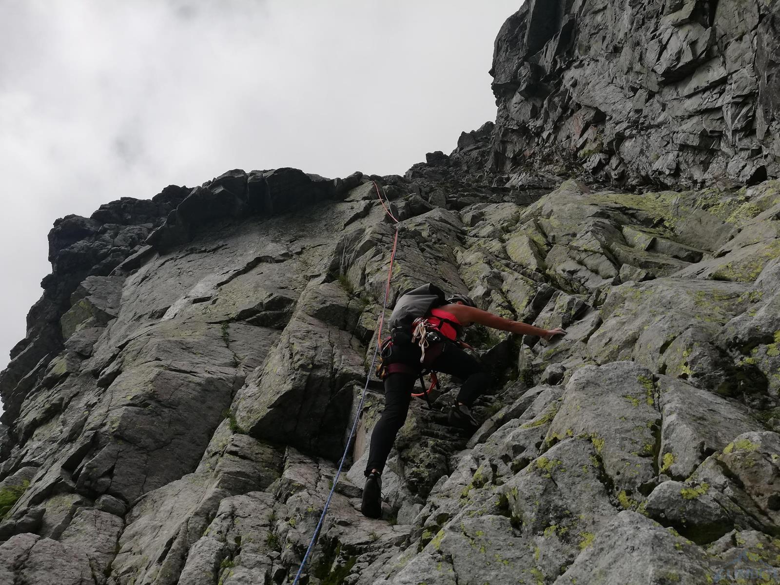 Sobotni poranek na obozie w Zbójnickiej Chacie wita nas gęstymi chmurami. Padać zacząć może w każdej chwili, wybieramy więc nieodległą, łatwą (V), prawie w całości obitą i wyposażoną w stanowiska zjazdowe drogę na Jaworowym Szczycie – Filar Kellego (znaną również jako Żebro Kelle-Šuna). Pod ścianą dopada nas deszcz i zaliczamy odwrót, późnym popołudniem jednak wracamy – tym razem zabierając ze sobą kolegę. Drogę robiłem już kilka lat wcześniej (RELACJA), nadaje się ona świetnie na szybką akcję - również w niepewną pogodę i tuż po deszczu. Tym razem - w sam raz na wypełnienie czasu pomiędzy obiadem i kolacją w schronisku 😊.