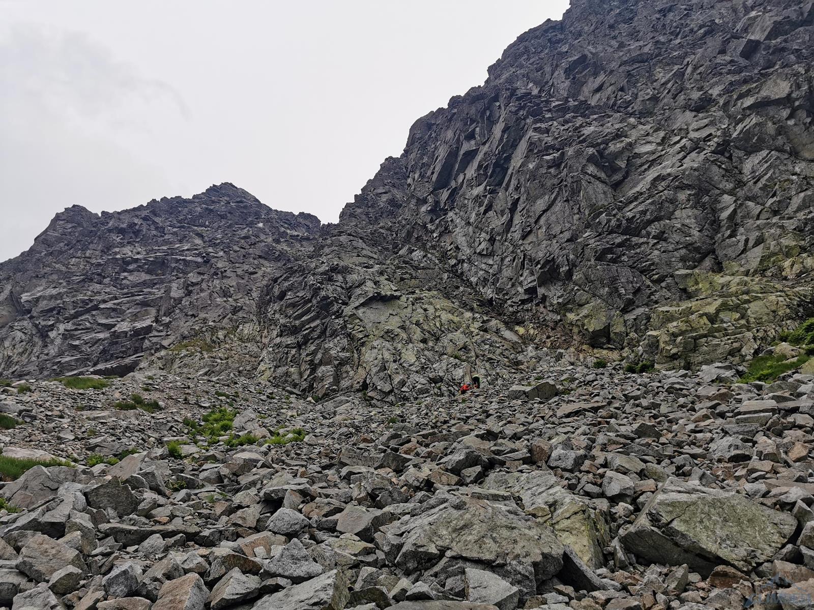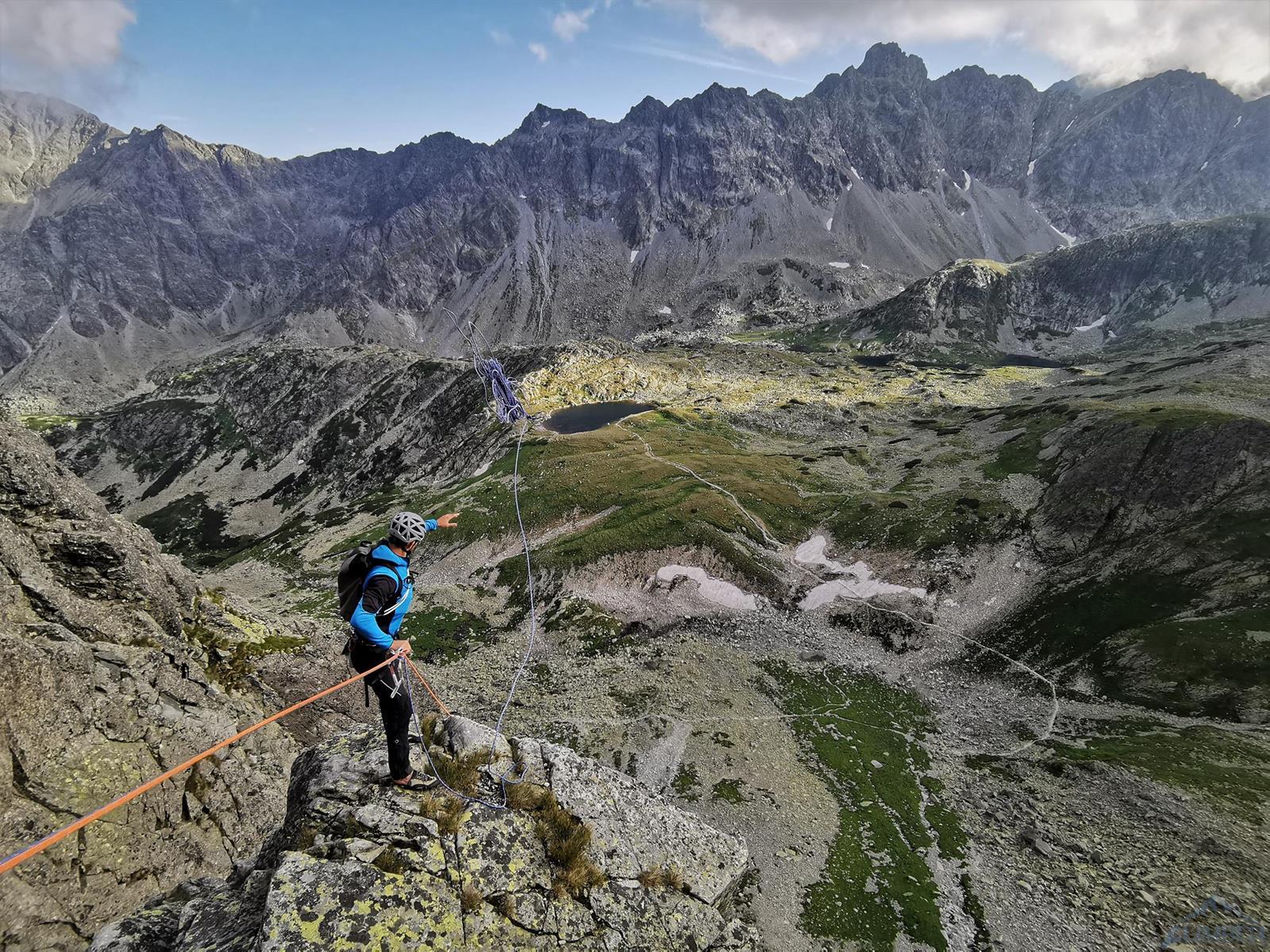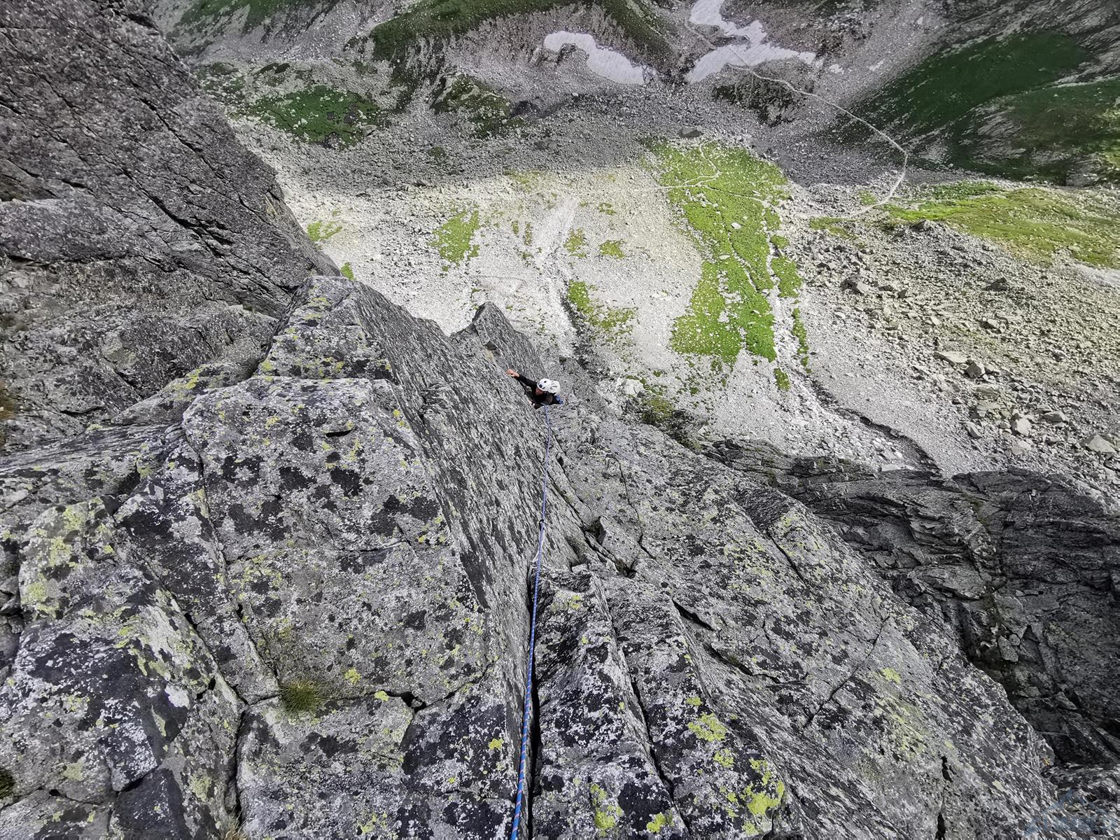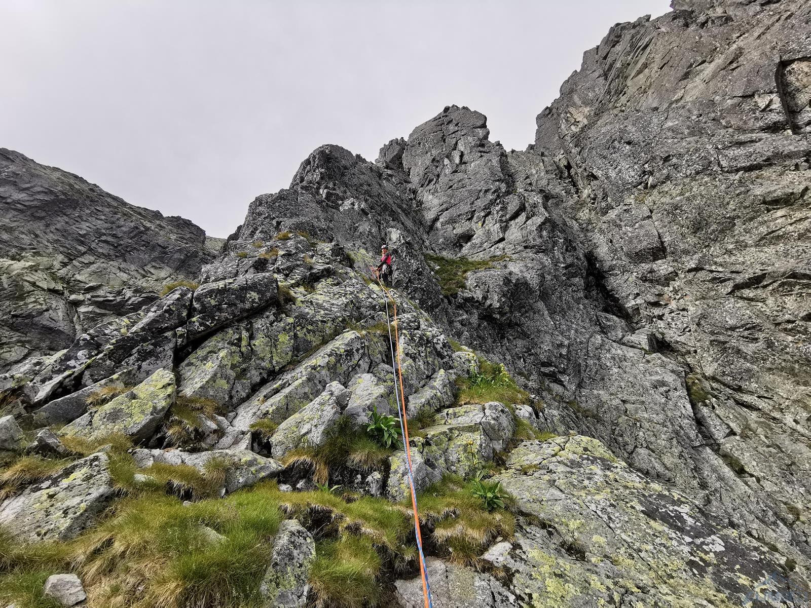 Sobotni poranek na obozie w Zbójnickiej Chacie wita nas gęstymi chmurami. Padać zacząć może w każdej chwili, wybieramy więc nieodległą, łatwą (V), prawie w całości obitą i wyposażoną w stanowiska zjazdowe drogę na Jaworowym Szczycie – Filar Kellego (znaną również jako Żebro Kelle-Šuna). Pod ścianą dopada nas deszcz i zaliczamy odwrót, późnym popołudniem jednak wracamy – tym razem zabierając ze sobą kolegę. Drogę robiłem już kilka lat wcześniej (RELACJA), nadaje się ona świetnie na szybką akcję - również w niepewną pogodę i tuż po deszczu. Tym razem - w sam raz na wypełnienie czasu pomiędzy obiadem i kolacją w schronisku 😊.