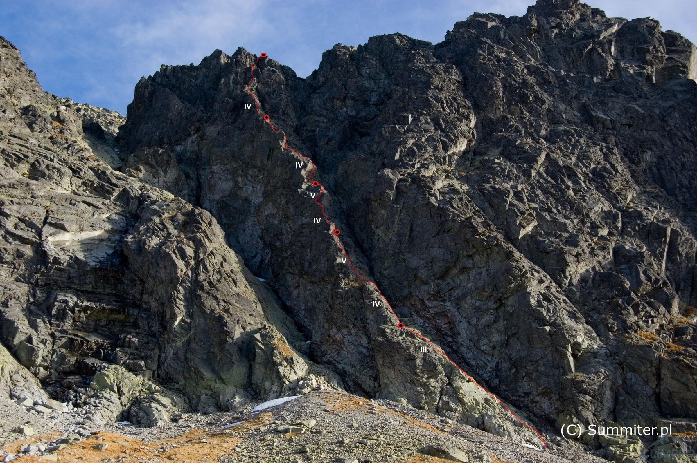 Pierwszy wyciąg (III) prowadzi wymytymi zielonymi płytami – startujemy wprost do ringa lub trochę łatwiej, po prawej stronie. Kierujemy się skośnie w lewo wypatrując kolejnych ringów i po ok. 50 metrach wychodzimy na siodełko w filarze – tam znajdziemy pierwsze stanowisko. Na drugim odcinku (50 m.) zaczyna się już ciekawsze wspinanie (IV/V) – do pokonania mamy dwie płyty po prawej stronie filara. Trzeci wyciąg (V, 50 m.) jest kluczowy, pierwszą turnicę mijamy zacięciem po lewej stronie, po czym kierujemy się w prawo na krótką przewieszoną ściankę kolejnego spiętrzenia w grani.