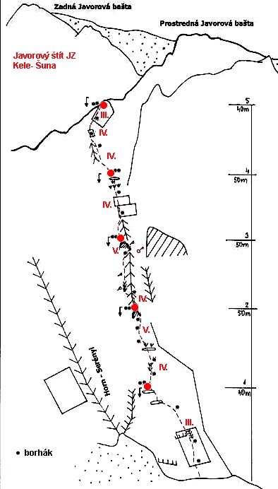 Czwarty odcinek to przyjemne (IV) wspinanie w połogich płytach, po przejściu których docieramy do łatwego terenu, nad którym czeka kolejny łańcuch. Ostatni wyciąg (IV, 50 m.) zaczyna się płytową ścianką i kończy efektownym wyjściem na kant ostatniej turni na żebrze. Ze stanowiska na kancie rozpoczynamy zjazdy (linią drogi) lub wychodzimy w łatwy teren i dalej na szczyt Jaworowego. My tym razem wybieramy pierwszą opcję, drugą przerabiałem podczas poprzedniego przejścia drogi - przy ładnej pogodzie warto rozważyć by stanąć na wierzchołku.