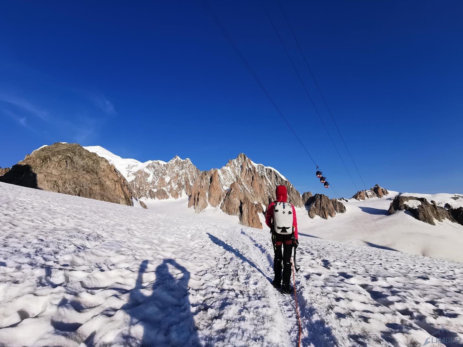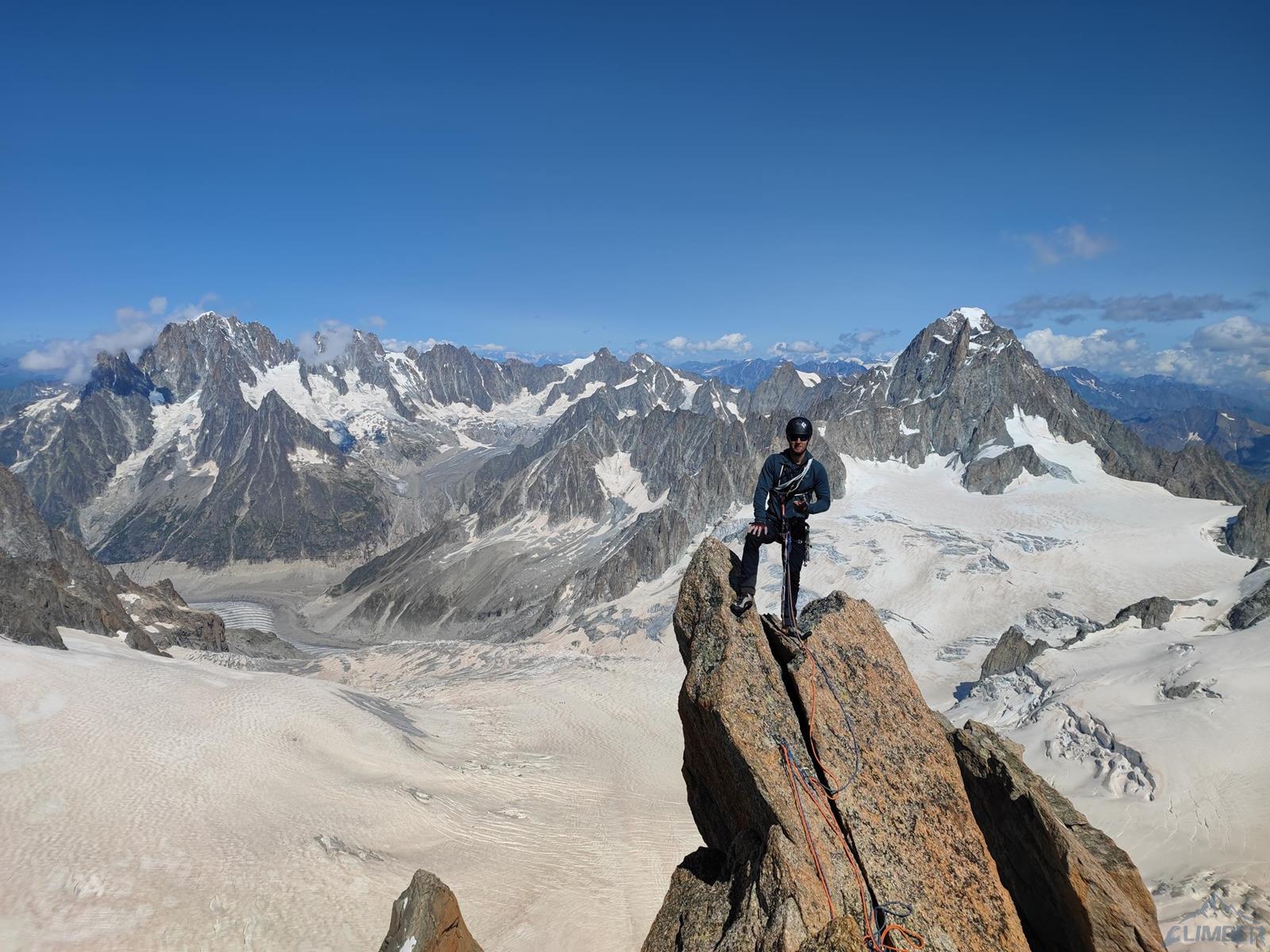 Robimy fotki na obu wierzchołkach słynnej turni, podziwiamy nieziemskie widoki i szykujemy się do zjazdów – do galerii dołączyłem ich rozmieszenie na zdjęciu z MB Granite, można też skorzystać z wspomnianego już opisu Maćka. Na szczęście powrót pod ścianę przebiega szybko i sprawnie – dodatkowo mamy okazję podziwiać piękne, trudne linie wzdłuż których zjeżdżamy. Bez problemu wyrabiamy się na kolejkę do Courmayeur, zjeżdżamy więc na dół i udajemy się na zasłużoną pizzę, po czym wracamy na camp. Przed nami pożegnalna noc na obozie, my kolejnego dnia nie wyjeżdżamy jednak z rejonu Mont Blanc – postanawiamy przenieść się na małą dogrywkę do Chamonix 😉.
